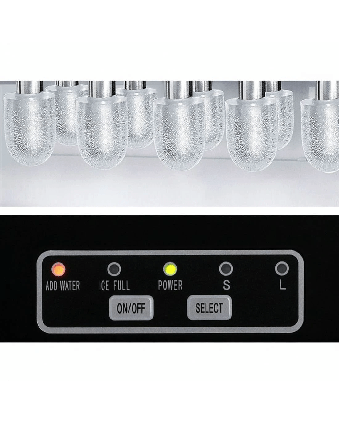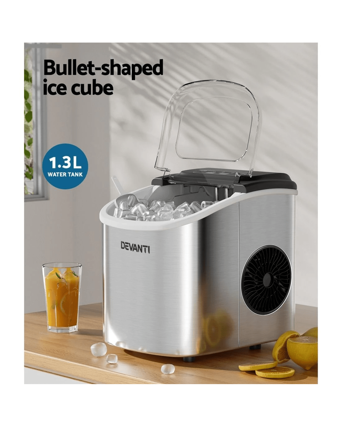 Looking for ice in a hurry? Meet our Devanti Ice Maker! Quickly produce 9 ice cubes in 6-13 minutes, with the flexibility to choose from 2 sizes. It's loaded with smart features like water shortage and ice full alarms, plus energy-saving technology through Freon-free refrigerant and enhanced heat dissipation. Its sleek, compact design fits anywhere, and with its easy-to-use controls, you'll be enjoying cold beverages in no time. Ice at home has never been cooler!