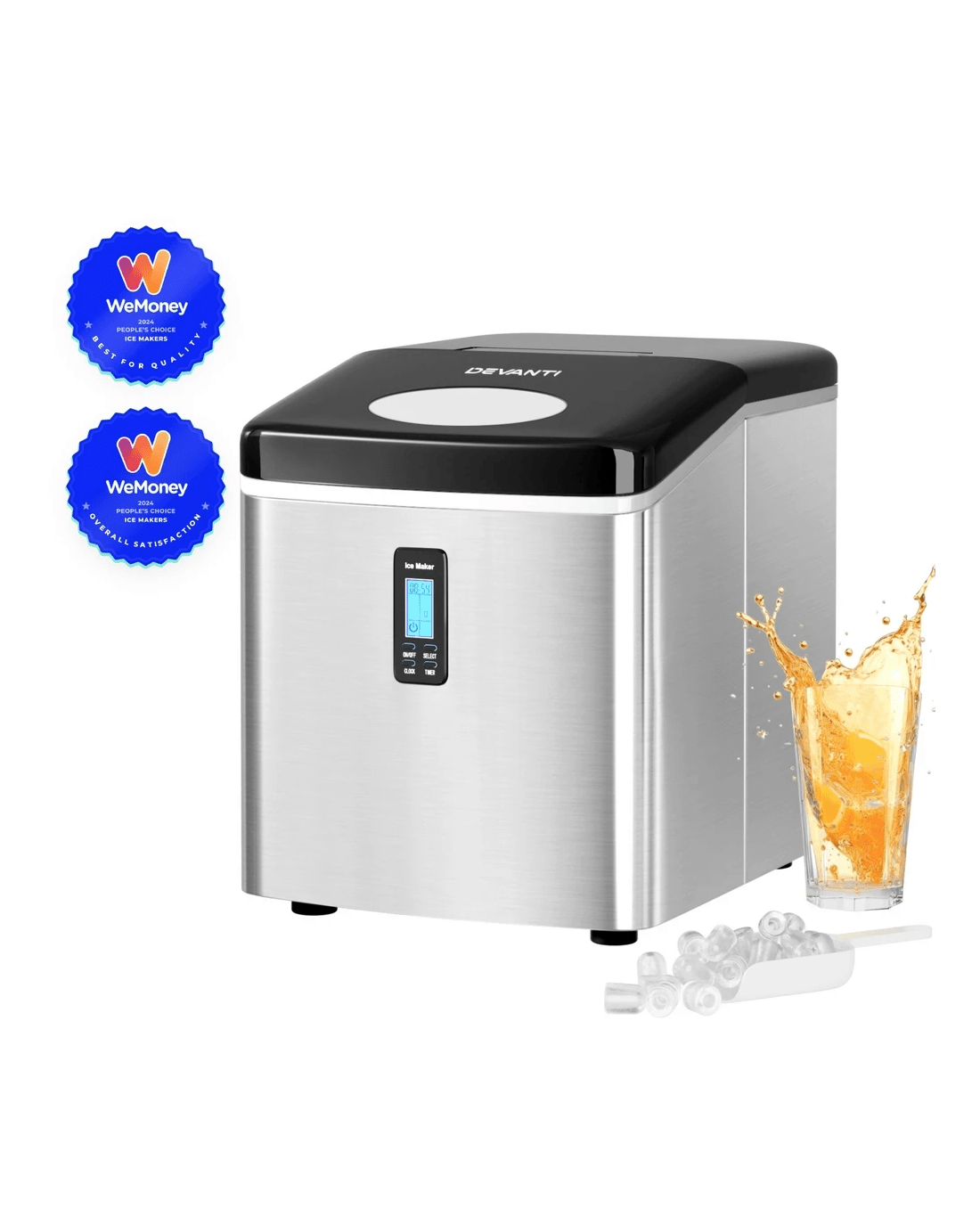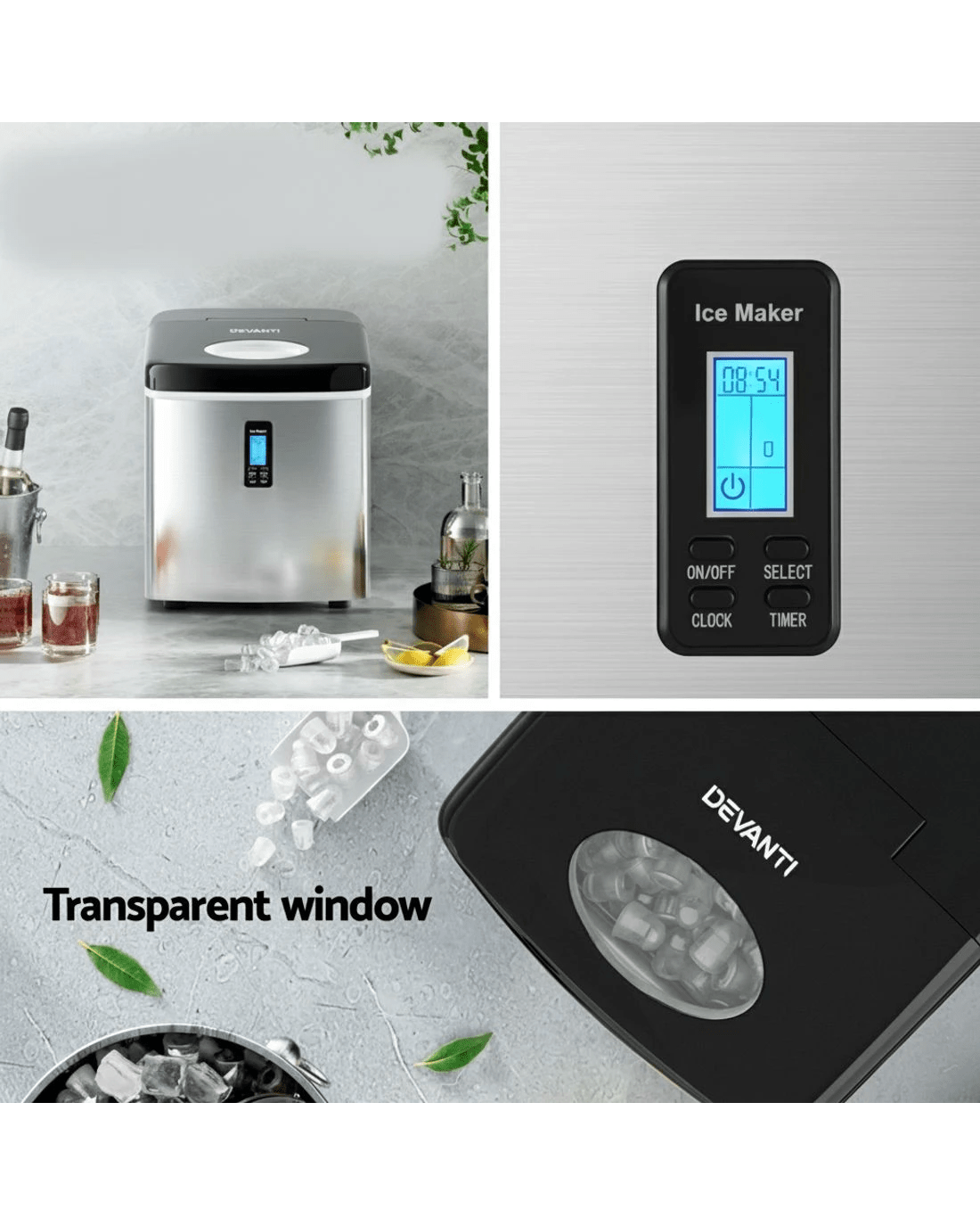 Looking for ice in a hurry? Meet our Devanti Ice Maker! Quickly produce 9 ice cubes in 6-13 minutes, with the flexibility to choose from 3 sizes. It's loaded with smart features like water shortage and ice full alarms, plus energy-saving technology through Freon-free refrigerant and enhanced heat dissipation. Its sleek, compact design fits anywhere, and with its easy-to-use controls, you’ll be enjoying cold beverages in no time. Ice at home has never been cooler!