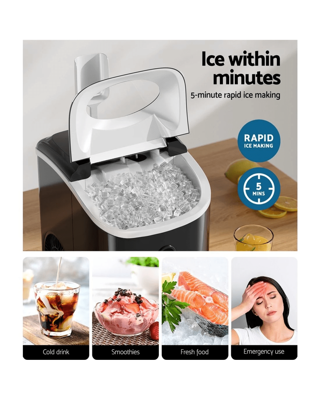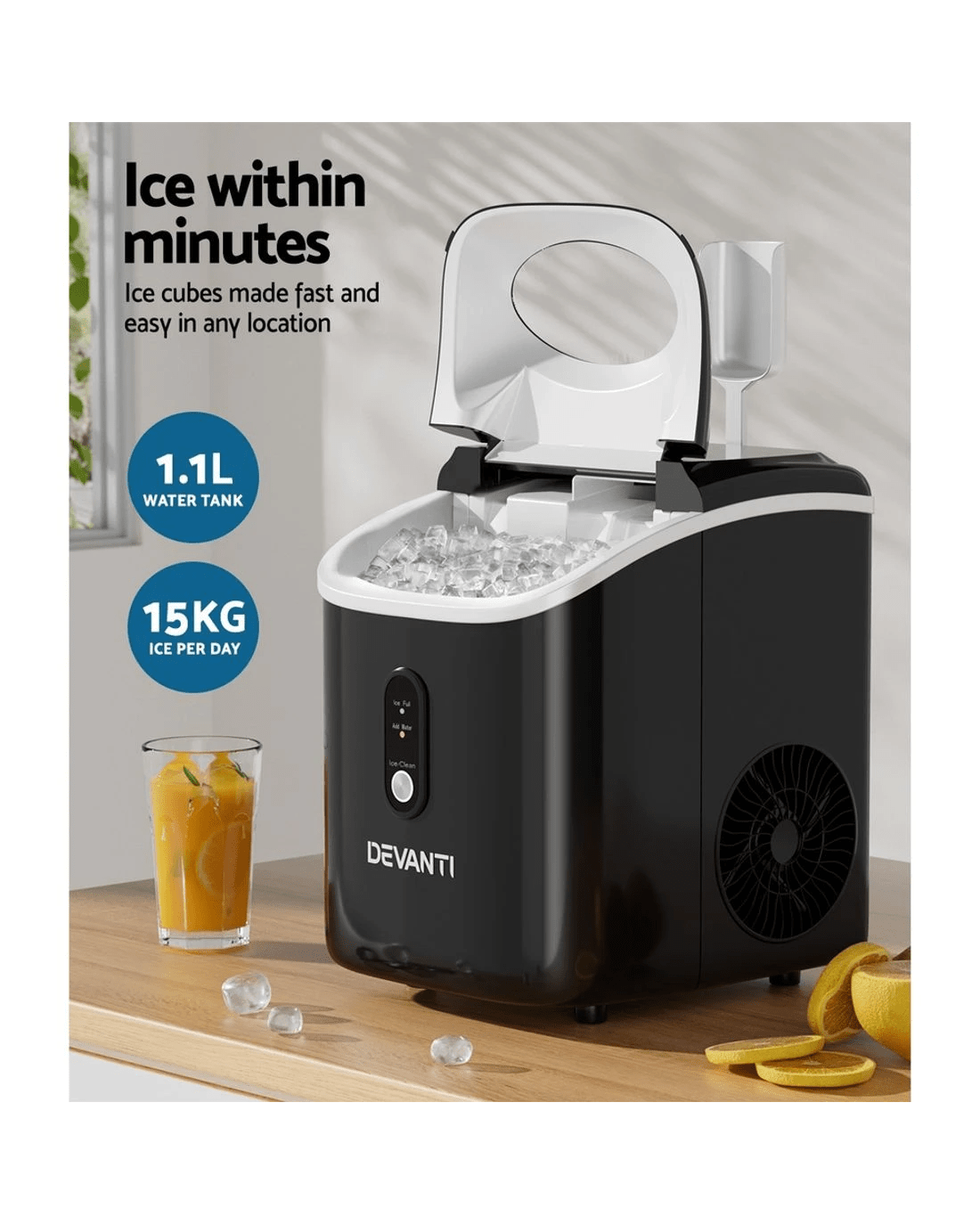 Looking for ice in a hurry? Meet our Devanti Ice Maker! Quickly produce ice cubes in 5-10 minutes. It's loaded with smart features like water shortage and ice full alarms, plus energy-saving technology through Freon-free refrigerant and enhanced heat dissipation. Its sleek, compact design fits anywhere, and with its easy-to-use controls, you’ll be enjoying cold beverages in no time. Ice at home has never been cooler!