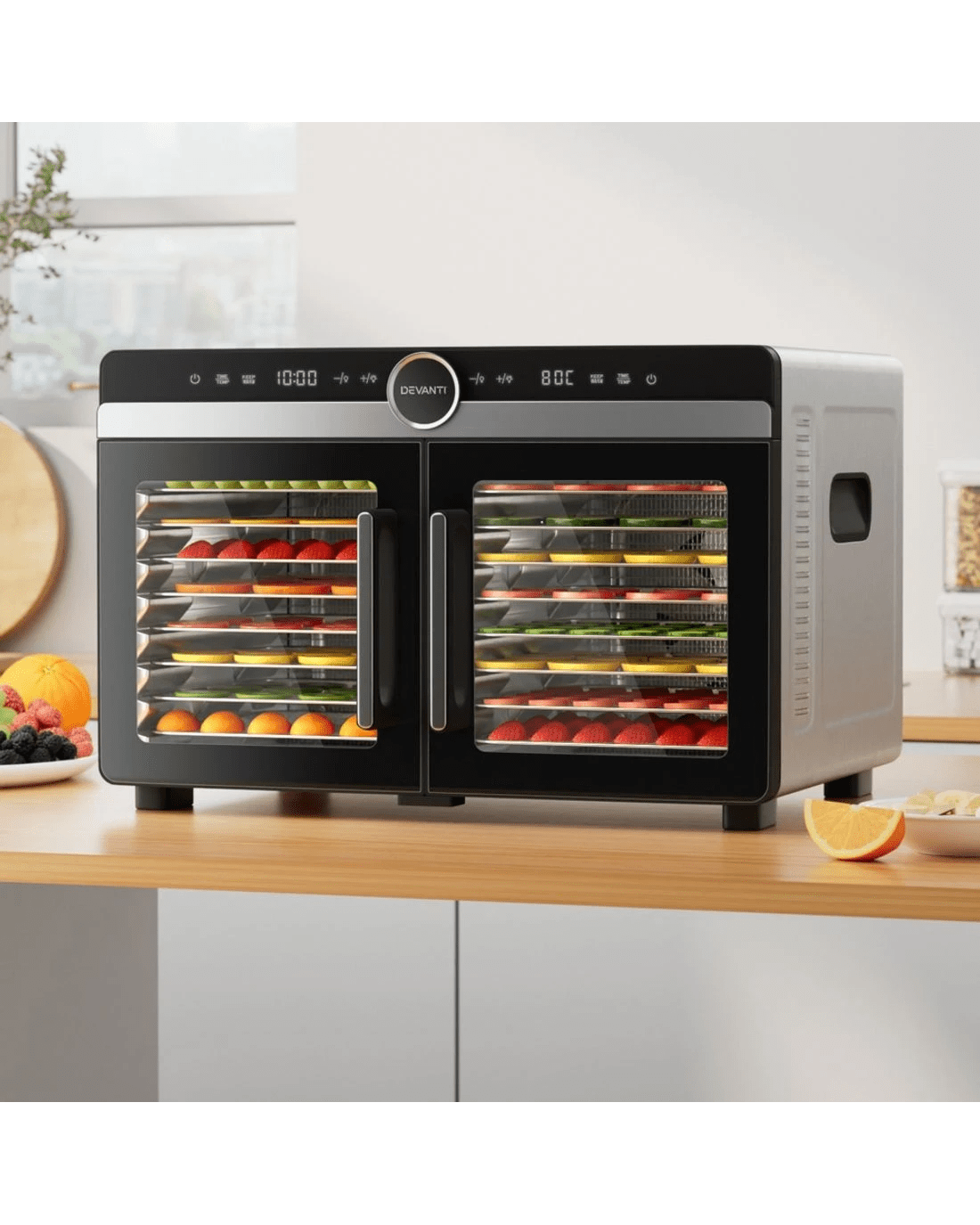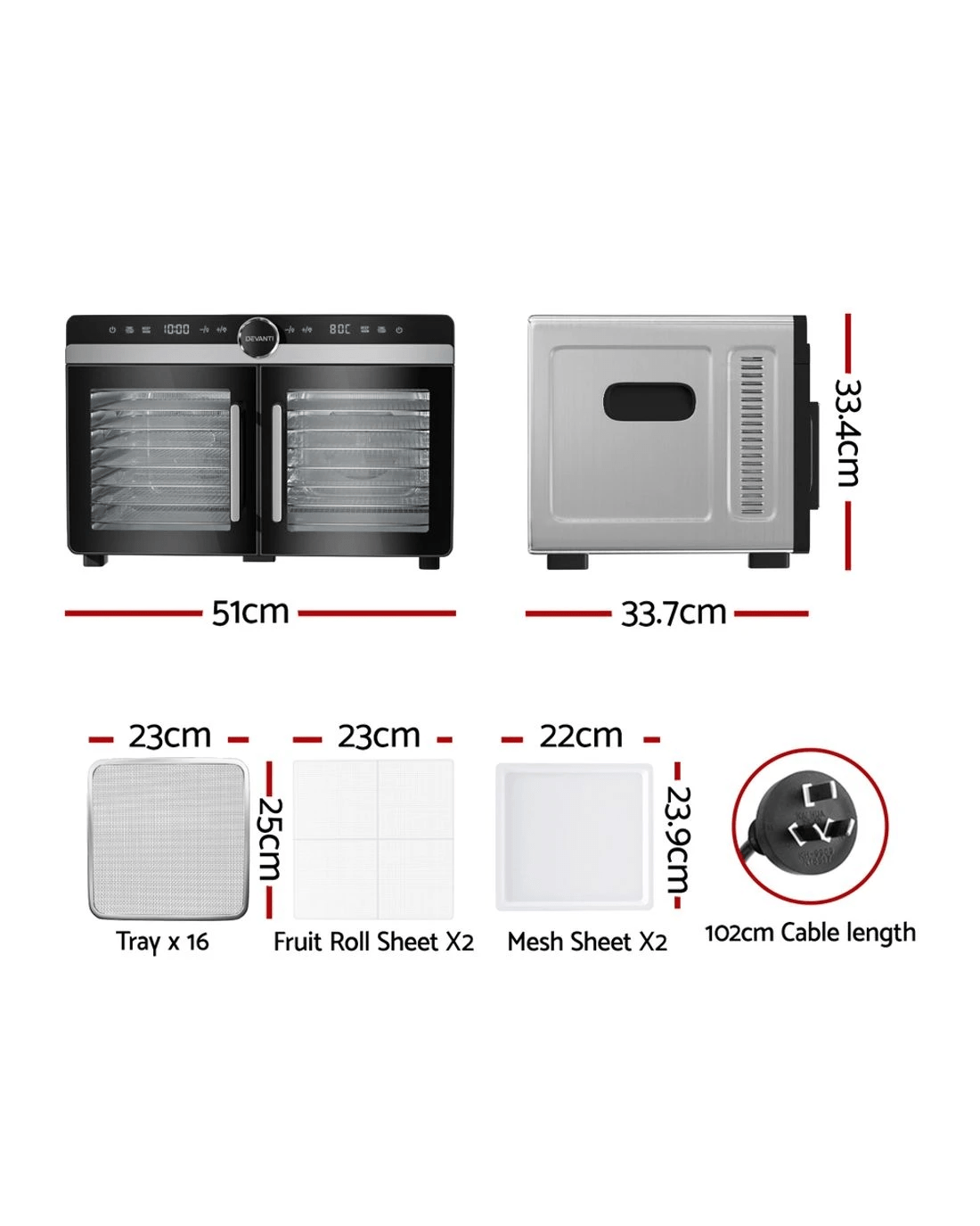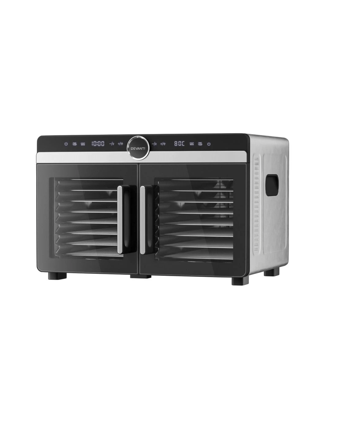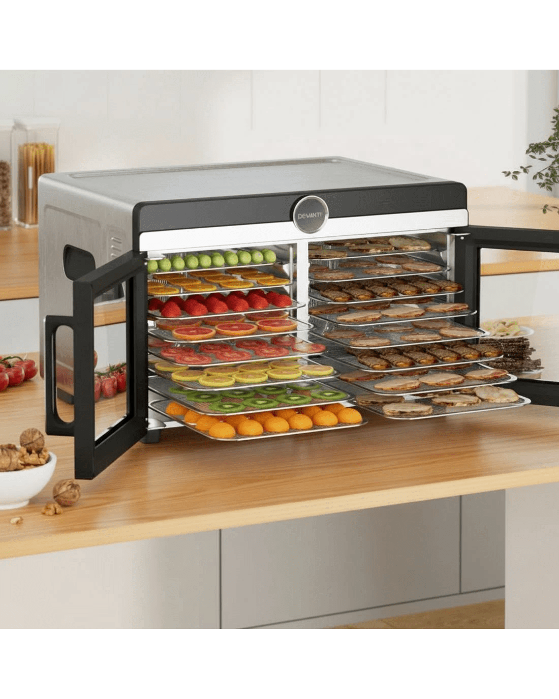 Unlock Professional-Grade Dehydration with Precision & Convenience! Devanti dual-zone large-capacity food dehydrator revolutionizes home drying with 16 food-grade stainless steel trays, offering ample space for fruits, vegetables, herbs, meats, and more. Equipped with an intuitive LED touch control panel, effortlessly adjust temperatures (35°C–80°C) and timers (0.5–48 hours) for customized dehydration. The transparent glass door and built-in lamp let you monitor progress without interrupting the process, while the stainless steel body ensures durability. Dual-zone technology allows simultaneous drying of different foods at separate temperatures, eliminating flavor transfer. Safety meets innovation with a heat-shielding vent, anti-slip feet, and an overheating protection system. Removable trays, included fruit roll sheets, and mesh trays simplify versatility and cleanup. Perfect for health enthusiasts and culinary pros!
