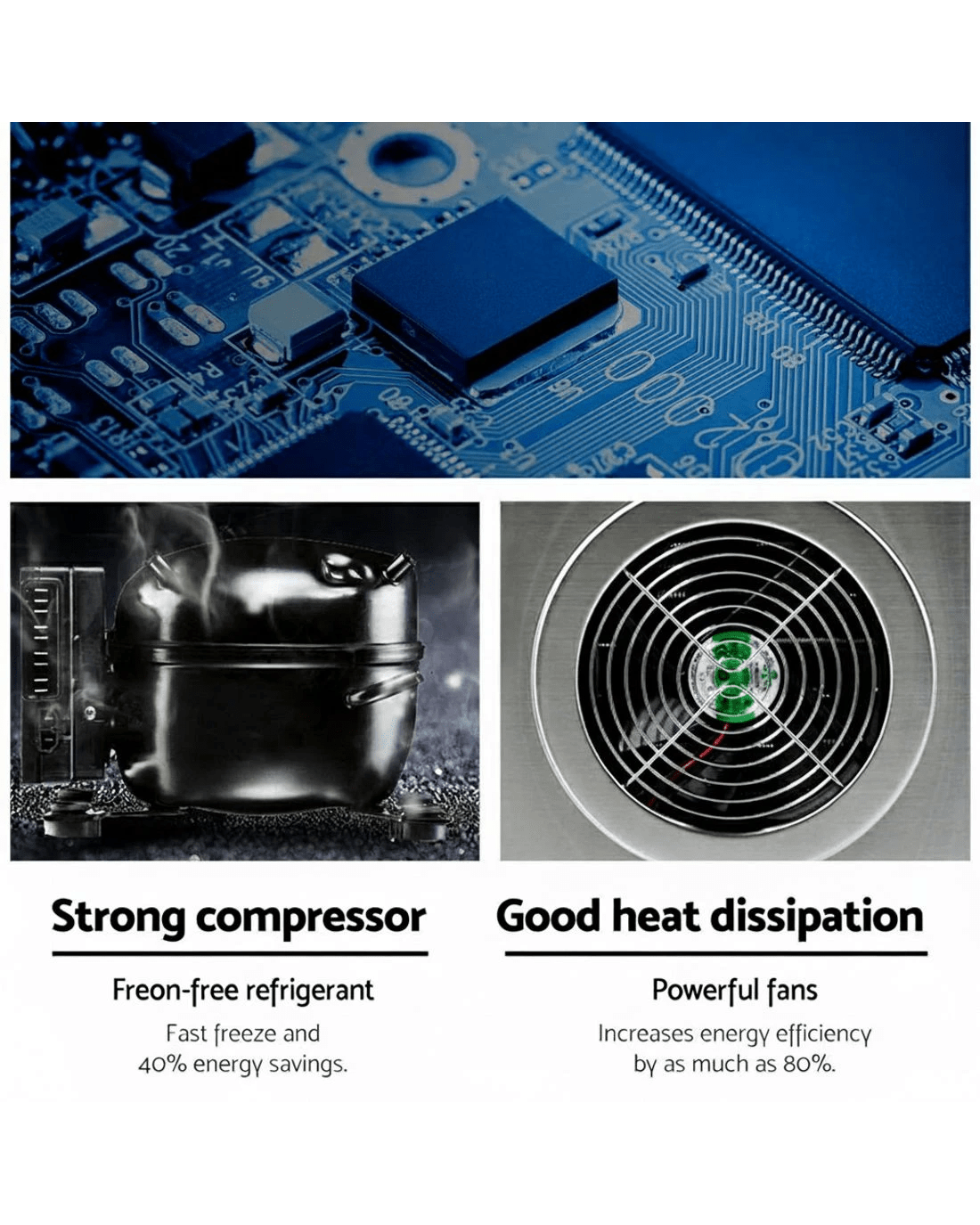 Freon-free refrigerant and enhanced heat dissipation enable low energy consumption