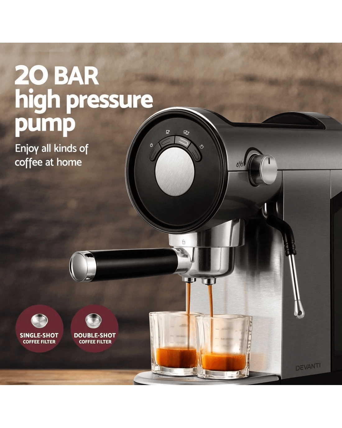 Devanti 20 Bar Coffee Machine Espresso Cafe Maker - Silver