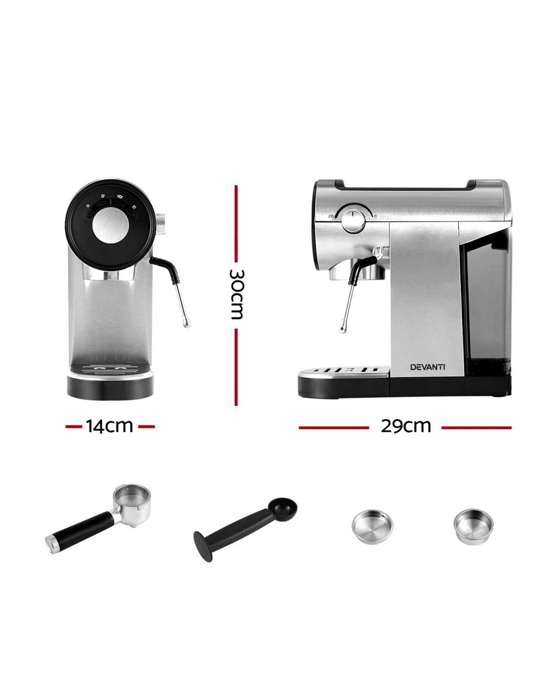 Get a head start on the day with your first cup of coffee from a Devanti Espresso Machine. Pour the perfect shot every time with easy-to-use controls, a powerful 20-bar pressure pump, and an instant heat system. The machine comes with single and double-shot coffee filters, a diecast aluminium portafilter and a dual coffee tamper/spoon – everything you need for a fresh cup. The convenient mug warmer keeps your cups at the perfect temperature as you froth your milk just the way you like it. Easily fill the machine from the removable water tank and clean it up with the removable drip tray. Its space-saving design means it won't take up your entire benchtop, giving you plenty of room for your other kitchen essentials. Relax and enjoy your favourite coffee from the comfort of your home with your very own Devanti Espresso Machine.