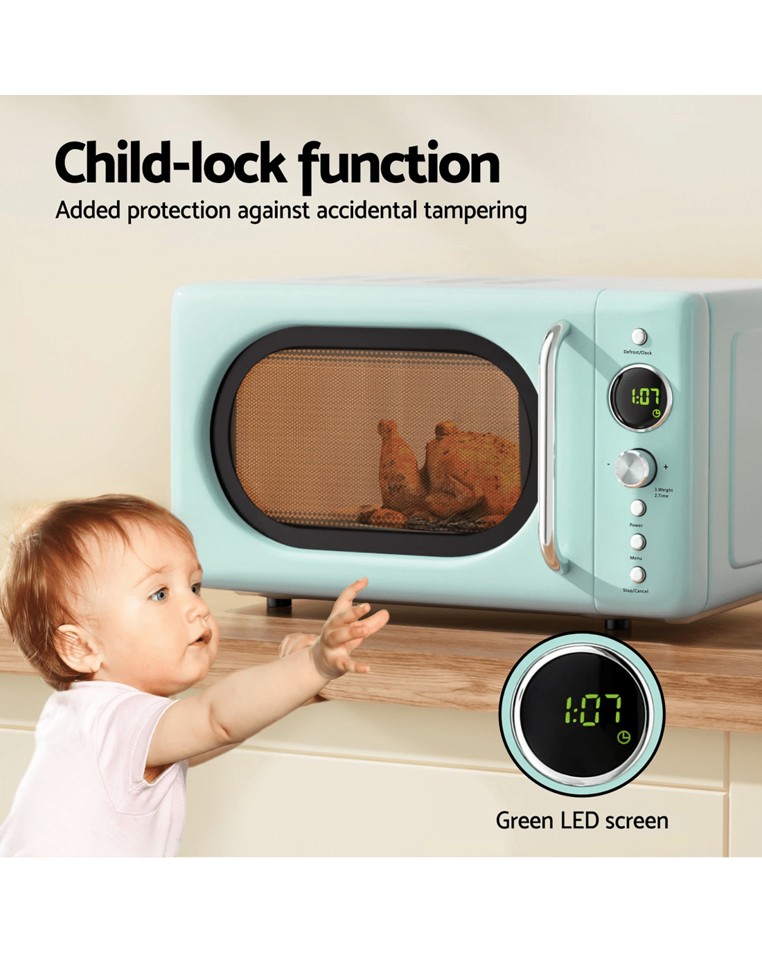 It also offers a quick defrost function, allowing you to defrost food by time or weight for ultimate convenience. Its green LED screen provides easy visibility, while the multi-stage cooking option ensures your food is cooked well. The pull door design allows for easy access, and the child-lock feature ensures safety in busy households. This microwave is a great addition to any kitchen.