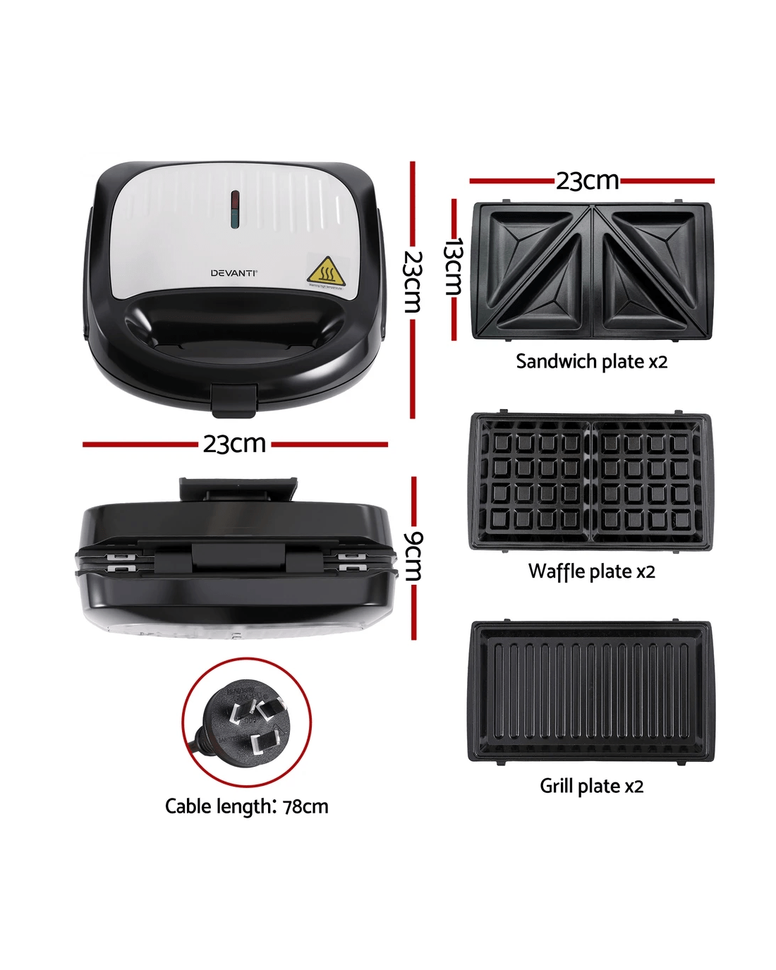 Devanti 3-in-1 Sandwich Press Waffle Maker Panini Press Grill - Black