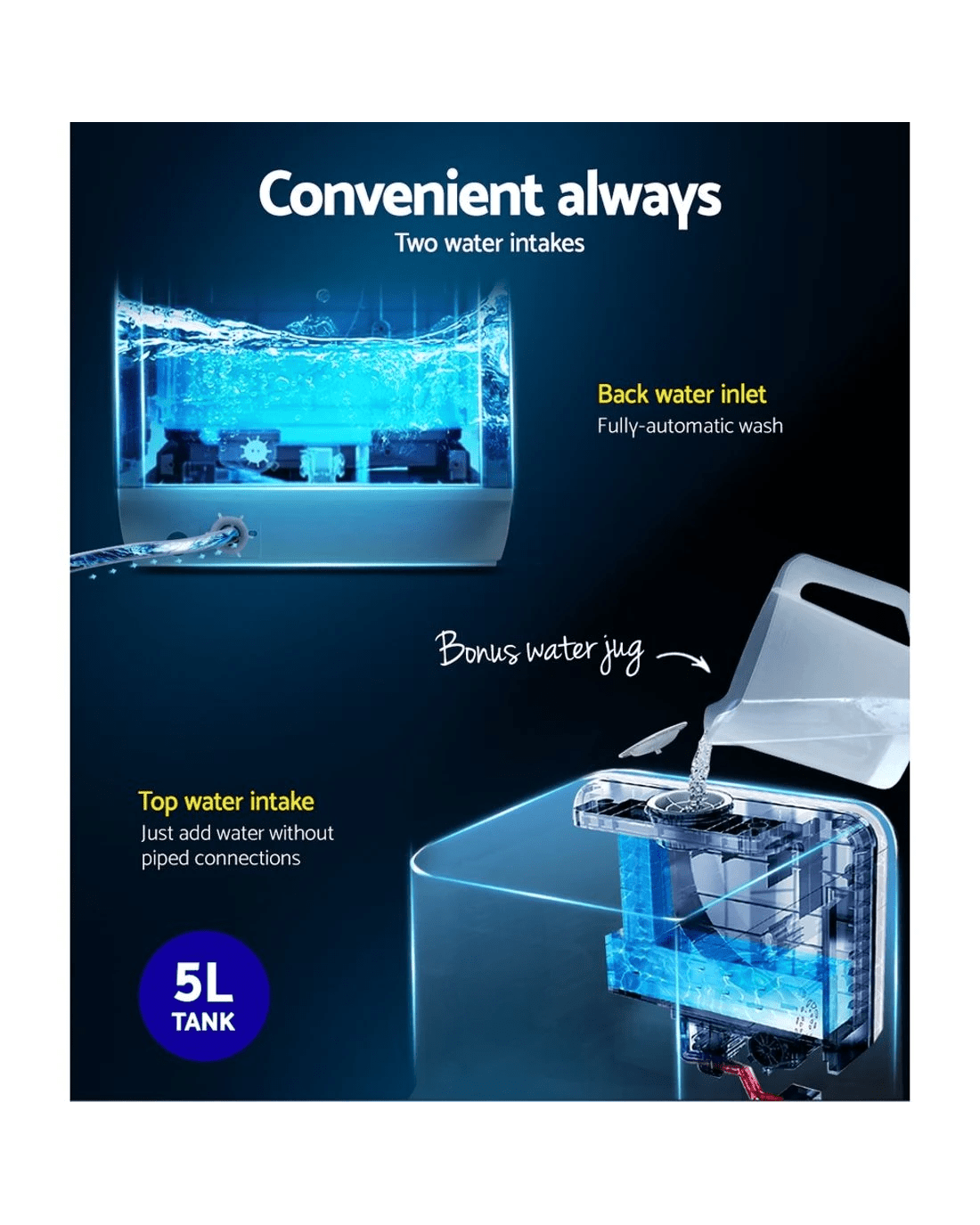 Insulated water tank - 5 litres water usage per full cleaning cycle