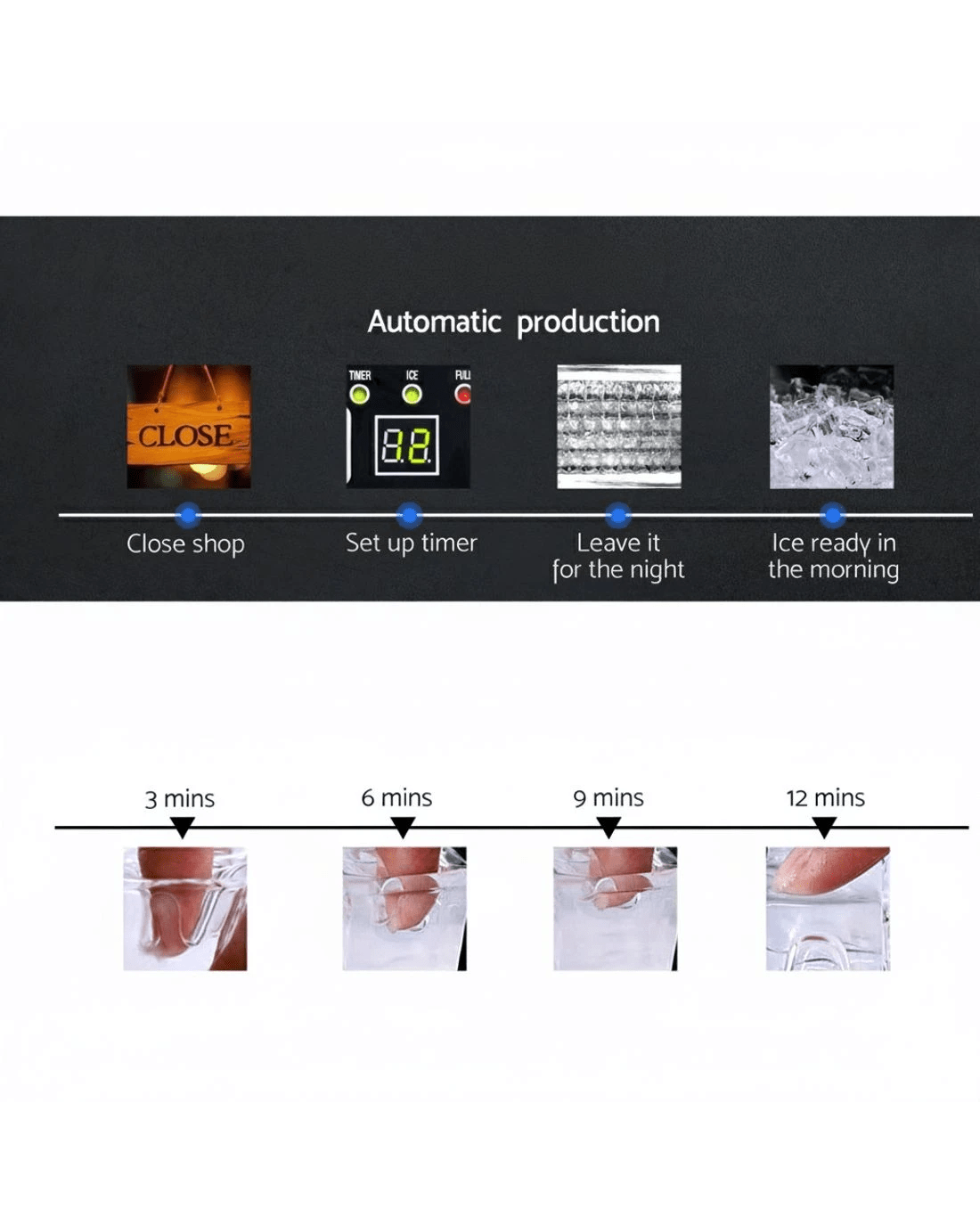 Ice-making cycle:11-20 minutes (Depended on water and ambient temperatures)