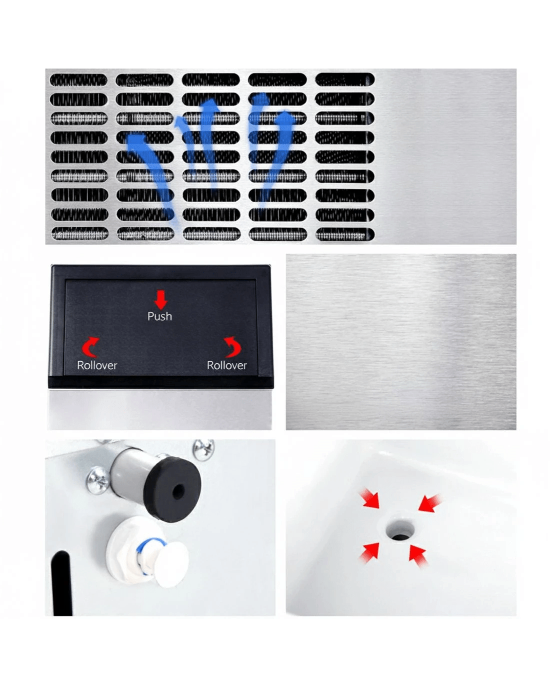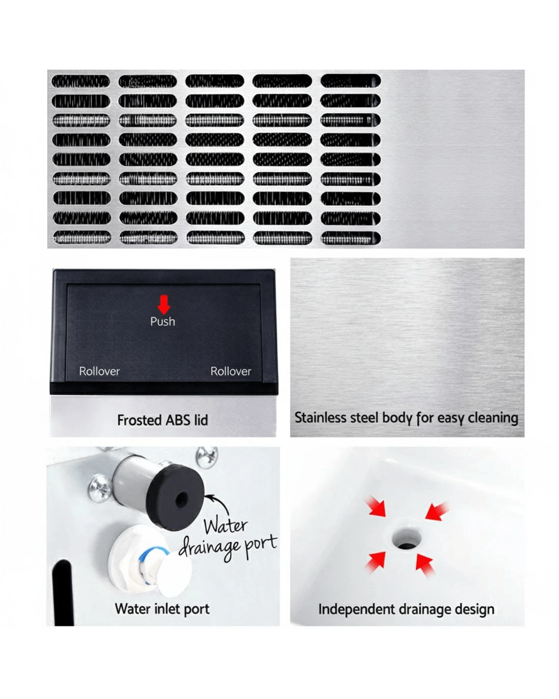 Ice scoop, water drainage hose and water inlet hose included