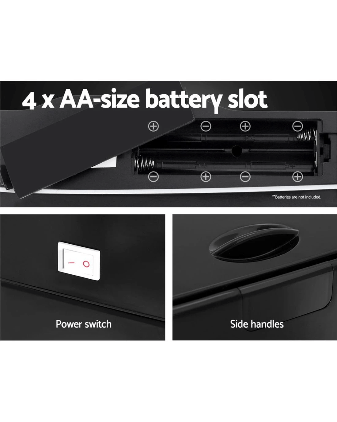 Powered by 4 AA batteries (not included)