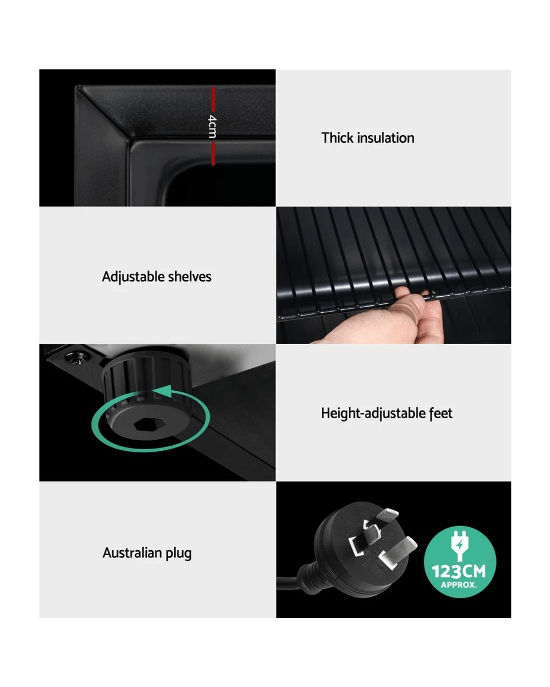 The portable Devanti Bar Fridge is great for keeping a variety of food and beverages chilled and cooled and without taking up too much space. Designed with five temperature settings, the energy-efficient bar fridge lets you set your desired coolness and freshness. Other great features include adjustable shelves, double-glazed door, height-adjustable feet, built-in handle, reversible door and consistent refrigeration to name a few. The compact bar fridge is also totally eco-friendly with its R600a freon-free refrigerant and well-made for robust use, such as the PVC door seal gasket, and extra thick insulation to ensure operation is smooth, quiet and hassle-free. Whether you use it as a secondary fridge or a mainstay, the Devanti bar fridge is a cool investment time and again.