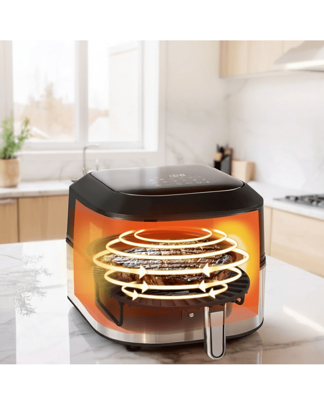 The Devanti Air Fryer brings versatility and ease to your kitchen with a 5.5-litre capacity and 10 preset cooking programs, perfect for creating deliciously crisp dishes with minimal effort. With 360-degree air circulation and an adjustable temperature range from 80 to 265 degrees centigrade, it delivers perfectly even cooking every time. The intuitive LCD display and touch panel make setting your cooking preferences easy, while the see-through window and built-in light let you monitor food without releasing heat.