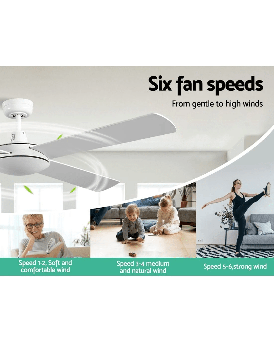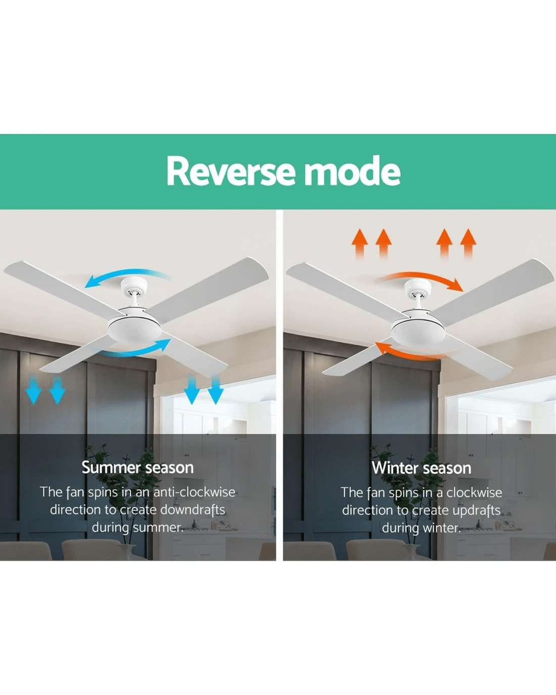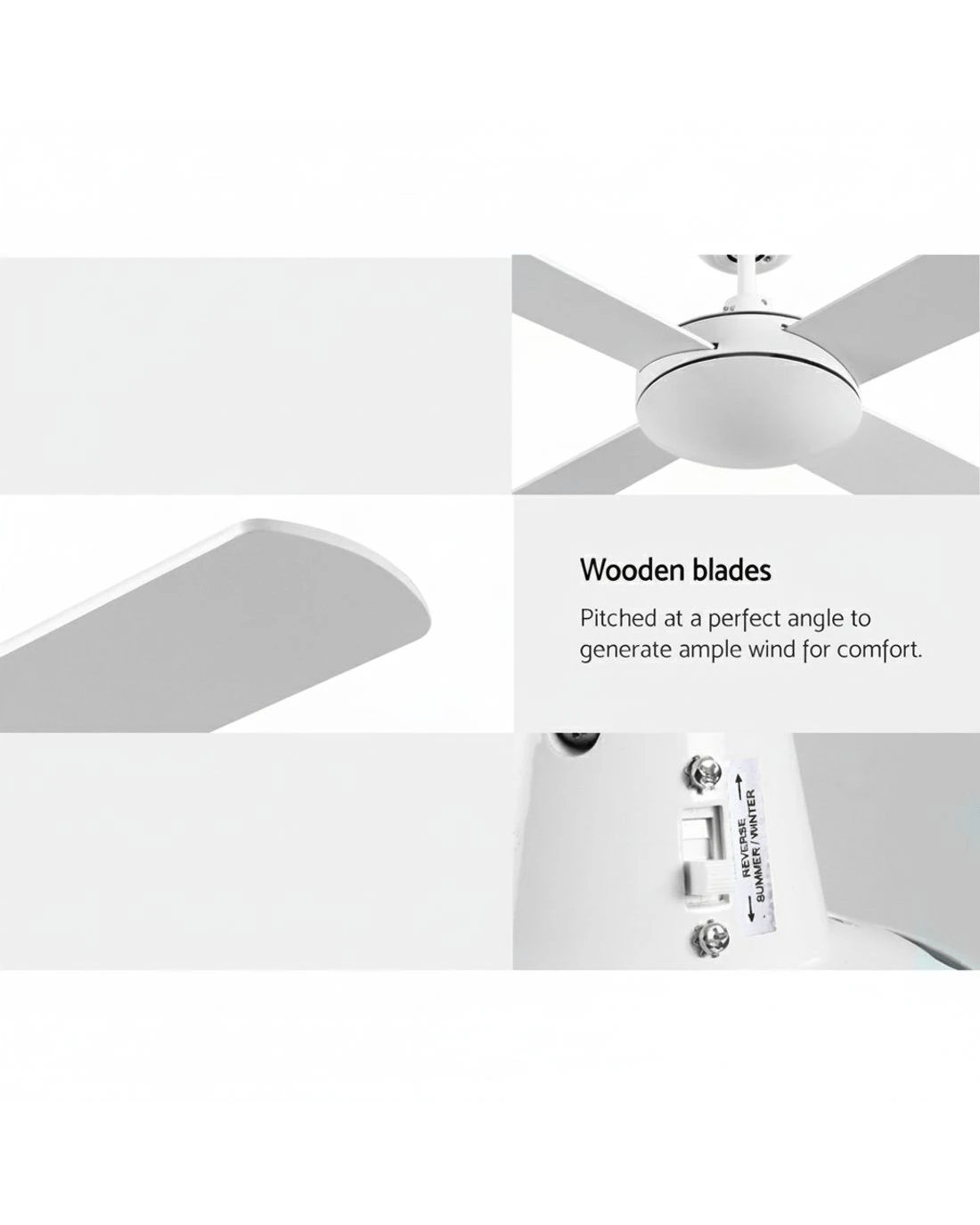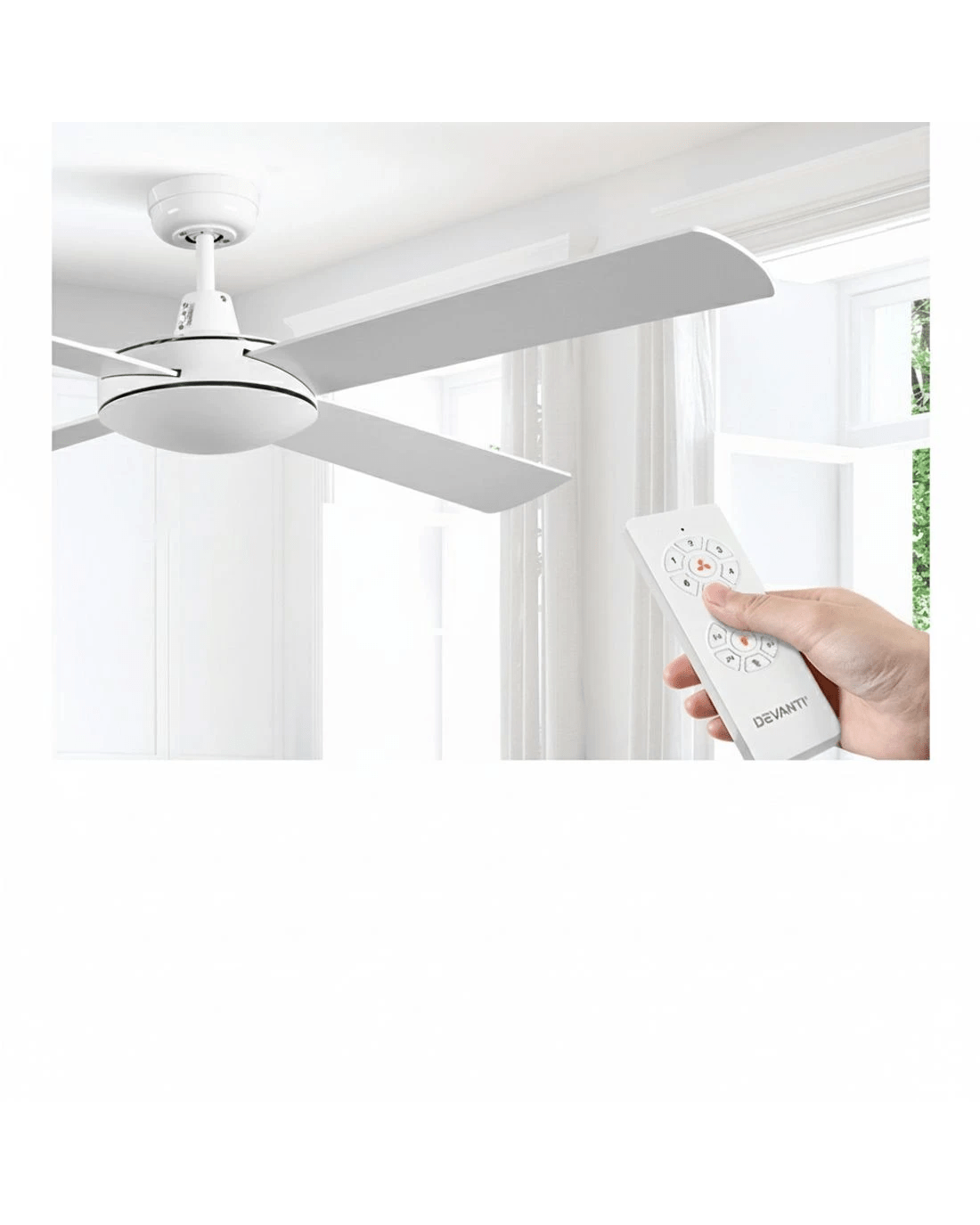 Gentle breezes, light drafts or high winds, the Devanti 52 inch Ceiling Fan is ever ready to meet your requirements easily. With six fan speeds, the contemporary-design ceiling fan also has a reverse cycle motor that can create downdrafts during summer or updrafts during winter for greater comfort. Its four high-quality wooden blades are pitched at an airflow-inducing 12 degree for more effective wind creation. Plus, its energy-efficient 35W motor operates ever so quietly. Better still, the fan can be set for up to 8 hours of timed operation and the handy remote control makes this fan a breeze to use from anywhere in the room. The ceiling fan comes with all the accessories for an easy installation including an extension rod. Available in black or white colour to match your decor easily.