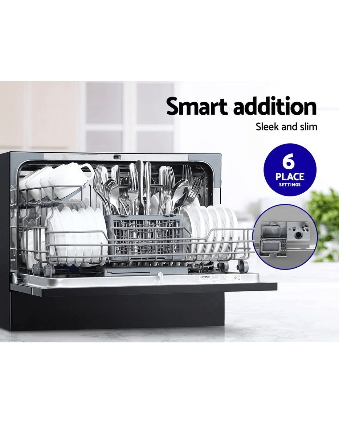 What can be more convenient than a conventional dishwasher? When it is a Devanti Benchtop Dishwasher of course! Convenient, space-saving and easy to install, our benchtop dishwasher can sit on any kitchen bench top to help you instantly with your dishwashing chores. Or it can also be configured as a built-in model. Whatever your choice, the dishwasher comes with most, if not all, of the attributes and features of a conventional dishwasher but without the hassle of creating a large space among your kitchen cabinet to have it. The quiet-operation benchtop dishwasher features six place settings and seven cleaning programs, from intensive to rapid, and a delay start function for that perfect wash. It is also equipped with great features such as baby care mode, residual heat air drying, omni-directional spray arm that is also removable, water sensor, and a threefold filter system that helps to remove both coarse and fine particles to name just a few. The easy-to-use push-button controls and LED screen display easily guides you along with clear setting indicators for effortlessly dishwashing. Not least, it comes with all the accessories to accommodate your various kitchen, dining and cooking wares and you can easily add in left-out dishes to the washing cycle.