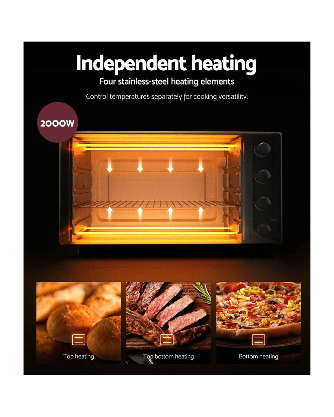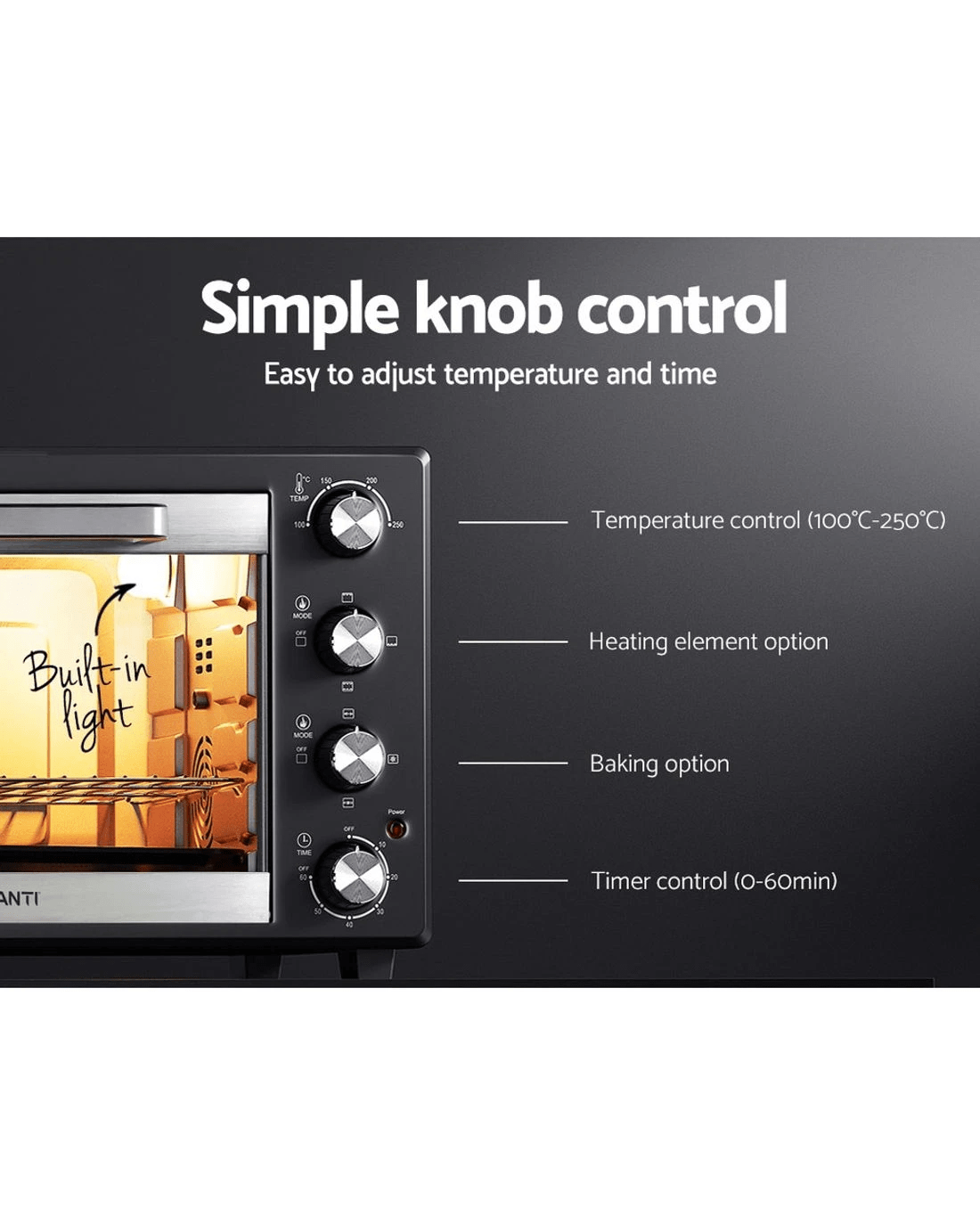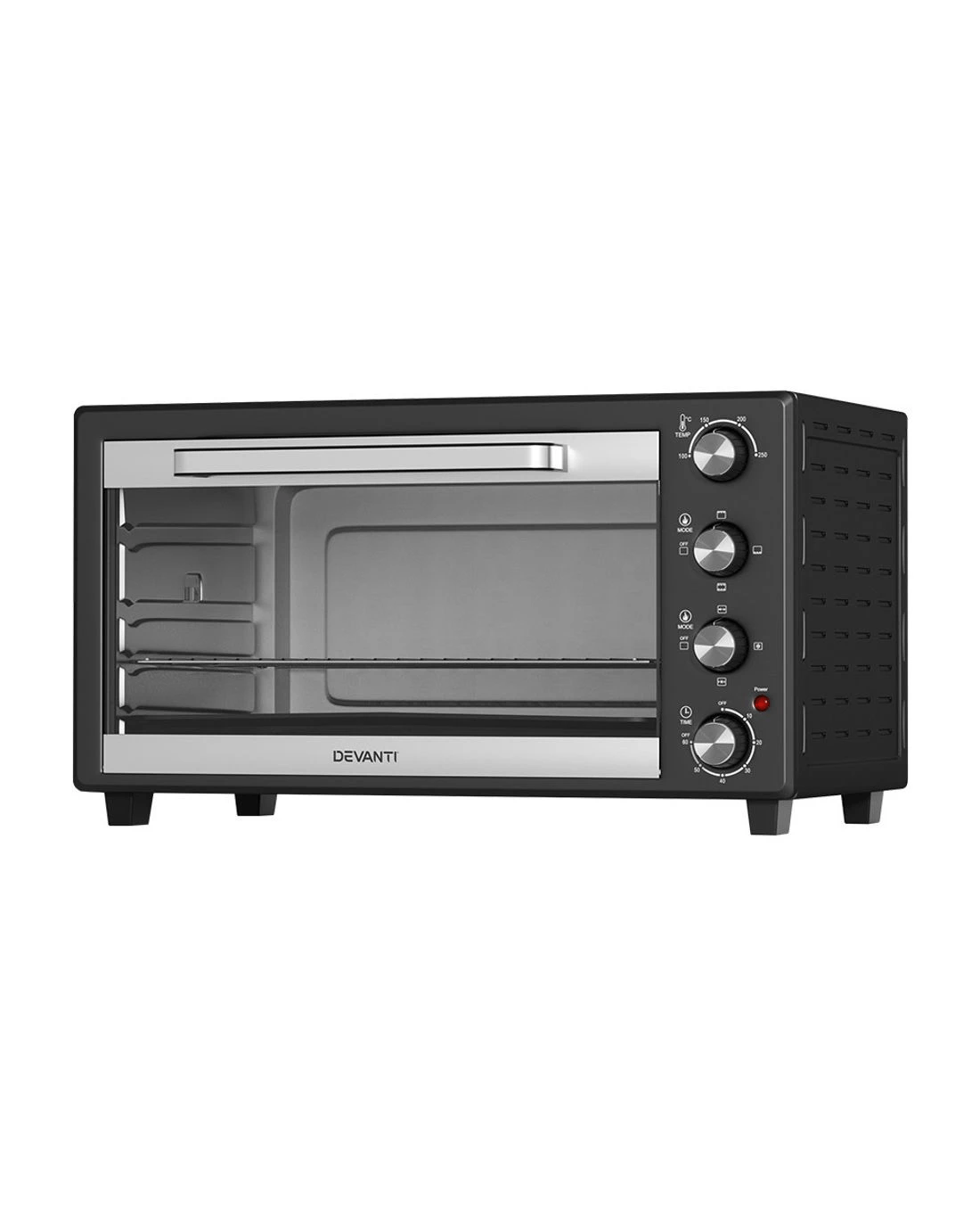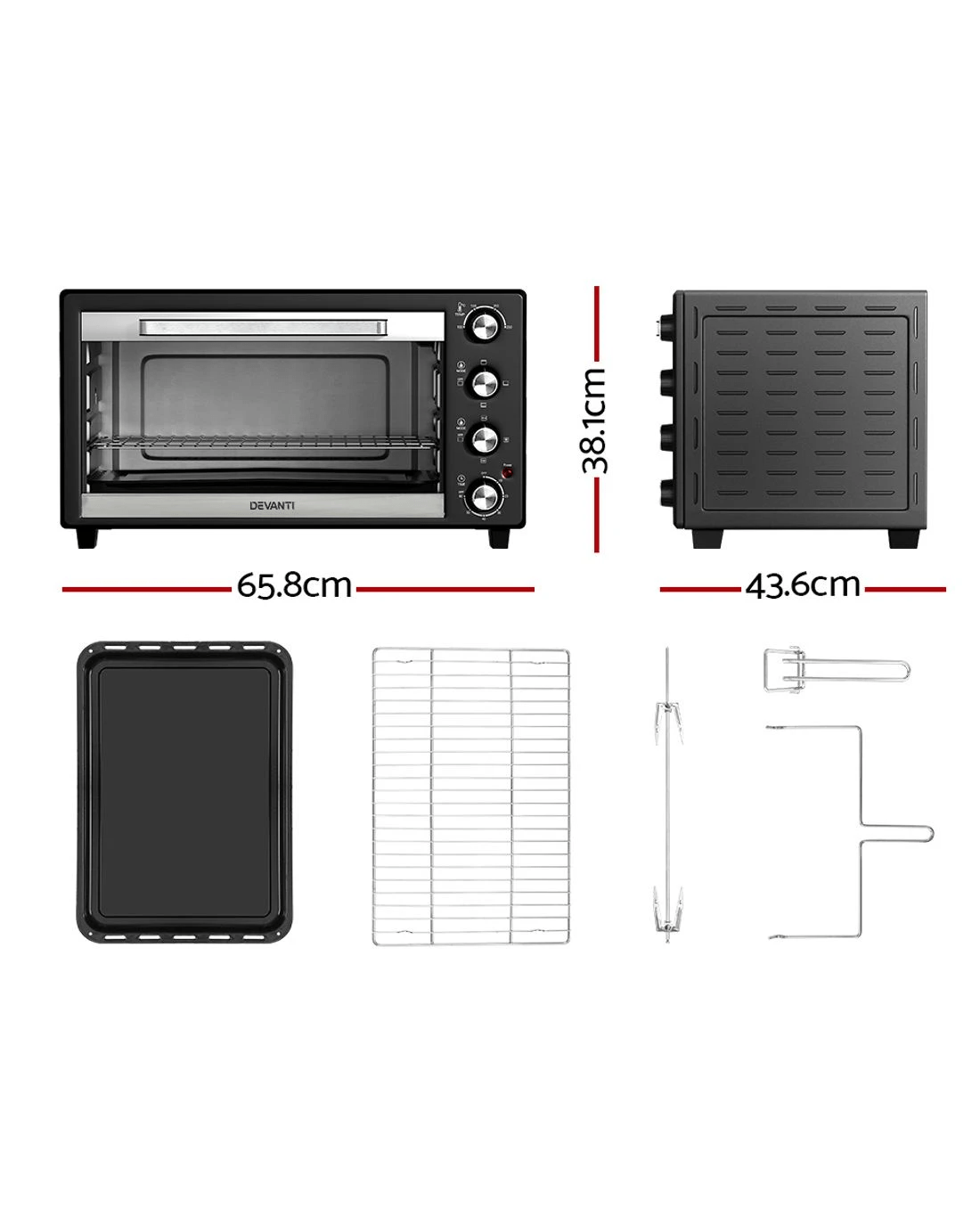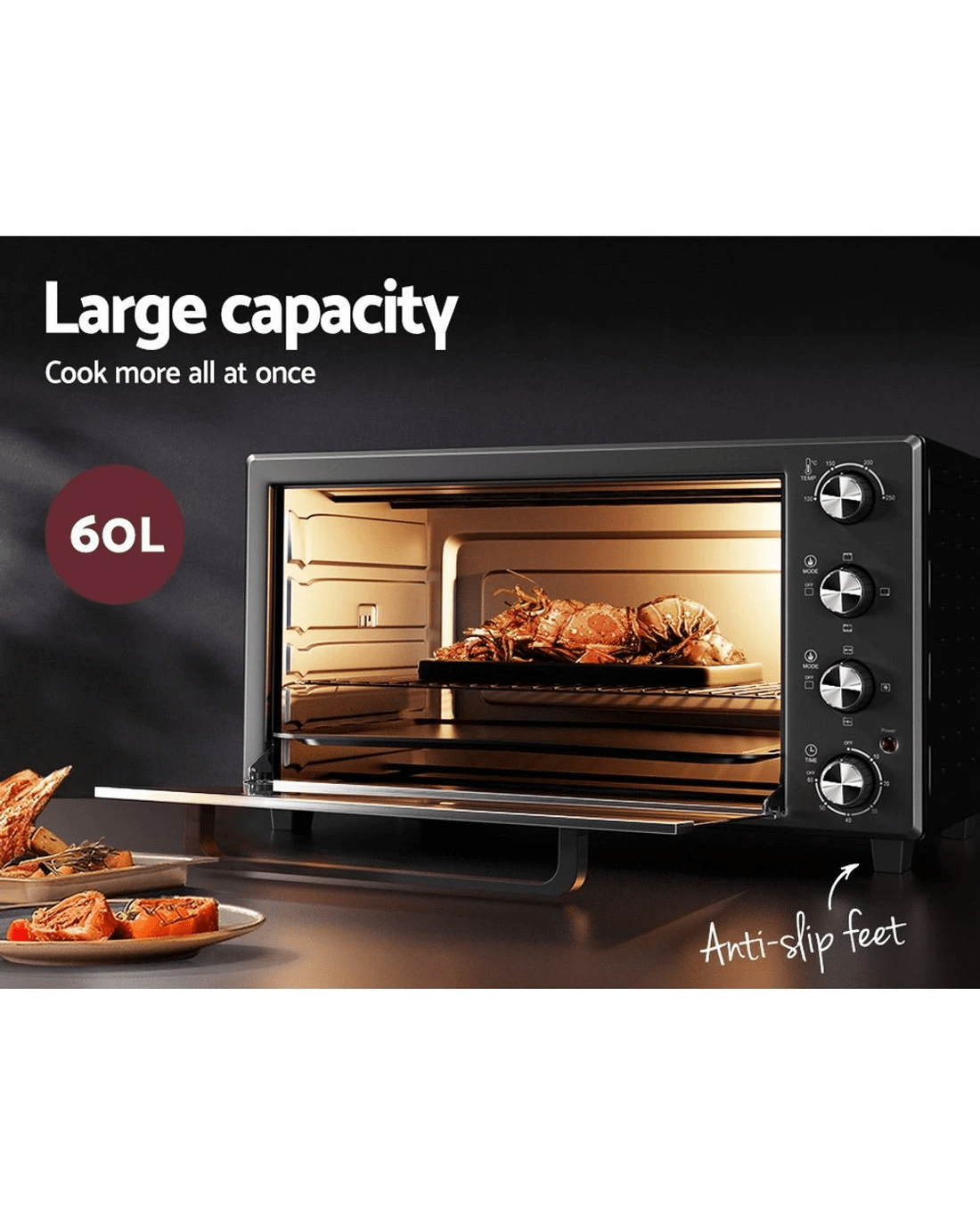 Need a multi-functional oven that you can take anywhere? Or do you need a solution for a home without an existing oven? Look no further than the Devanti Convection Oven. Portable and easy to use, the 60L capacity oven can bake, grill and roast to create your favourite recipes with minimum hassle. The oven is well insulated and has a cool-touch handle to always keep heat and radiation at bay for comfortable cooking. It features a rotisserie option for even cooking, 4 flexible tray positions and your choice of heating element options for precise cooking control every time. With its tempered glass door and built-in light, you can always monitor the progress of your cooking and adjust the temperature as needed. It also has a 60-minute timer with an alarm to help you time your cooking to perfection. Not least, the oven also comes with a host of bonus accessories that include a non-stick baking tray, wire rack, tray handle, rotisserie fork and rack, so you'll have everything you need to start cooking pronto!