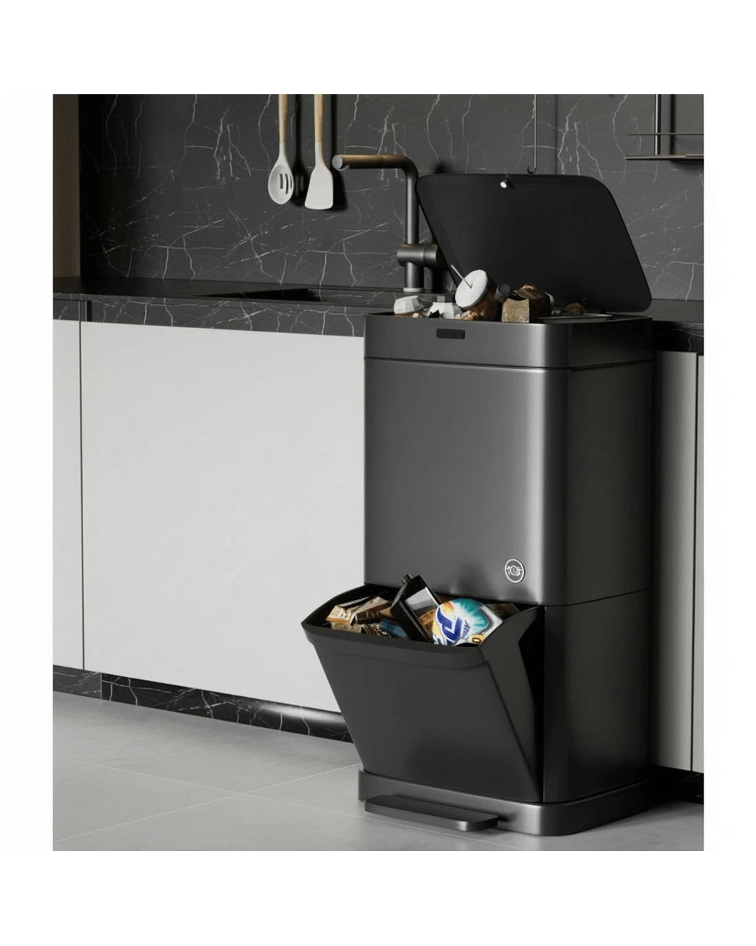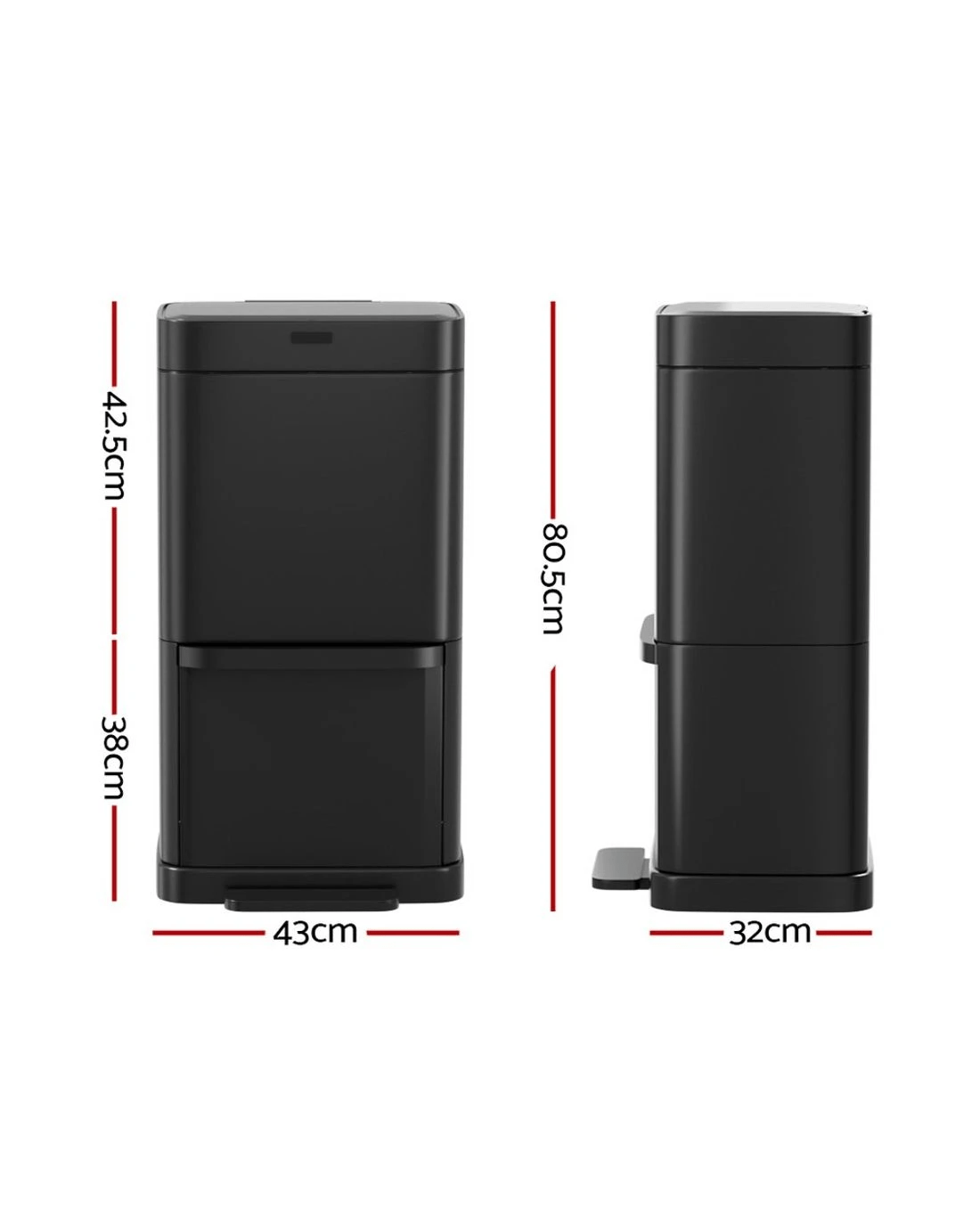 Keep your home clean, tidy and germ-free with a Devanti Recycling Motion Sensor Bin. Activated by just the wave of your hand (within a 20cm range) and a hands-free foot pedal, the motion sensor bin makes it easy to dispose of your trash cleanly and hygienically. With a large 70L capacity, you won't need to clear your bin immediately to make room for more trash. The bin is divided into two compartments so you can dispose of your trash and recycling separately. A removable divider for the top compartment helps keep your different recycling needs separate. A fingerprint-resistant black surface keeps your kitchen looking shiny and bright. No more worrying about the bin liner moving out of position with the convenient liner holder. The soft opening and closing make the bin completely noise-free. Keep your home (and the planet) clean and clear with a Recycling Motion Sensor Bin from Devanti.