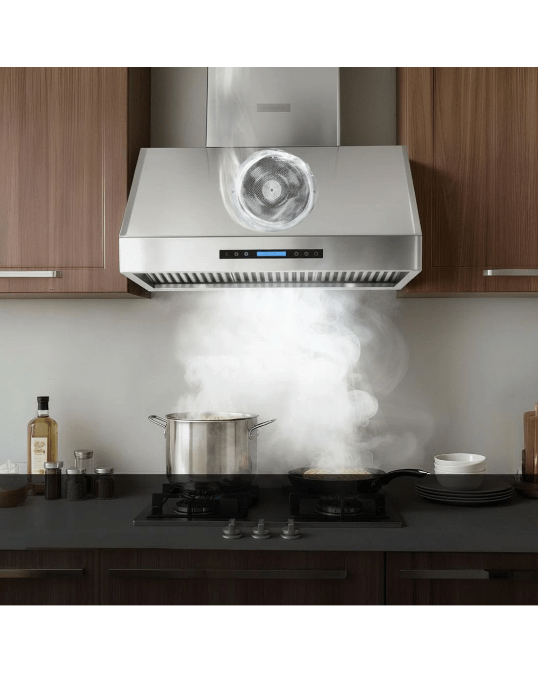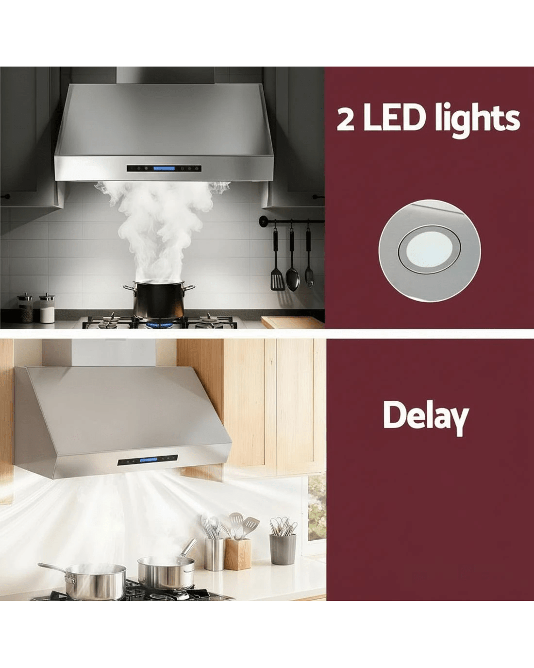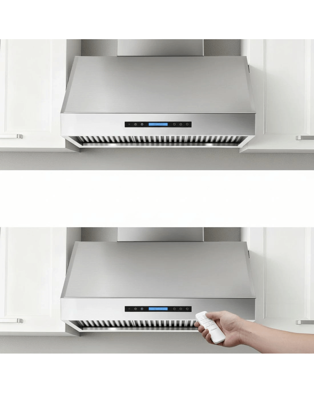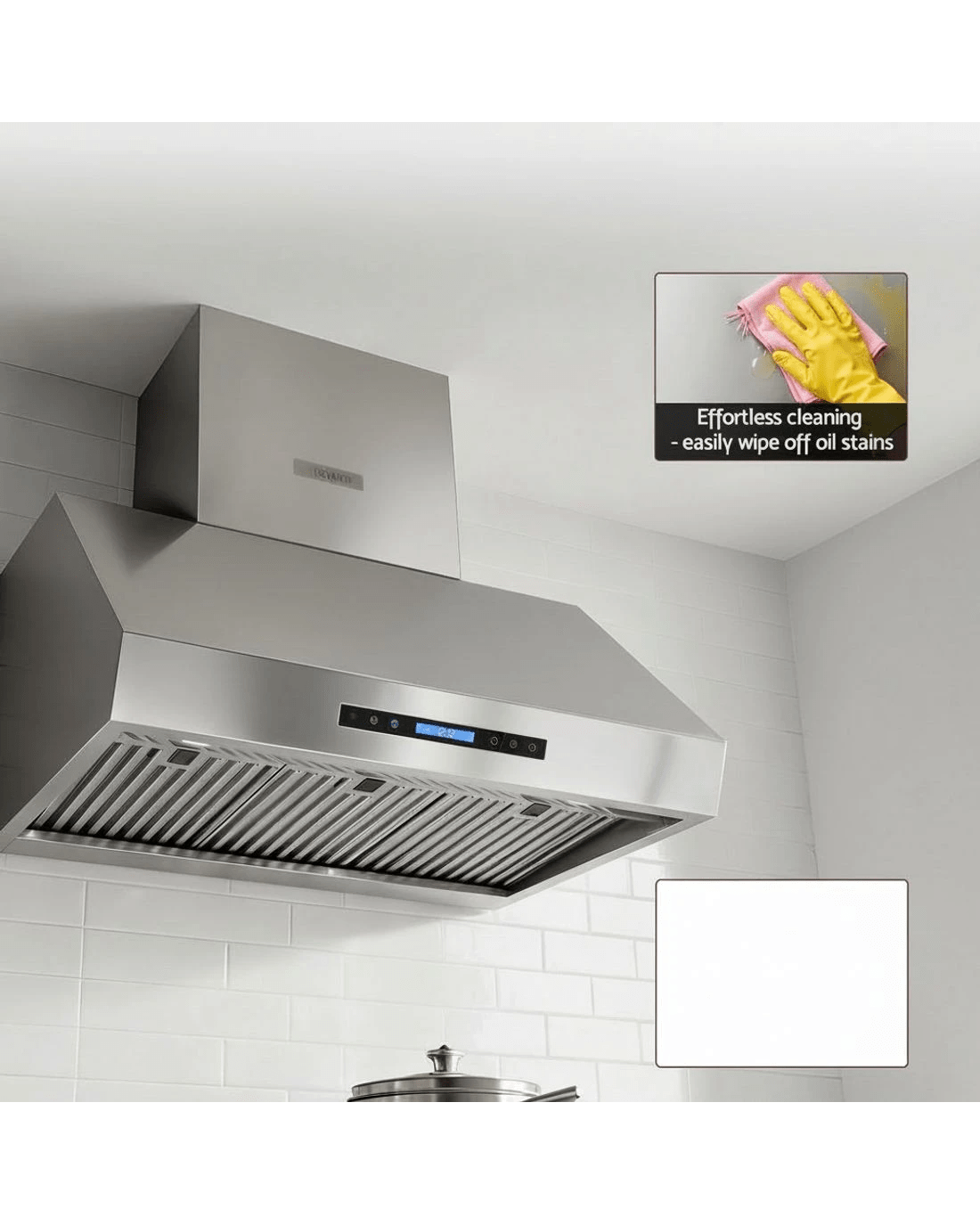Designed for convenience, the 2-layer dishwasher-safe filters make cleaning a breeze, and the delay shutdown function automatically turns off the hood after 15 minutes. With a 24-hour clock LED display and adjustable height, this range hood combines functionality, safety, and style in one premium appliance.