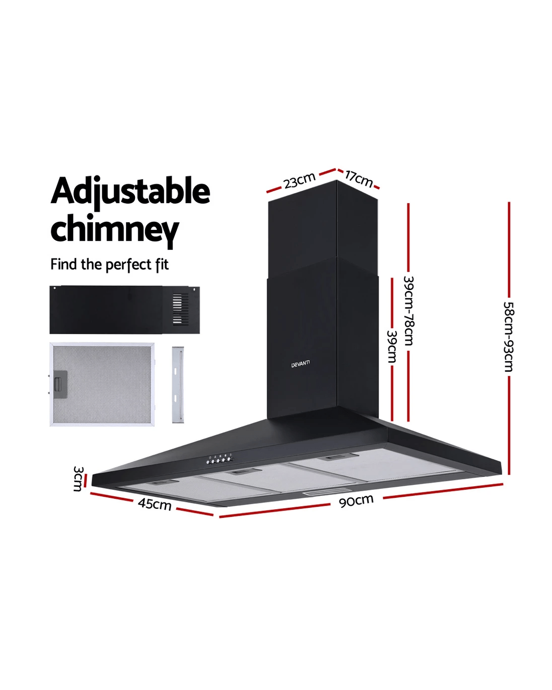Say goodbye to smoky fumes and unwelcome cooking odours with our Devanti Range Hood. With its high-performance motors, the black powder-coated steel range hood provides a steady upflow and filtered extraction of fumes and oil to keep your cooktop area clean and fresh after every use. With its 3-speed rocker button switches, the extraction speed can be adjusted to suit the circumstances. Other features include three non-stick 5-layer aluminium filters that are removable and replaceable and LED lighting to facilitate your illuminated cooking. The range hood is wall mounted and the chimney can be adjusted to fit the installation space.