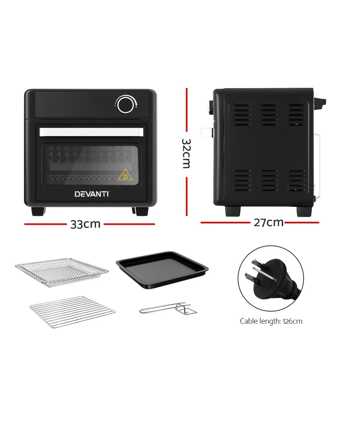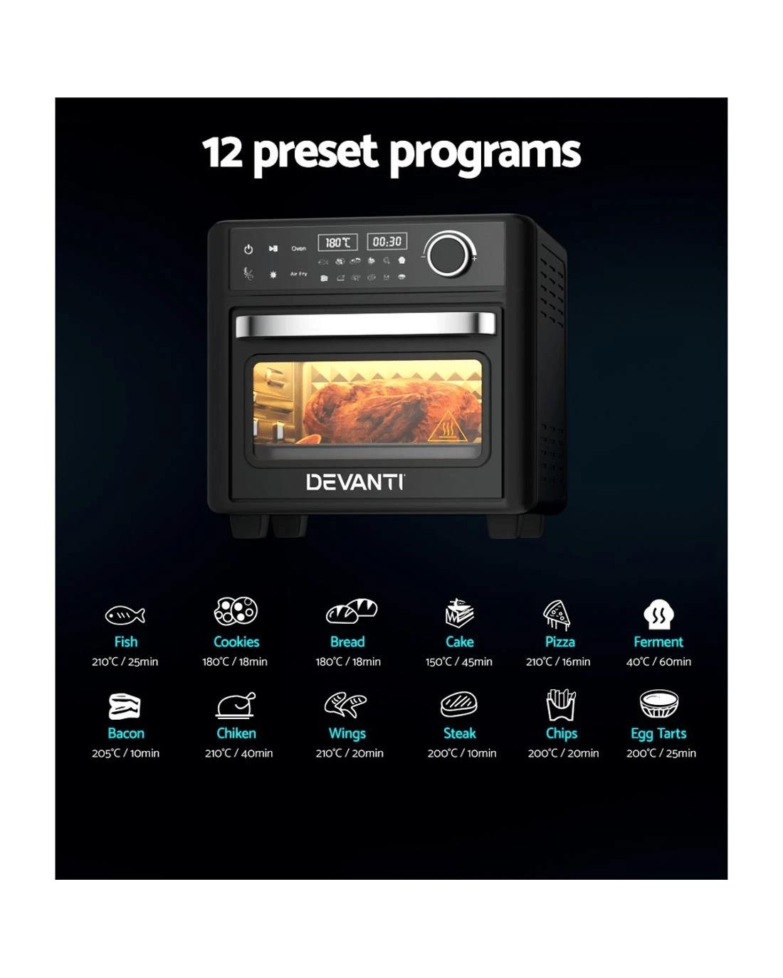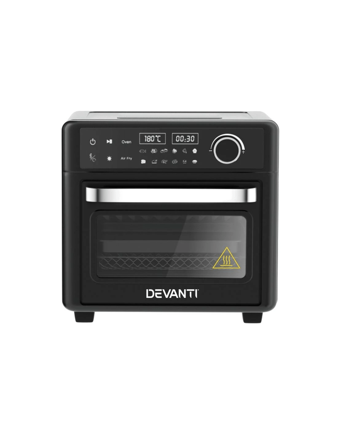 Enjoy your favourite fried foods without guilt thanks to the Devanti 15L Air Fryer Oven. With its smooth and stunning sleek exterior, the Devanti Air Fryer turns ordinary food into extraordinary dishes thanks to its exceptional cooking abilities. Five stainless steel heating elements plus 360-degree heat circulation thanks to the powerful fans ensure your food is cooked thoroughly and evenly. The 15L capacity is suitable for a full set of meals from sides to mains. 12 cooking presets help you cook your ideal meal to perfection every time. Better still, all this wonderful cooking is done without a drop of oil and is as delicious and succulent as your favourite fried treats. Choose the time, temperature and cooking preset with the easy-to-use LCD touch control panel. The tempered glass viewing window and interior light make it easy to check your cooking progress. It also features an automatic shut-off switch, a cool touch handle, a heat shield vent, and non-slip feet for safety. Most importantly, each component is easy to clean, so you can get dinner sorted and cleaned in no time. Comes with an additional wire basket, wire rack, non-stick cooking pan and baking tray. Get yours today and see the benefits of fat-free cooking!