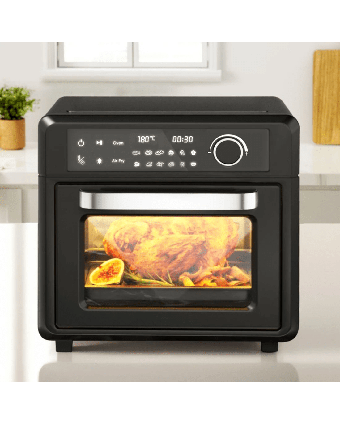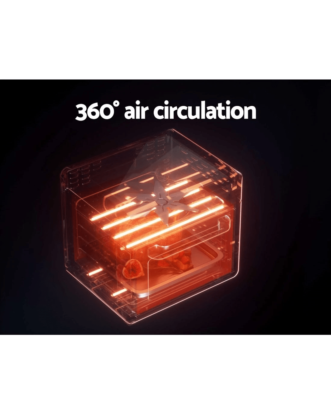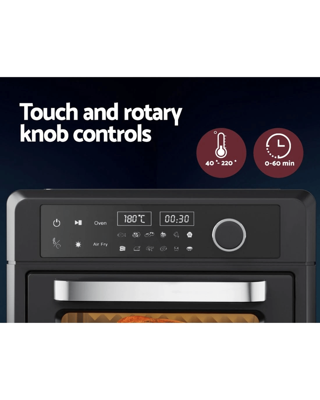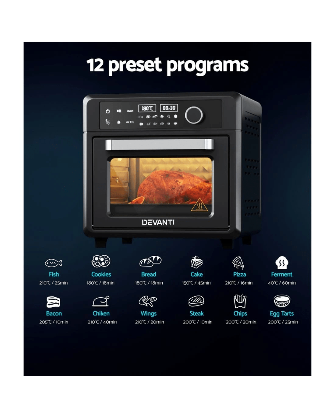 Enjoy your favourite fried foods without guilt thanks to the Devanti 20L Air Fryer Oven. With its smooth and stunning sleek exterior, the Devanti Air Fryer turns ordinary food into extraordinary dishes thanks to its exceptional cooking abilities. Five stainless steel heating elements plus 360-degree heat circulation thanks to the powerful fans ensure your food is cooked thoroughly and evenly. The 20L capacity is suitable for a full set of meals from sides to mains. 12 cooking presets help you cook your ideal meal to perfection every time. Better still, all this wonderful cooking is done without a drop of oil and is as delicious and succulent as your favourite fried treats. Choose the time, temperature and cooking preset with the easy-to-use LCD touch control panel and rotary knob. The tempered glass viewing window and interior light make it easy to check your cooking progress. It also features an automatic shut-off switch, a cool touch handle, a heat shield vent, and non-slip feet for safety. Most importantly, each component is easy to clean, so you can get dinner sorted and cleaned in no time. Comes with an additional wire basket, wire rack, non-stick cooking pan and baking tray. Get yours today and see the benefits of fat-free cooking!
