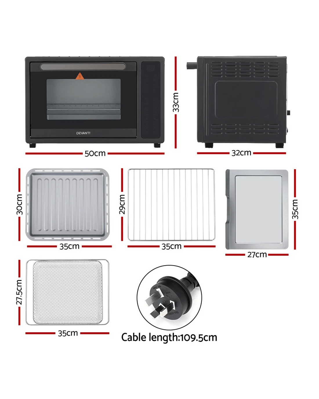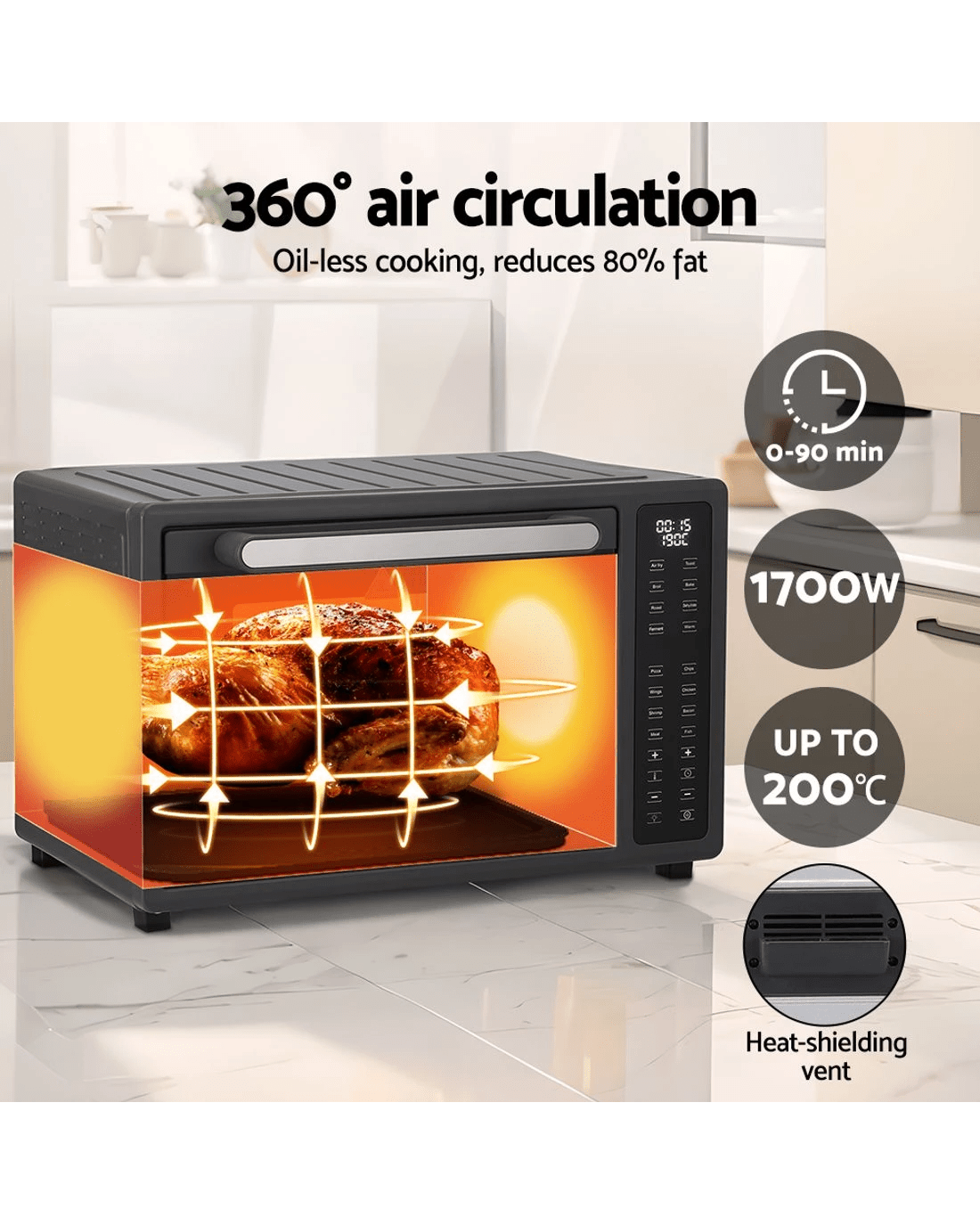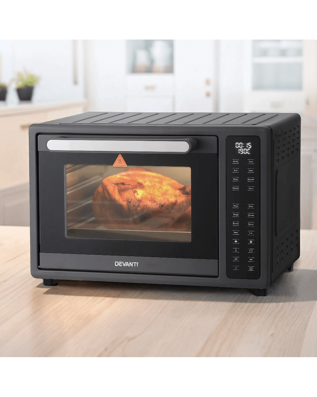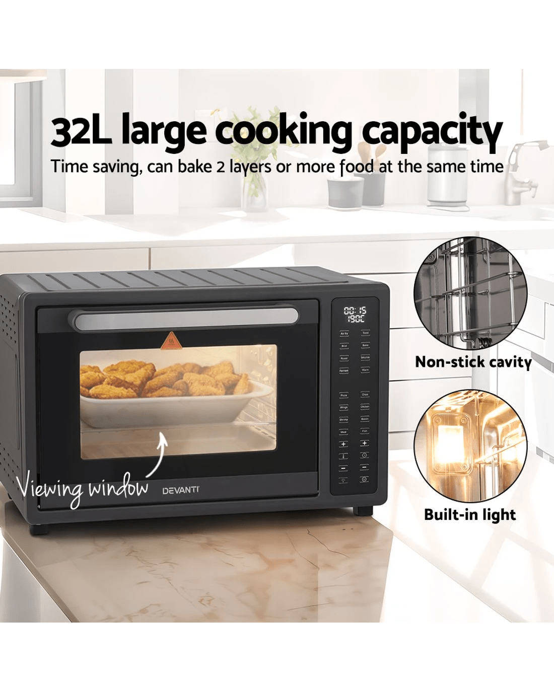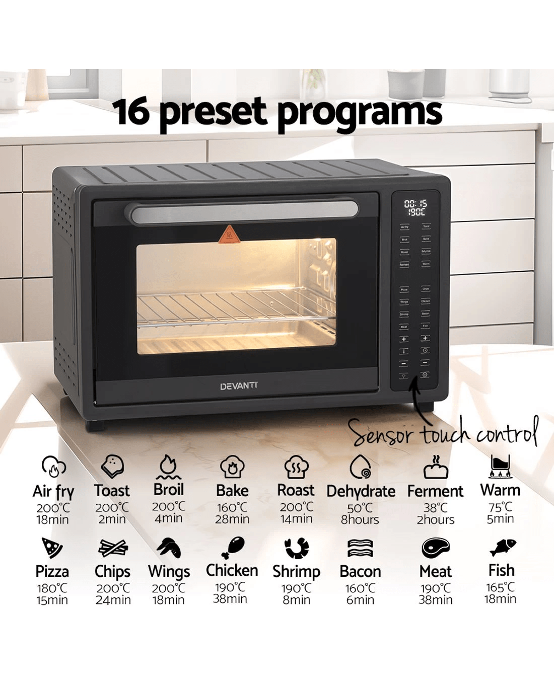 Conquer culinary creativity with the Devanti Air Fryer! This powerhouse boasts a massive 32L capacity, perfect for family feasts or meal prepping. Effortlessly choose from 16 pre-programmed settings for everything from crispy fries to perfectly roasted vegetables. 360° air circulation ensures even cooking and delicious results, while the adjustable temperature range (35℃-200℃) and 90-minute timer allow for precise control over your cooking. Keep an eye on your food with the built-in light.The intuitive sensor touch control panel and cool-touch handle offer user-friendly operation, while the non-stick coating pan and heat shield vent prioritize safety and convenience. This air fryer comes complete with a bonus accessory kit, including an air fry basket, drip tray, oven rack, and crumb tray, providing versatility for all your air frying needs.