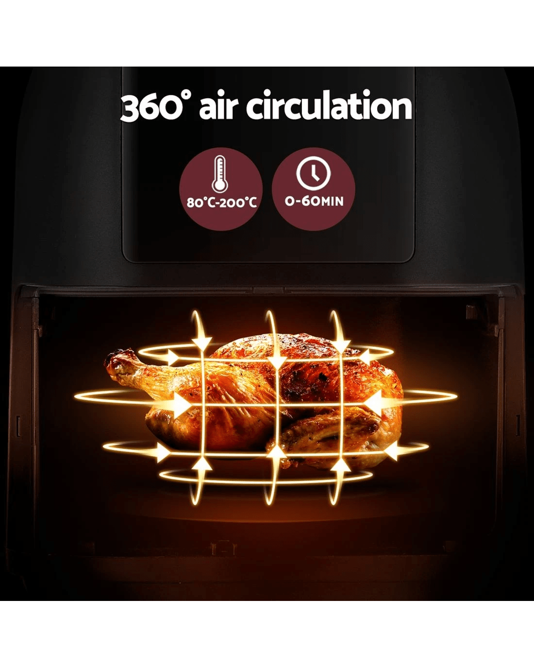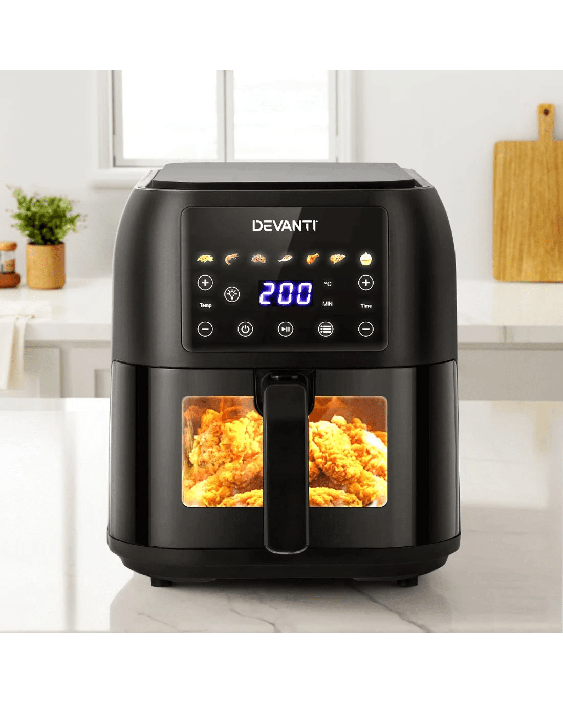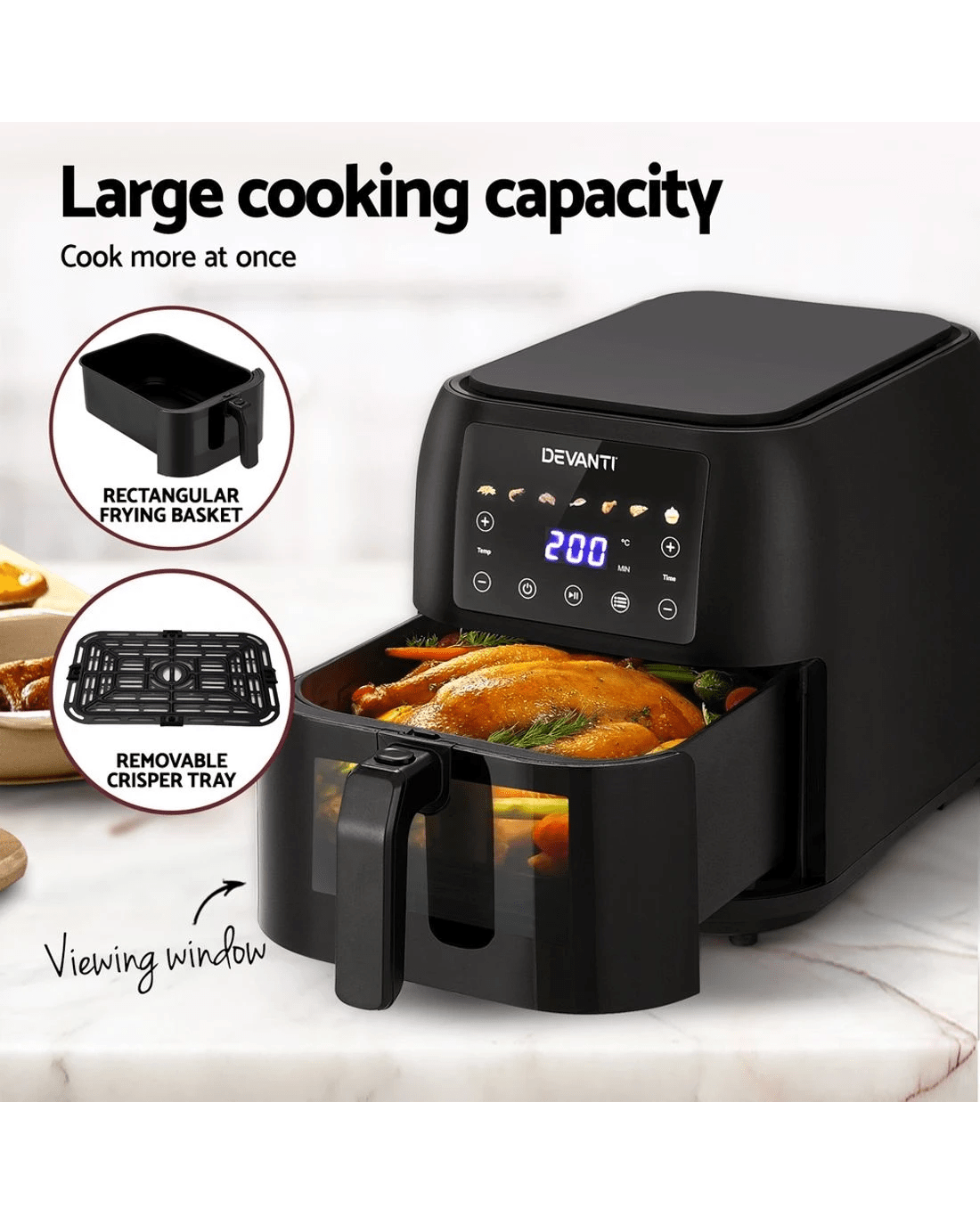 Enjoy your favourite fried foods without guilt thanks to the Devanti 8L Air Fryer. With its smooth and stunning sleek exterior, the Devanti Air Fryer turns ordinary food into extraordinary dishes thanks to their exceptional cooking abilities. With its innovative air frying technology and 1700W of power, you can cook quickly and efficiently. The 8L capacity and 7 cooking presets are suitable for a full set of meals from sides to mains. Better still, all this wonderful cooking is done without a drop of oil and is as delicious and succulent as your favourite fried treats. Foods cooked in our air fryer have up to 80% less fat than regular deep-fried foods. Choose the time, temperature and cooking preset with the easy-to-use LCD touch control panel. The tempered glass viewing window makes it easy to check your cooking progress. The interior features a non-stick pan for easy cleaning, a rectangular frying basket and a removable crisper tray for the ultimate crispy, crunchy experience. It also features an automatic shut-off switch, a cool touch handle, a heat shield vent, and non-slip feet for safety. Most importantly, the components are all dishwasher-safe, making cleaning as easy as pie. Get yours today and see the benefits of fat-free cooking!