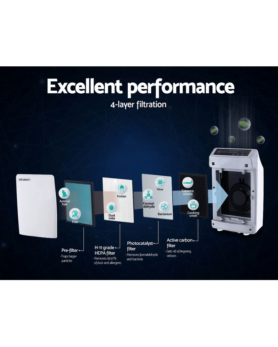 Do not let the cold get you down this season, or the hay fever get you down the next. If you already own our Devanti Air Purifier, you can continue to breathe easy long into the future with our Devanti Air Purifier Filter Replacement. The filtration system has four layers to effectively free the air inside your home from contaminants. The air first passes through the pre-filter that traps larger particles. The H11-grade HEPA filter removes 99.97% of household dust, allergens and other harmful particles as small as 0.3 microns from the air. The cold catalyst filter removes formaldehyde and bacteria. And finally, the active carbon filter gets rid of lingering odours so that you end up with clean air that is completely healthy to breathe. Go ahead a have a breath of fresh air with our air purifier filter replacement, which will get your air purifier working as good as new.