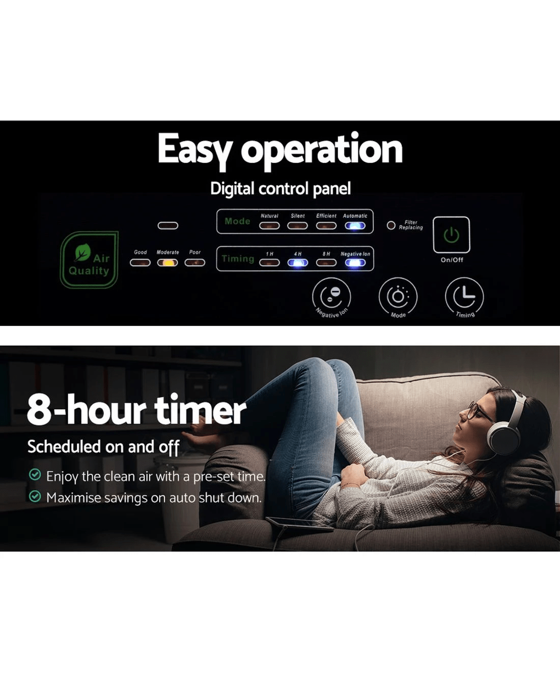 Do not let hay fever get you down this season. You can breathe easy with our Devanti Air Purifier, which will provide you with cleaner and healthier air always. The air purifier utilises a 4-layer filtration system to remove 99.97% of allergens and other harmful particles as small as 0.3 microns from the air. There is also a built-in ioniser which helps with the purification by releasing negative ions into the air to bond with and thus remove harmful positively charged particles. And the air quality sensor with coloured indicators clearly shows when the air quality is good, fair or poor, so that you can always be assured of clean air in your home. Best of all, there are four modes (Automatic, Normal, Efficient and Silent) to suit every situation, with the automatic mode intelligently monitoring the air quality to automatically adjust the airflow accordingly. The digital control panel allows for a clear glance and easy control of all your settings and a handy remote control lets you operate from anywhere in the room. The air purifier can also be set to work for a pre-set period with its 8-hour timer. Other useful features include a convenient handle for easy mobility and a filter change indicator. Go ahead and have a breath of fresh air with our air purifier.