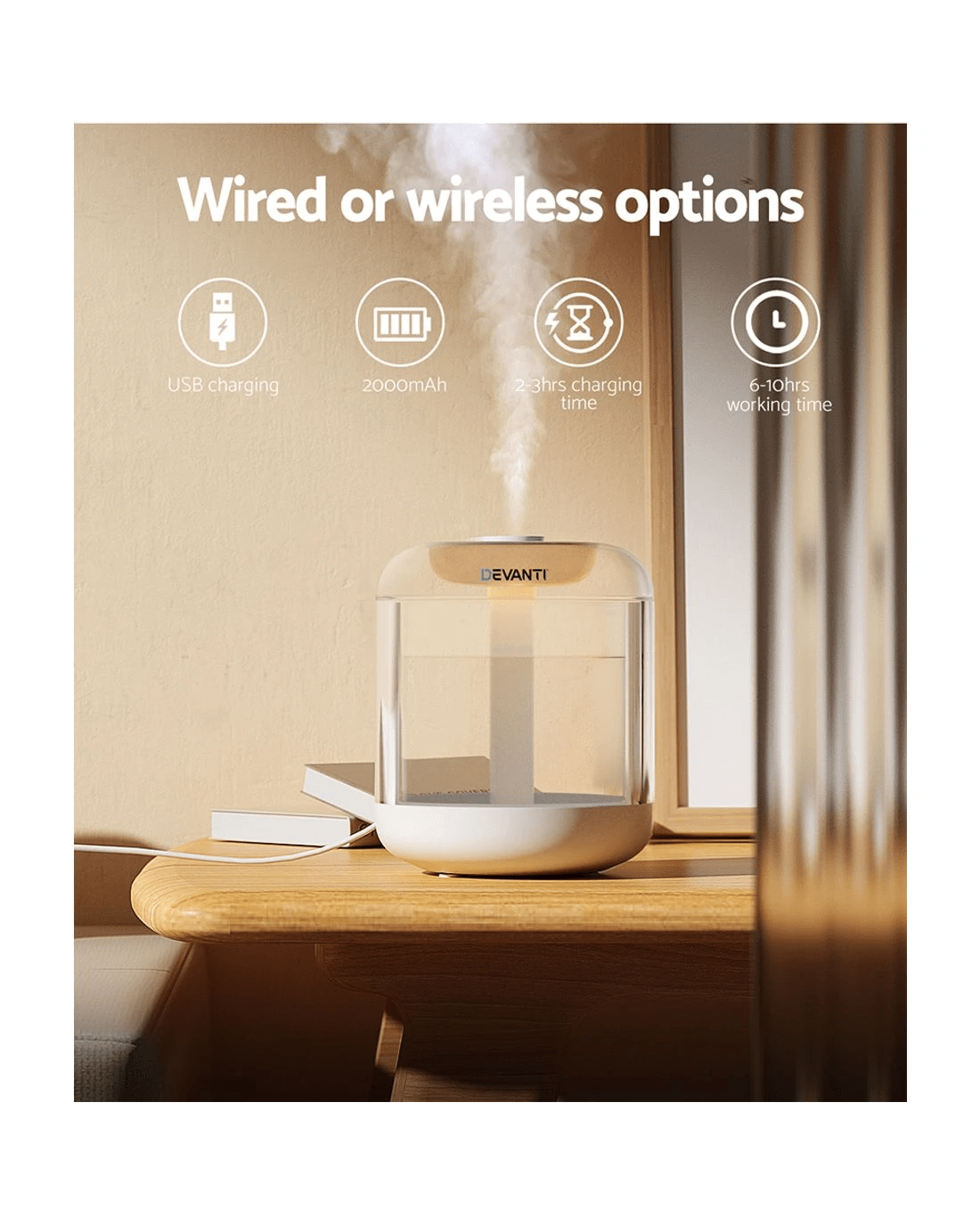 Relax and absorb calm and soothing vibes at the touch of a button with a Devanti Ultrasonic Aroma Diffuser. Made from quality ABS plastic, the diffuser gives you a clear view of the water tank and can be filled easily with its top-fill design. Add fruits, flowers and perfume to your water for a beautiful, sensory display. The diffuser works in four ways: as a night light, humidifier, purifier, and aromatherapy device. The device uses ultrasonic technology to turn your favourite perfume and water into a smooth, cool, aromatic mist to help restore and maintain your aura. The diffuser comes with two mist frequency adjustments, two levels of brightness and two timer settings to meet your exact preferences. The low water auto shut-off automatically detects water levels and turns off the device when empty, so you don't have to worry about damaging the device with prolonged use. The device can be plugged in or battery operated for the ultimate portability and convenience. Bring life back to stale air, cover stubborn odours, and revitalize your home with a Devanti Ultrasonic Aroma Diffuser.