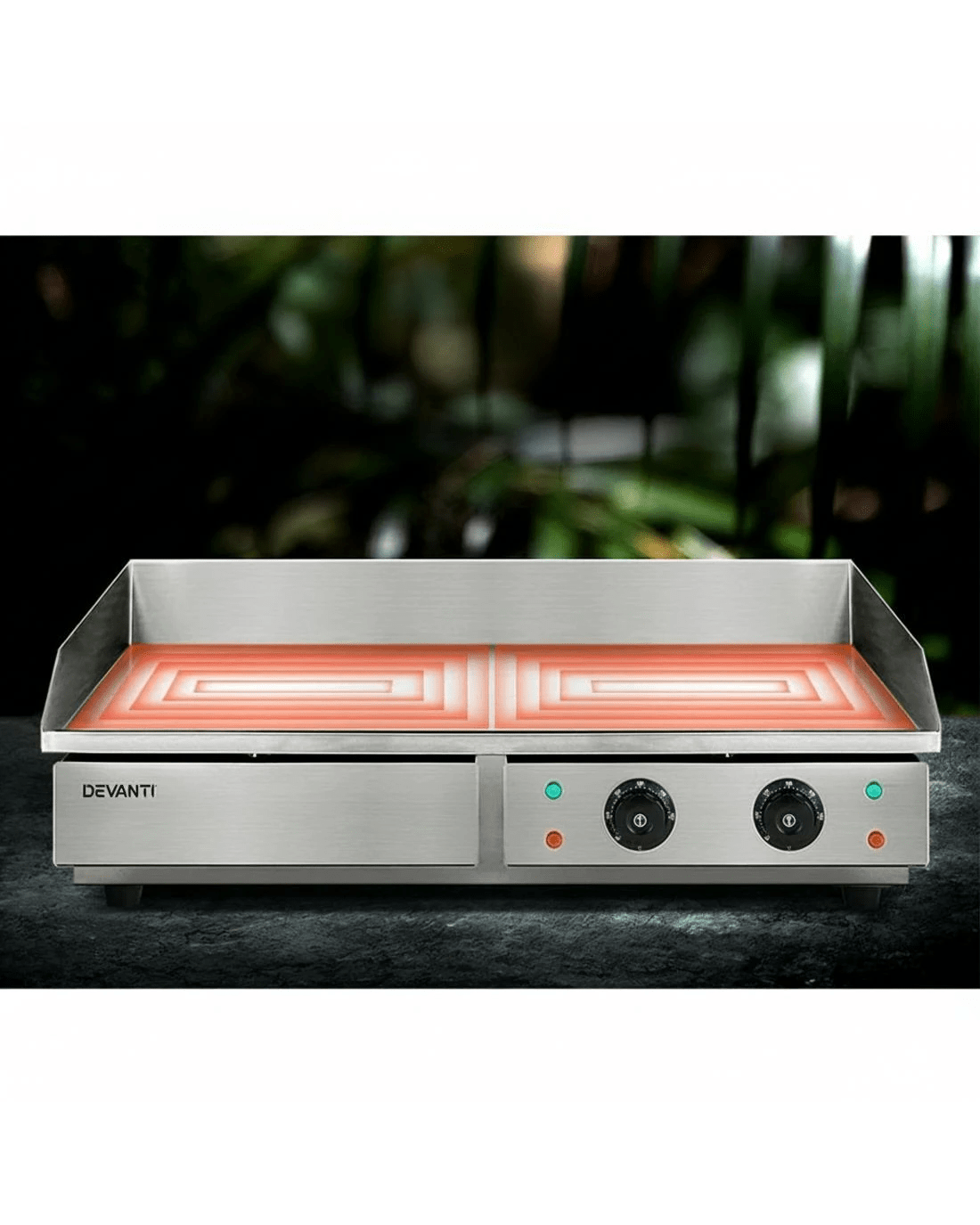 Make cooking effortless with a Devanti Electric Griddle. It features a large, flat cooking surface that can be divided into two separately controlled cooking zones, so you can cook large amounts of food at the perfect temperature every time. The griddle has a temperature range of 50-300 degrees and the S-shaped heating elements heat the food-grade stainless steel surface fast and evenly for a uniform cook. A top splash guard protects you and your surroundings from oil splatter, while an overload circuit breaker prevents short circuiting and non-slip feet keep the griddle stable on your benchtop. The entire unit is easy to clean: the stainless steel surface is smooth and anti-rust, while the removable drip tray can be cleaned quickly and easily. Enjoy cooking wherever you are with a Devanti Electric Griddle.