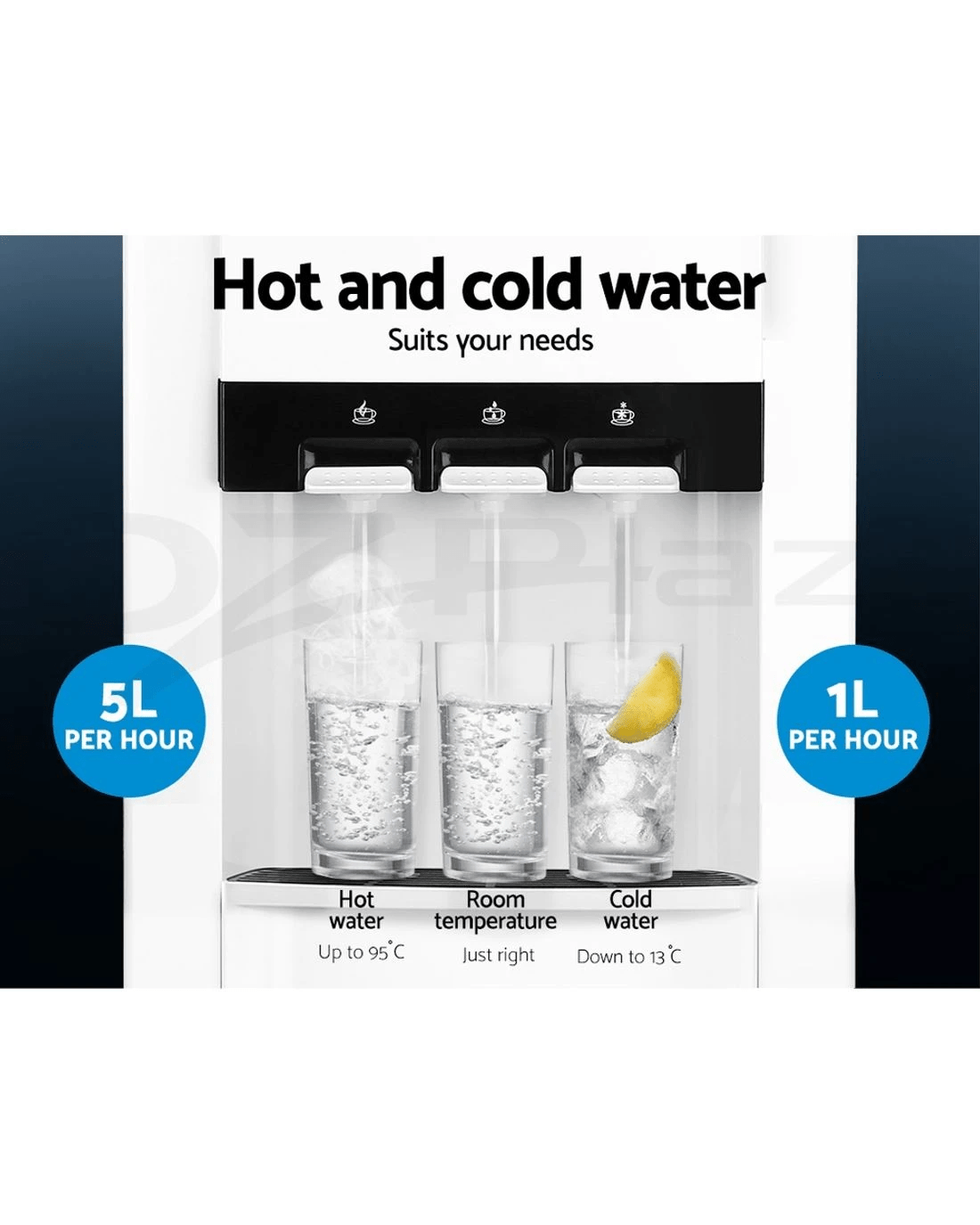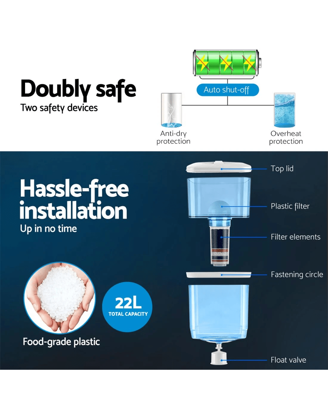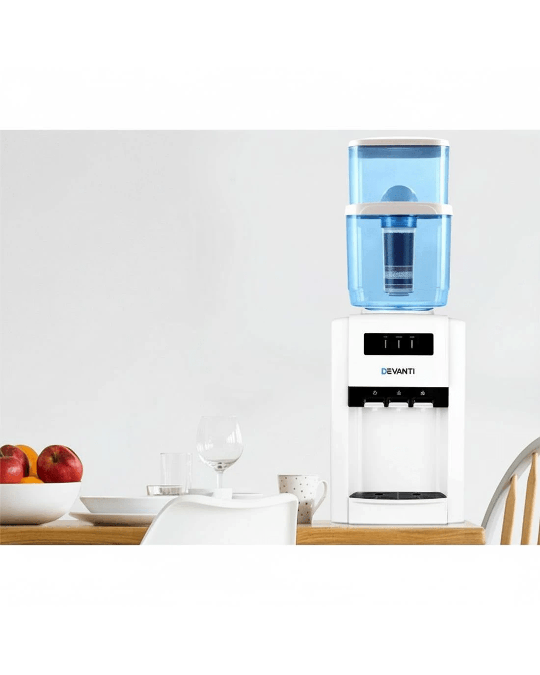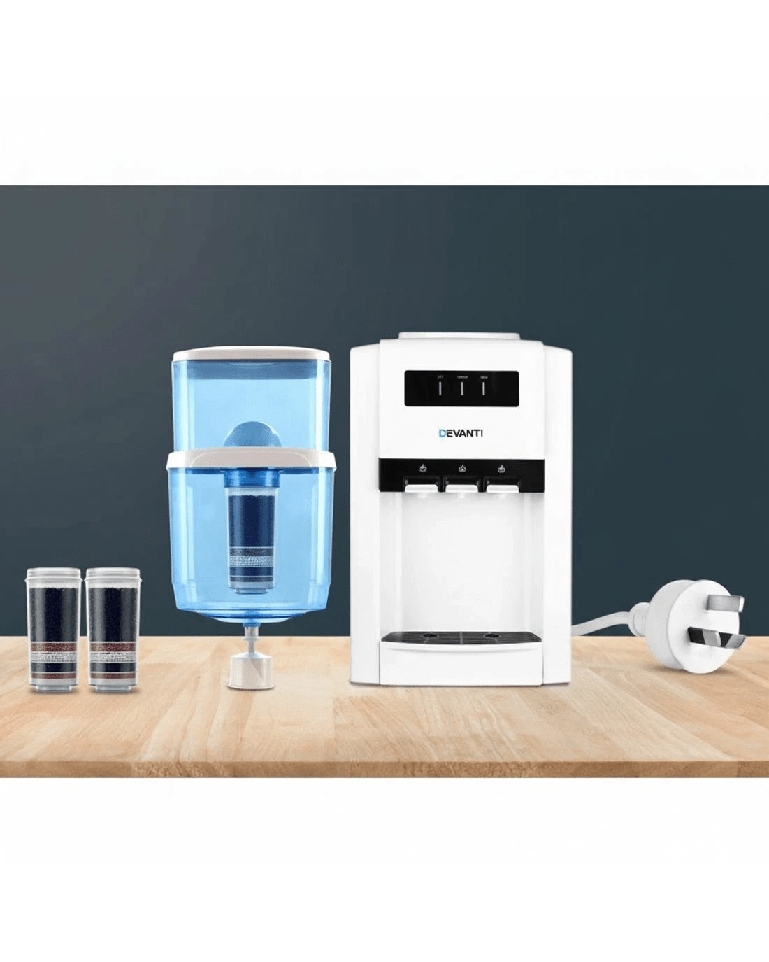 Filtered, clean and pure water on demand. With the Devanti Countertop Water Cooler, it could not be any easier. The large 22-litre water purifier container ensures that ample drinking water is always on call without hassle. Better still, the food-grade plastic container is refillable to ensure you can always have water anytime without having to wait for delivery of bottled water. Thanks to its 7-stage filtration system with two replacement filters that ensures your water tastes great and free of harmful chemicals and impurities. The cooler comes with three taps to deliver water at hot, cold or room temperature options. Plus, the cooler also comes with a smart detachable water guide plate that allows you to use bottled water if needed. The cooler is designed for safe use with protection against overheating, over-current, drying out and electric shocks. Not least, the cooler can be placed on any counter top for convenient use and the anti-slip feet ensure that the ensemble stays firmly in place.