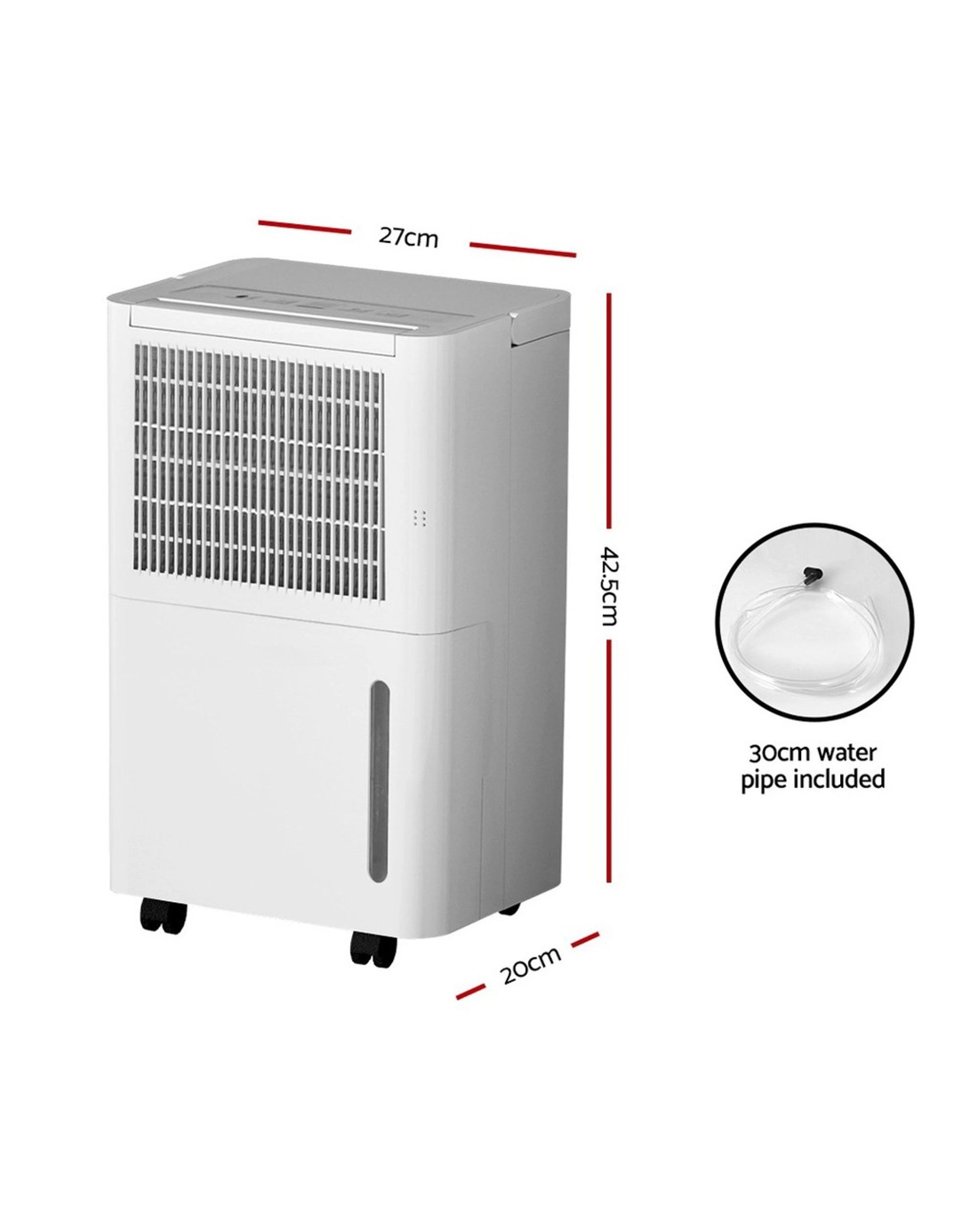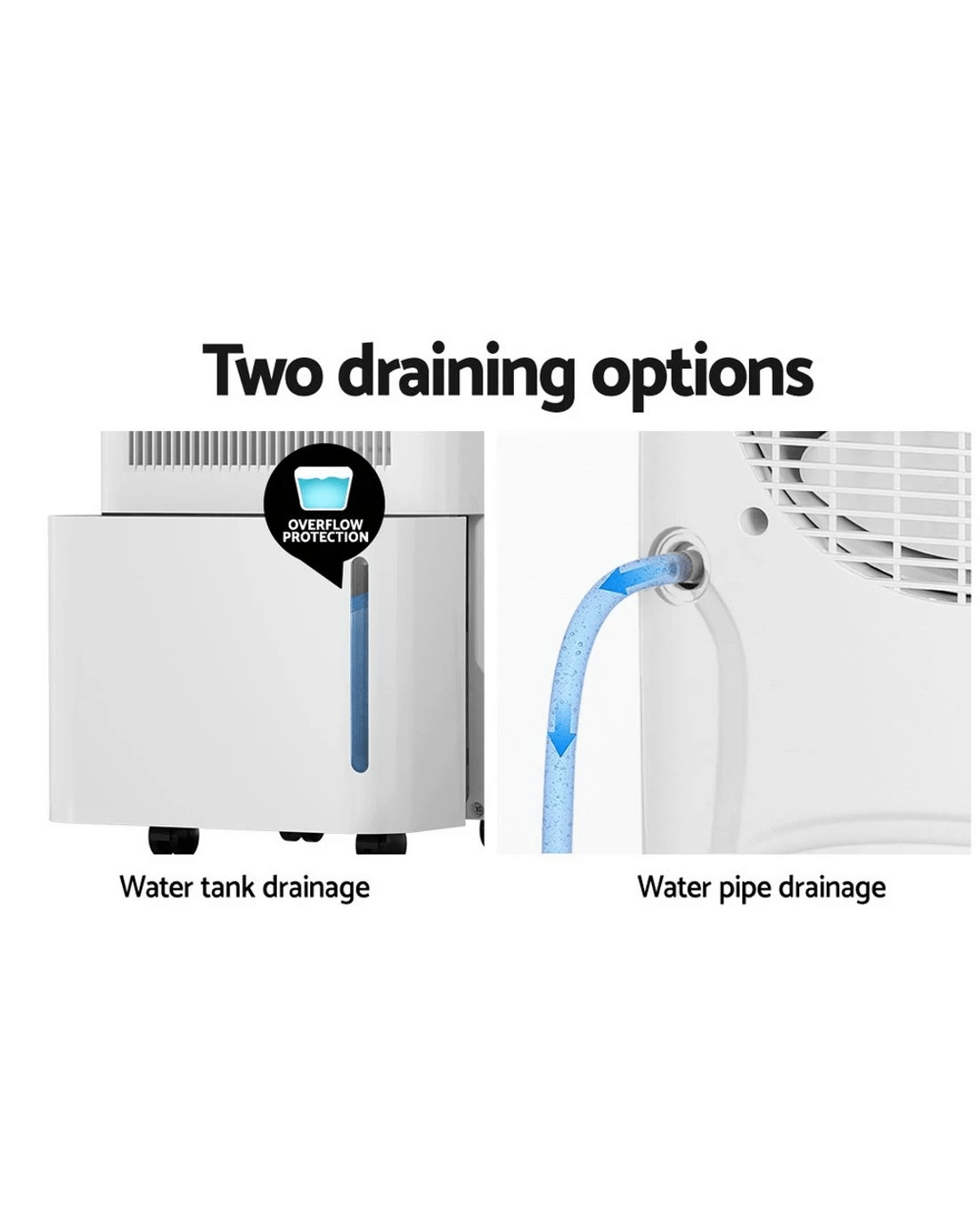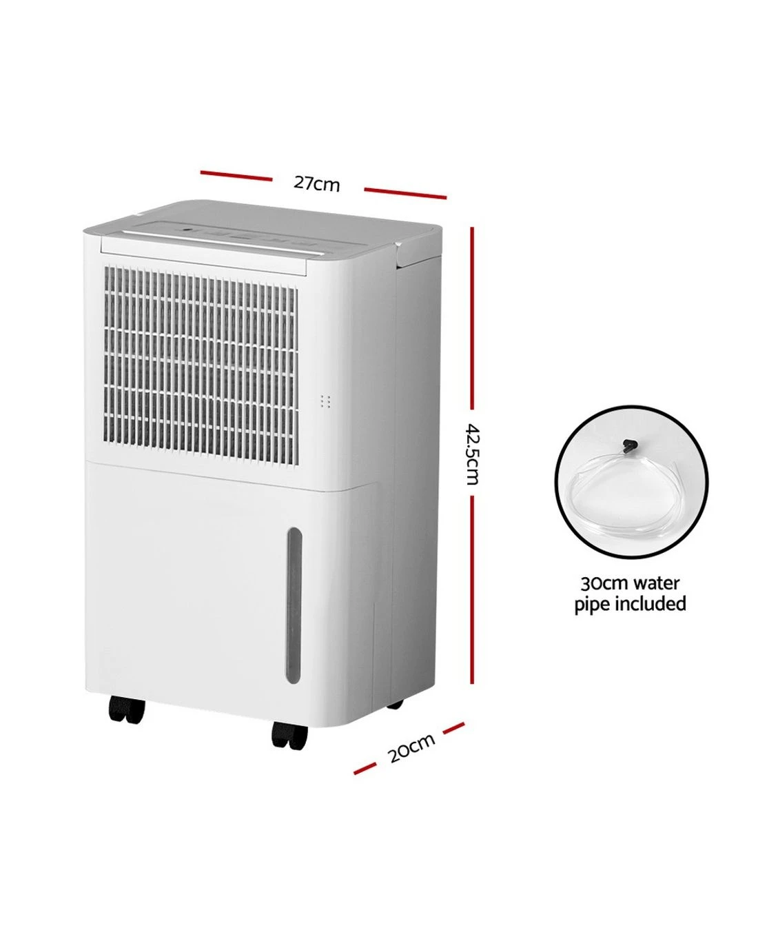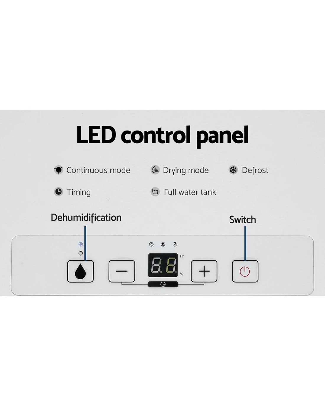 Do you feel trapped and stuffy at home? Do you have trouble with mould and mildew? The problem may be your air quality. Let our Devanti Dehumidifier rid you of strong odours, dust and high humidity in your home. The 2-in-1 device acts as both a dehumidifier and an air purifier to eliminate VOCs and other unwanted particles in the air. A washable air filter allows you to effectively filter every time without having to change parts. With its efficient compressor, you can eliminate 12L of water per day without overspending on electricity. With a 24-hour timer, you can set and forget as your device automatically cleans your air quietly and efficiently. The handy LED screen will always keep you informed. Drain the recaptured water into the 2.1L water tank or drain it where it needs to go with the included 30cm water pipe. Finally, the entire device is set on smooth castor wheels and features a convenient handle for portability. Stop suffering and start breathing easy again with a Devanti Dehumidifier.