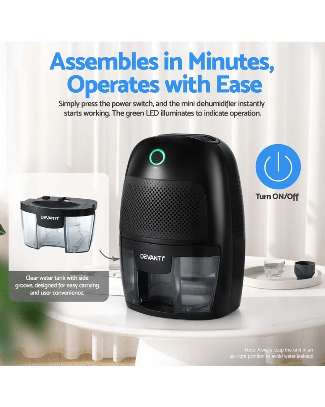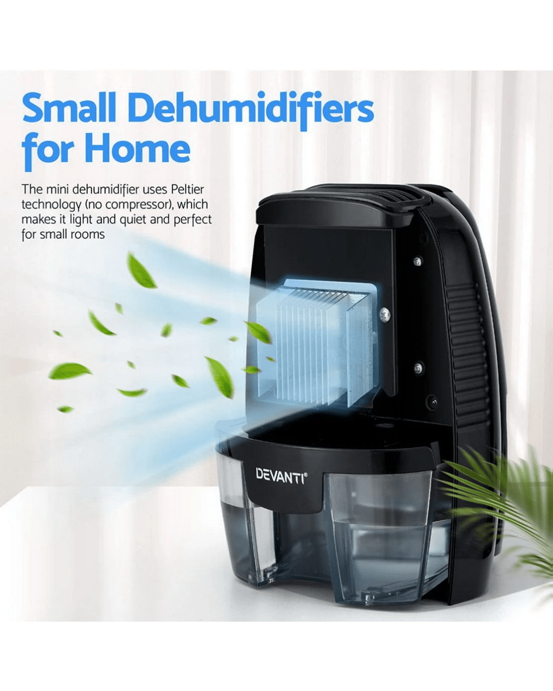 The Devanti Mini Dehumidifier uses Peltier technology for quiet operation (<48dB), removing approx. 250–300ml of moisture daily. Compact (15.4x13x21.8cm) and lightweight (1kg), it includes a 600ml tank with auto shut-off and red LED alert when full. Ideal for home, office, or dorm. The product is free from harmful substances, ensuring safe use. It also features a detachable tank cover for easy cleaning.