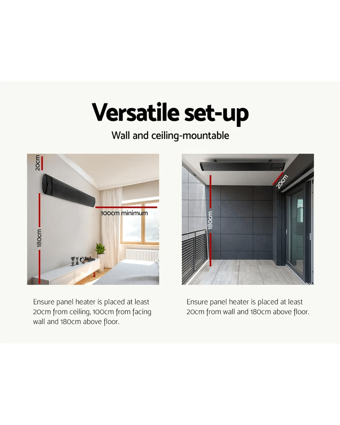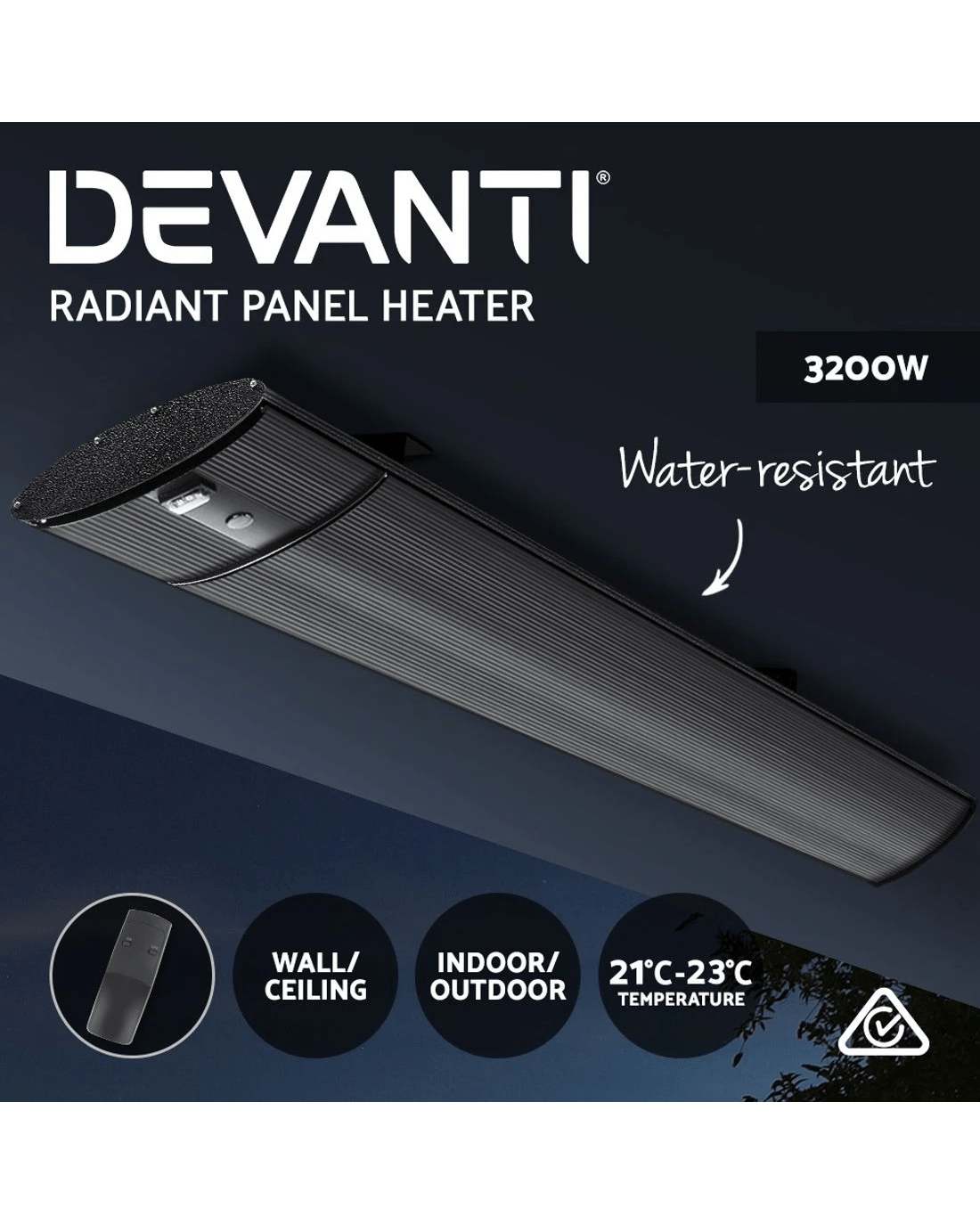 With its sleek and slimline profile, the Devanti Radiant Panel Heater is absolutely stylish from any angle. But more than just good looking, the panel heater is a perfect infrared heater that provides all the benefits of natural sun-lit warmth. Comprising a black anodized aluminium body and efficient non-glowing heating element, the panel heater ensures even heat dispersion all round. It can be wall or ceiling mounted with the included mounting accessories and also suitable for both indoor and outdoor use with its water-resistant and corrosion-resistant properties. Better still, the brackets are adjustable for flexibility. A handy remote control also makes for easy operation of the heater from any location within range. Not least, the panel heater works ever so silently and comes with a safety overheat protection. It also complies with Australian standards and is approved for use with SAA, CE, EMC and RoHS certification.