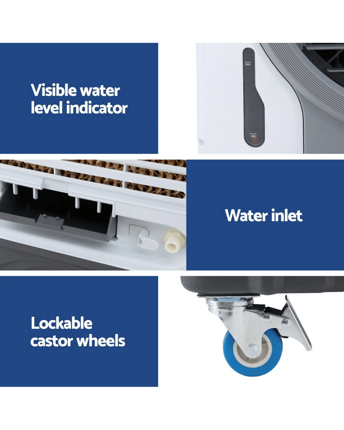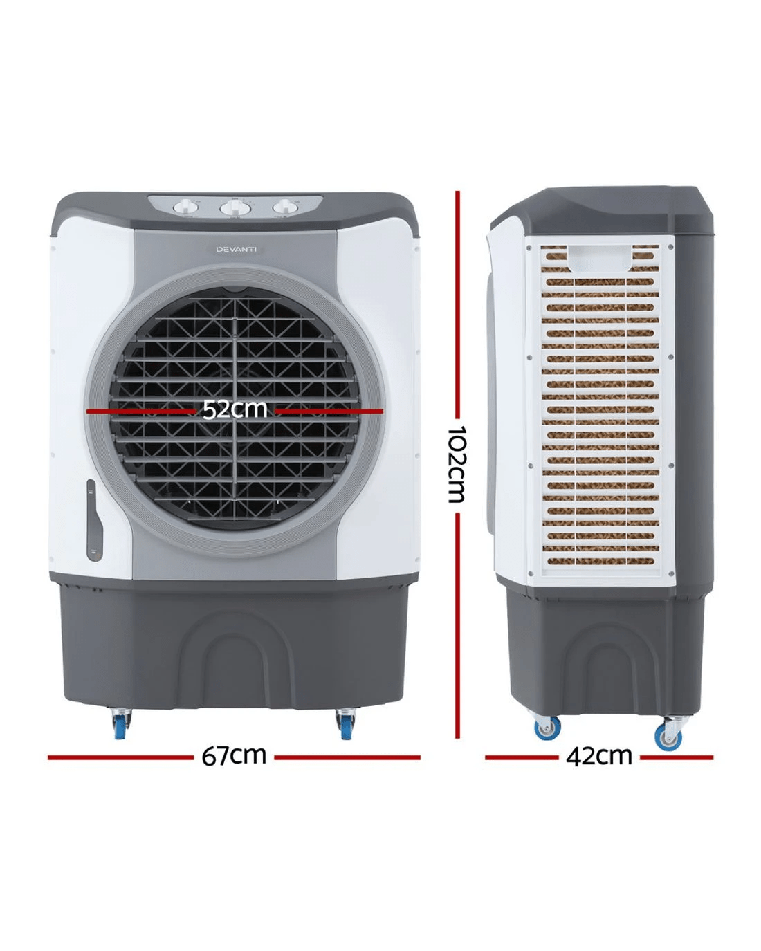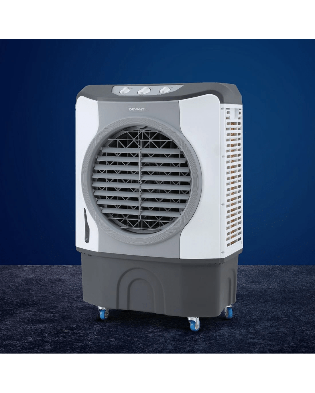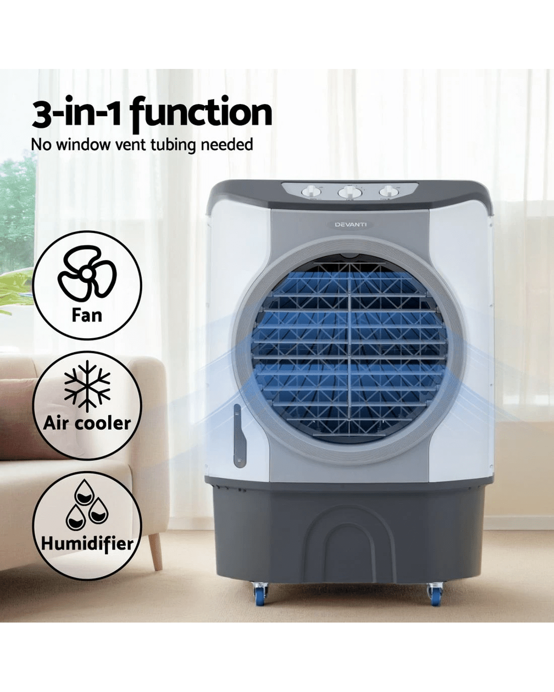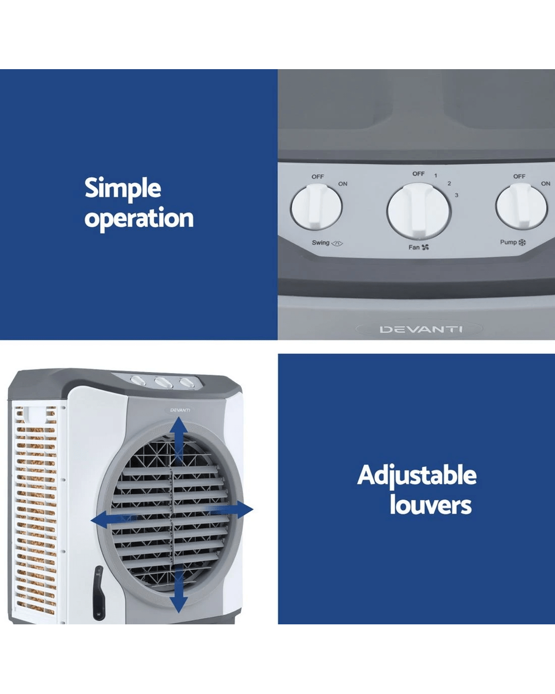 Discover cooling comfort with our Devanti evaporative air cooler. Enjoy 3-in-1 functionality (cooler, humidifier, purifier), easy tap water filling, adjustable louvers, honeycomb cooling pad, and energy-saving efficiency. Ideal for refreshing any space with ease.