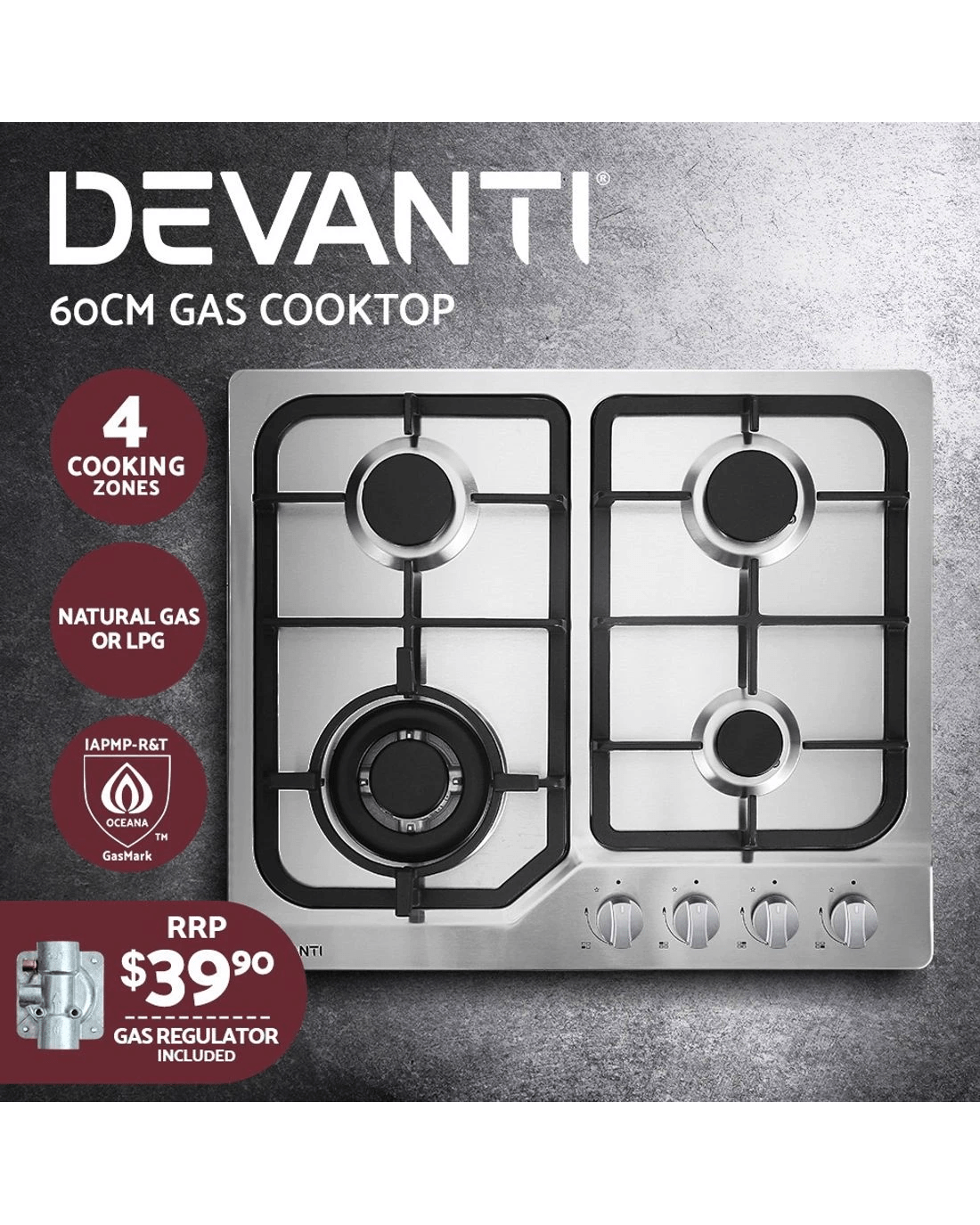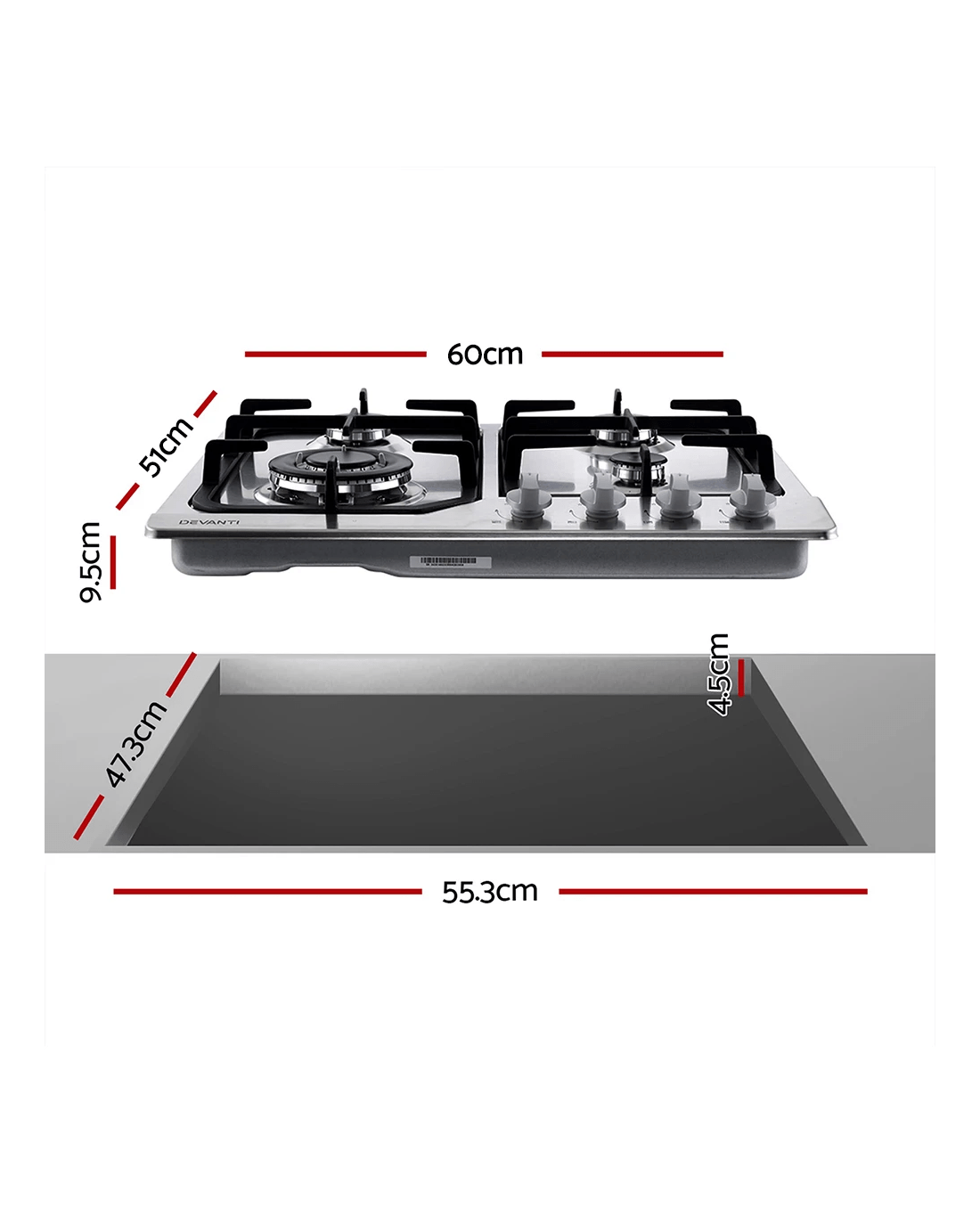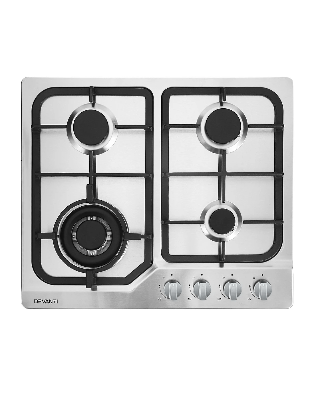 Whether it is for your existing or new home, our Devanti 60cm Gas Cooktop is just the right thing you need for easy, no-fuss cooking. Loaded with an extensive list of chef-friendly features such as an easy ignition system, easy-to-use powder-coated knob controls with safety lock and a flame failure safety device, the cooktop is also incredibly sleek with its stainless steel surface. It features four burners including two semi-rapid burners, one wok burner and one auxiliary burner, all with various power levels to choose from to prepare that perfect dish. The solid cast iron grates hold up your pots and pans perfectly steady and are longlasting and heat-resistant as well. And a pan support is included for use with the auxiliary burner to prevent tiny pans from tipping over and messing up your cooktop. The cooktop is factory set for natural gas but is compatible with LPG once the included LPG conversion kit is installed. Powerful and yet integrally safe, the cooktop promises many moments of hassle-free delicious cooking with the right blend of sophistication and class for your kitchen.