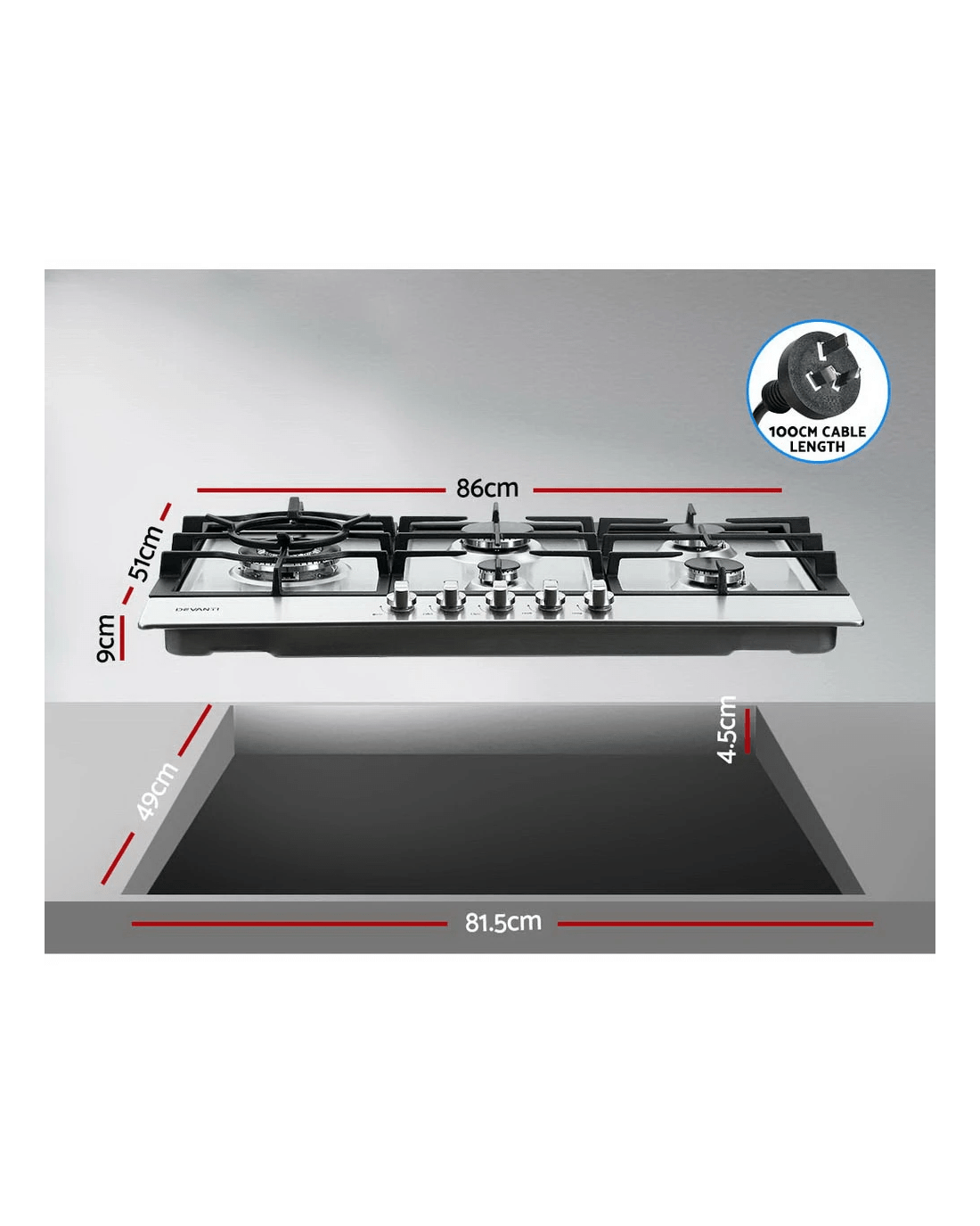Whether it is for your existing or new home, our Devanti 90cm Gas Cooktop is just the right thing you need for easy, no-fuss cooking. Loaded with an extensive list of chef-friendly features such as an easy ignition system, easy-to-use galvanized knob controls with safety lock and a flame failure safety device, the cooktop is also incredibly sleek with its stainless steel surface. It features five burners including two semi-rapid burners, one rapid burner, one wok burner and one auxiliary burner, all with various power levels to choose from to prepare that perfect dish. The solid cast iron grates hold up your pots and pans perfectly steady and are longlasting and heat-resistant as well. And a pan support is included for use with the auxiliary burner to prevent tiny pans from tipping over and messing up your cooktop. The cooktop is factory set for natural gas but is compatible with LPG once the included LPG conversion kit is installed. Powerful and yet integrally safe, the cooktop promises many moments of hassle-free delicious cooking with the right blend of sophistication and class for your kitchen.