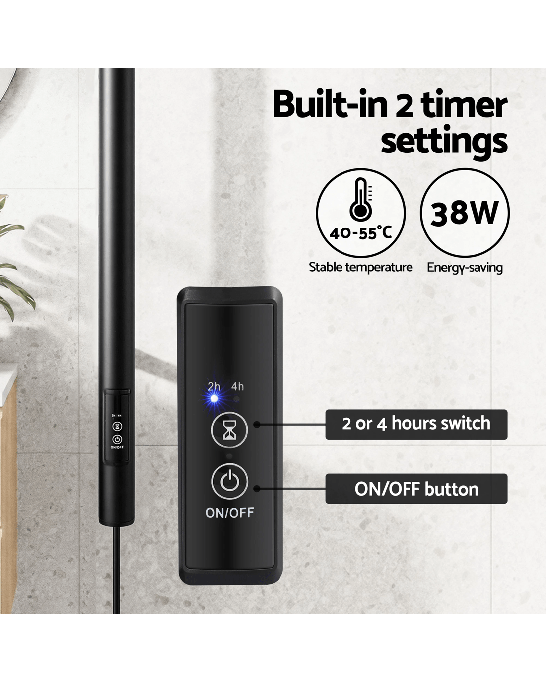 Enjoy warm, dry towels year-round with the Devanti Heated Towel Rail. This sleek, single-bar towel warmer features a built-in timer and constant 40-55°C heat. Made from IPX4 waterproof steel, this electric towel rail is a low-power, 38W space-saving luxury for any modern bathroom.