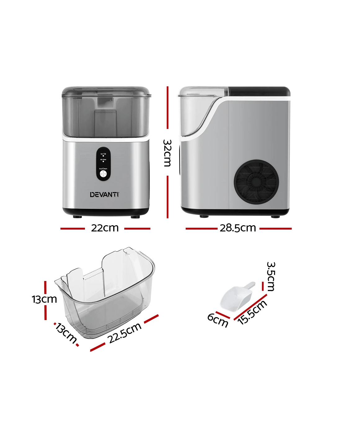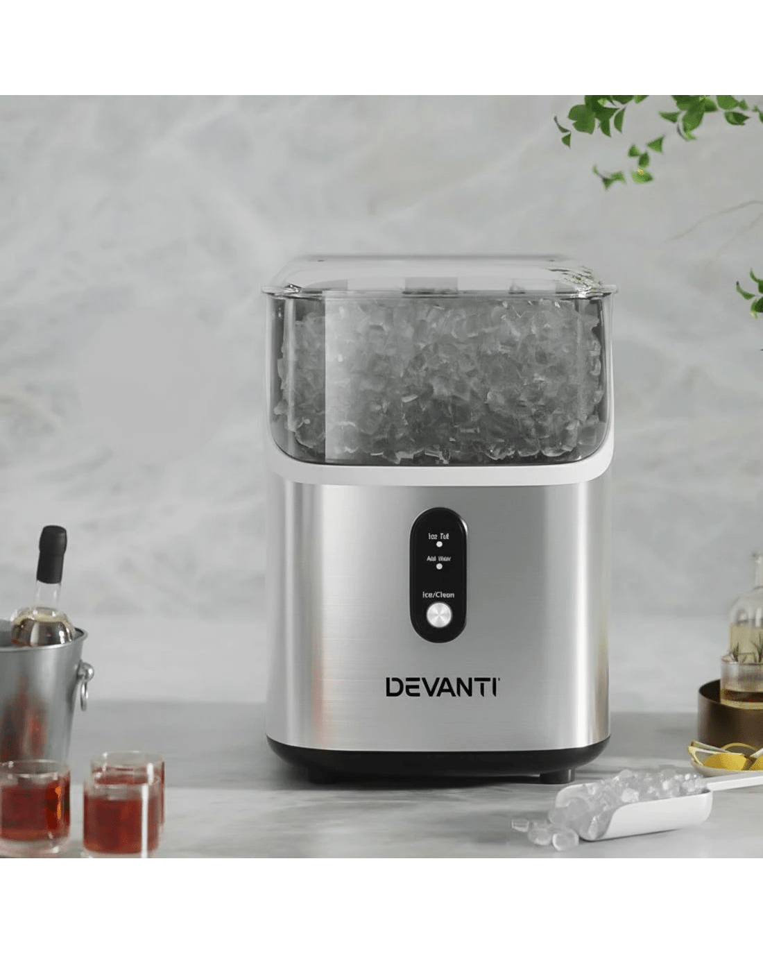 Looking for ice in a hurry? Meet our Devanti Ice Maker! Quickly produce nugget-shaped ice in 5-10 minutes. It is loaded with smart features like water shortage and ice full alarms, plus energy-saving technology through Freon-free refrigerant and enhanced heat dissipation. Its sleek, compact design fits anywhere, and with its easy-to-use controls, you'll be enjoying cold beverages in no time. Ice at home has never been cooler!