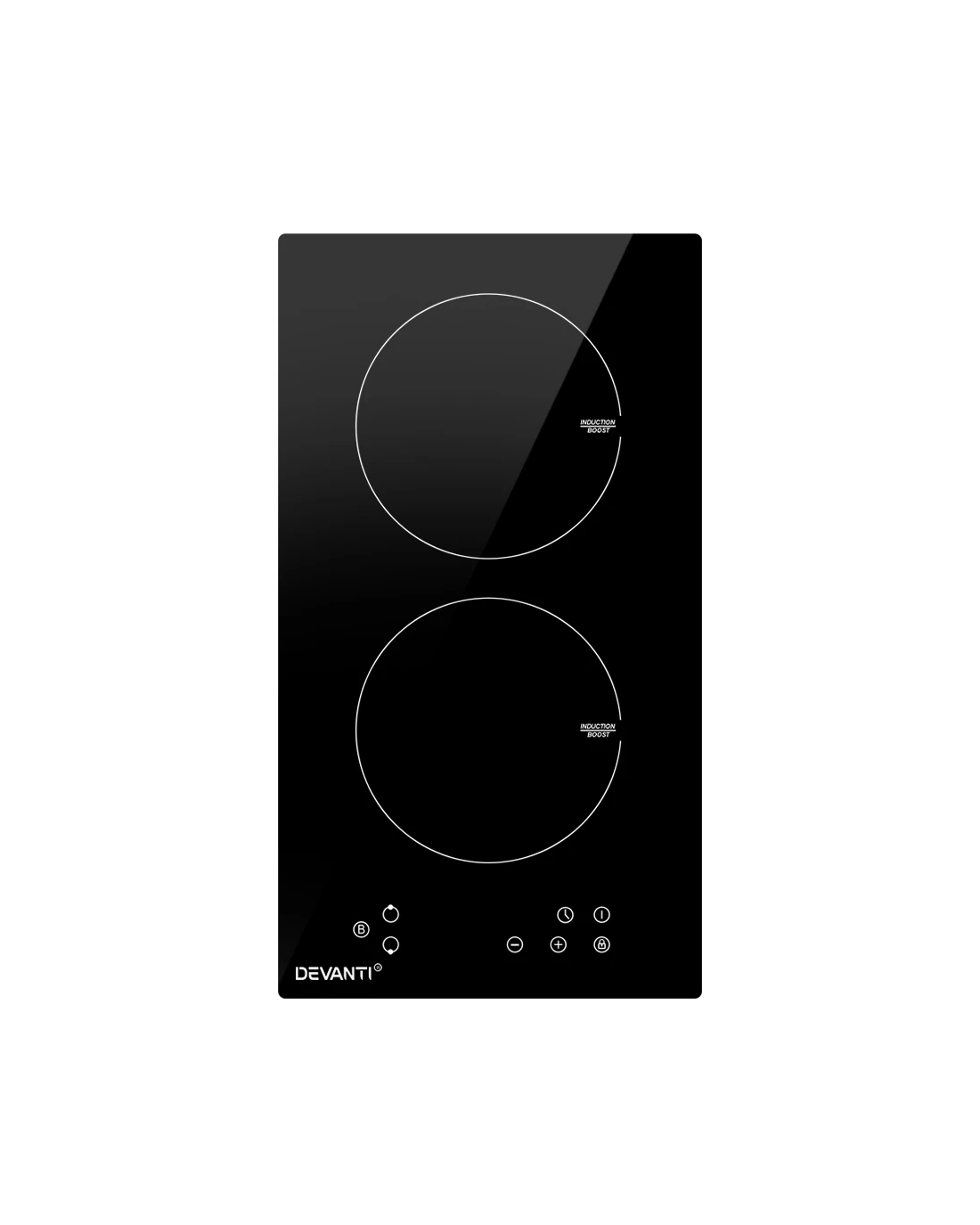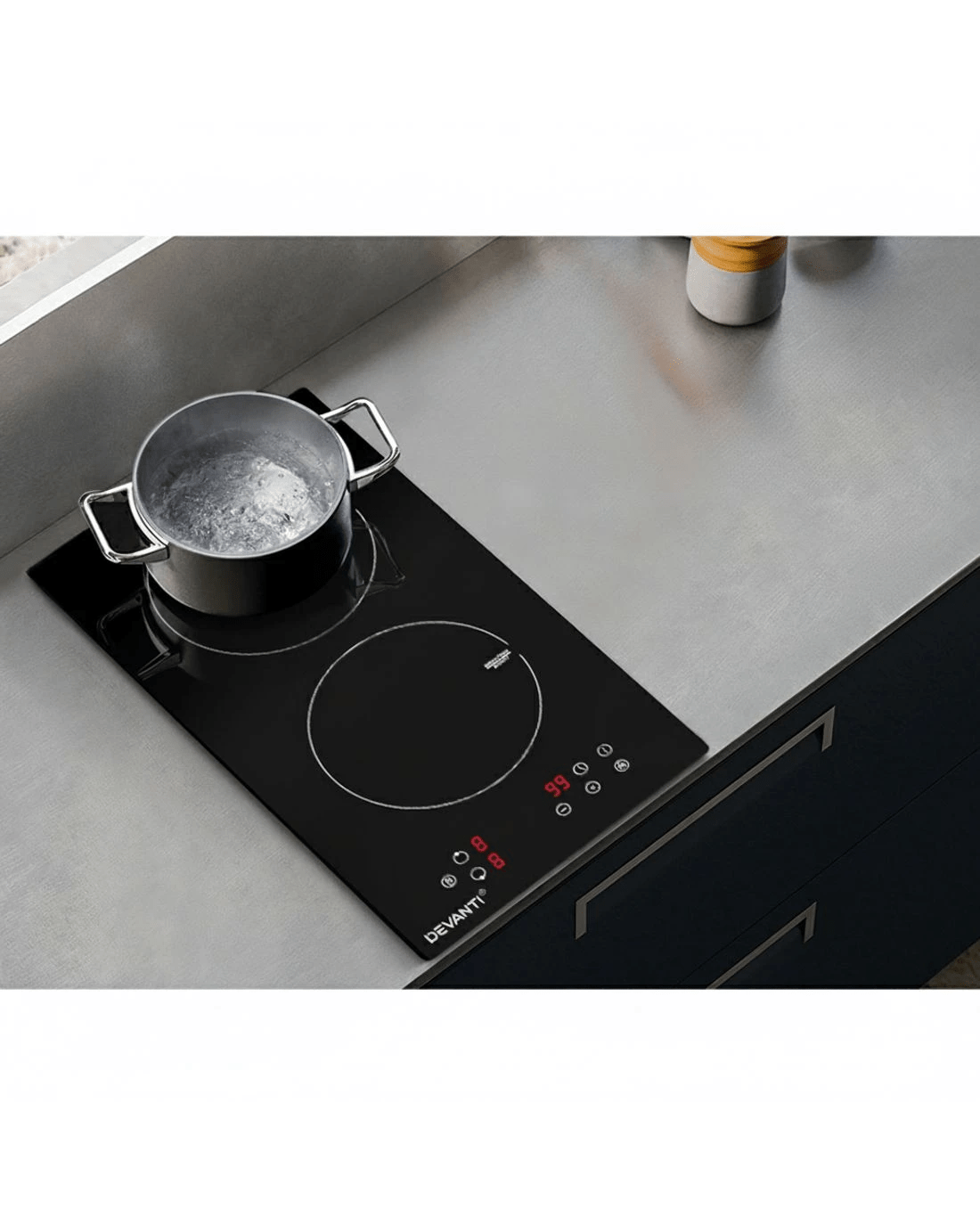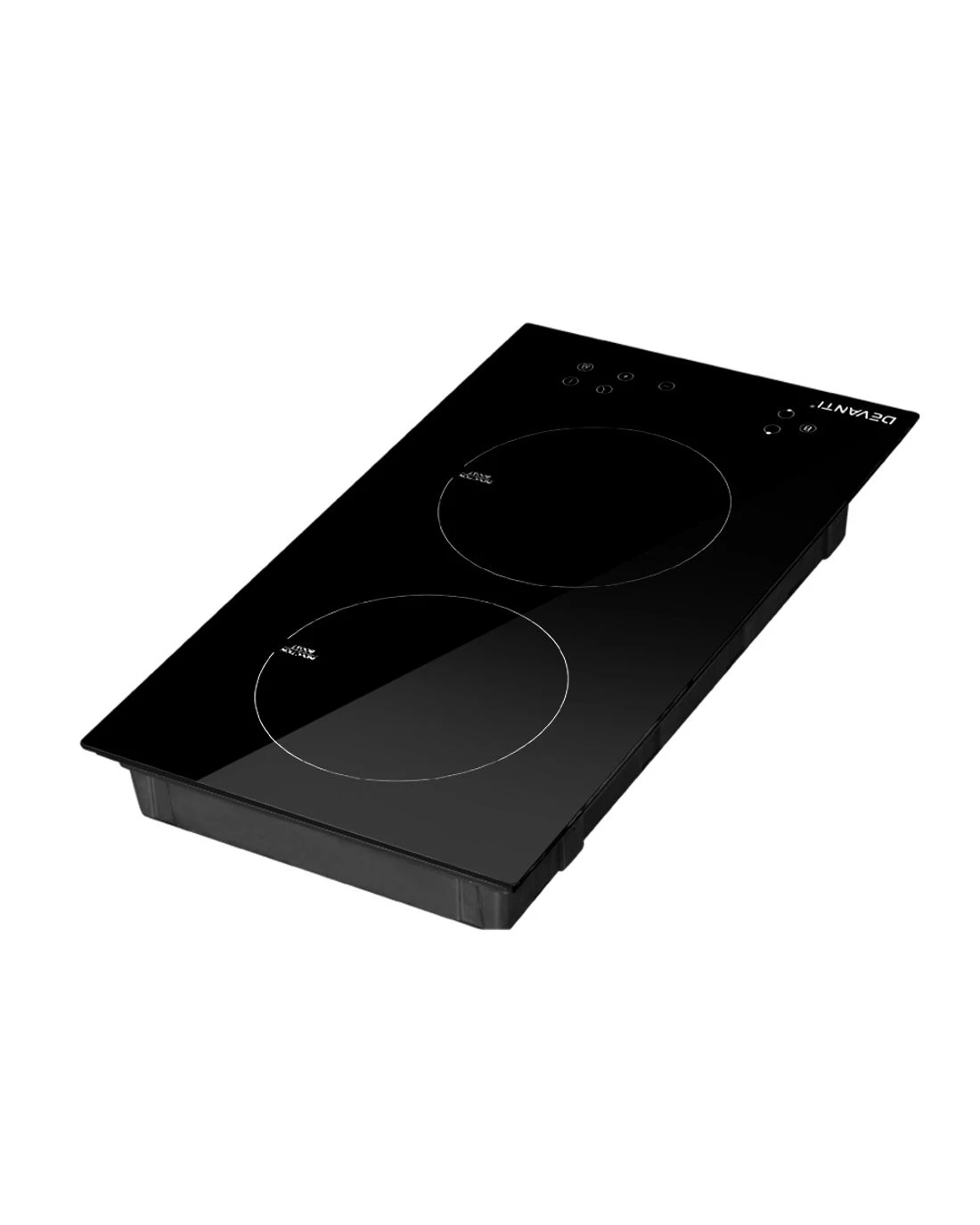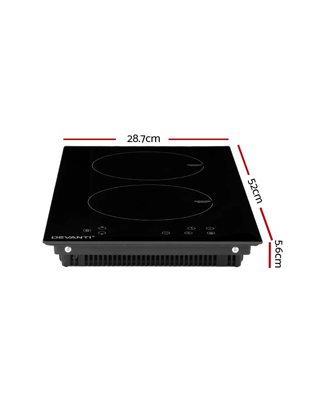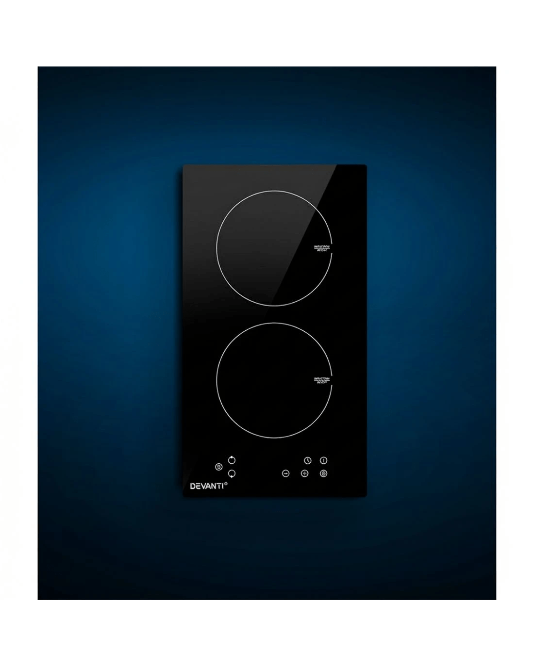 Whether it is for your existing or new home, the Devanti 30cm Induction Cooktop is just the thing you need for easy, no-fuss cooking. The cooktop is loaded with an extensive list of chef-friendly features such as two high-wattage cooking zones, touch controls, an LED display panel, independent 99-min timers, overheat protection and efficient heat dissipation. It is also incredibly sleek with its high-grade black ceramic glass plate. It features nine power levels to choose from to prepare that perfect dish. Plus, the residual heat indicator also helps to tell when it is safe to touch the cooktop after turning the hot plates off, and a child safety lock prevents accidental use. Better still, the cooktop will turn itself off when temperatures get excessively high, or you simply forget to turn it off after your cooking. Powerful and yet integrally safe, the cooktop promises many moments of hassle-free delicious cooking with the right blend of sophistication and class for your kitchen.