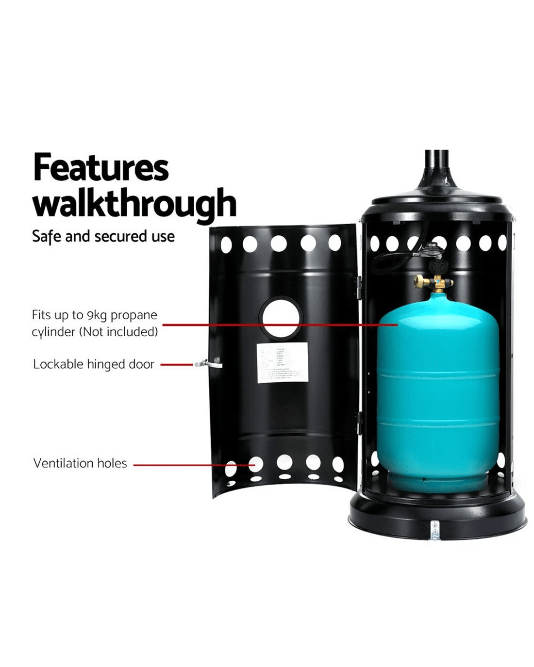 Safety wise, the Devanti Gas Patio Heater ensures that every part of it can be operated with total peace of mind. A 9kg gas cylinder is safely and securely stowed inside the stainless steel base with securing belts. Other great features include easy access to the on/off valve, lockable hinge door, flame guard, automatic gas cut-off when tipped over and many more. And the entire ensemble comes with built-in wheels for easy portability.