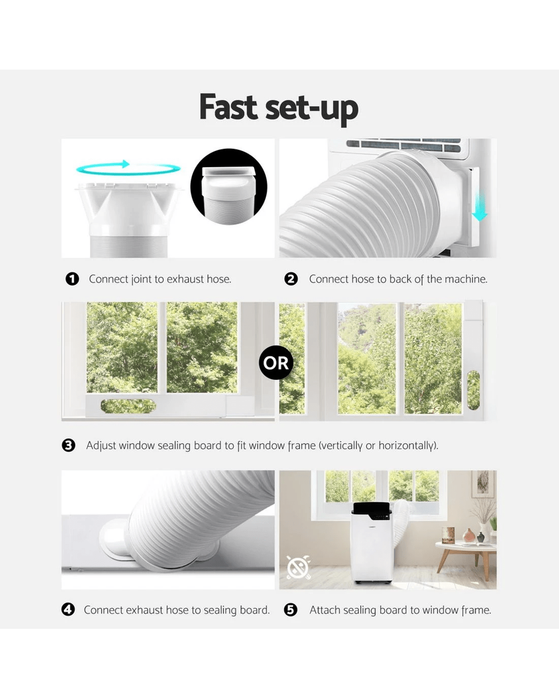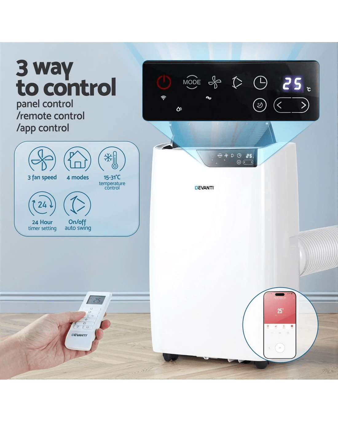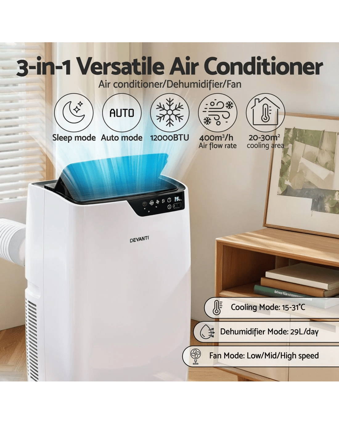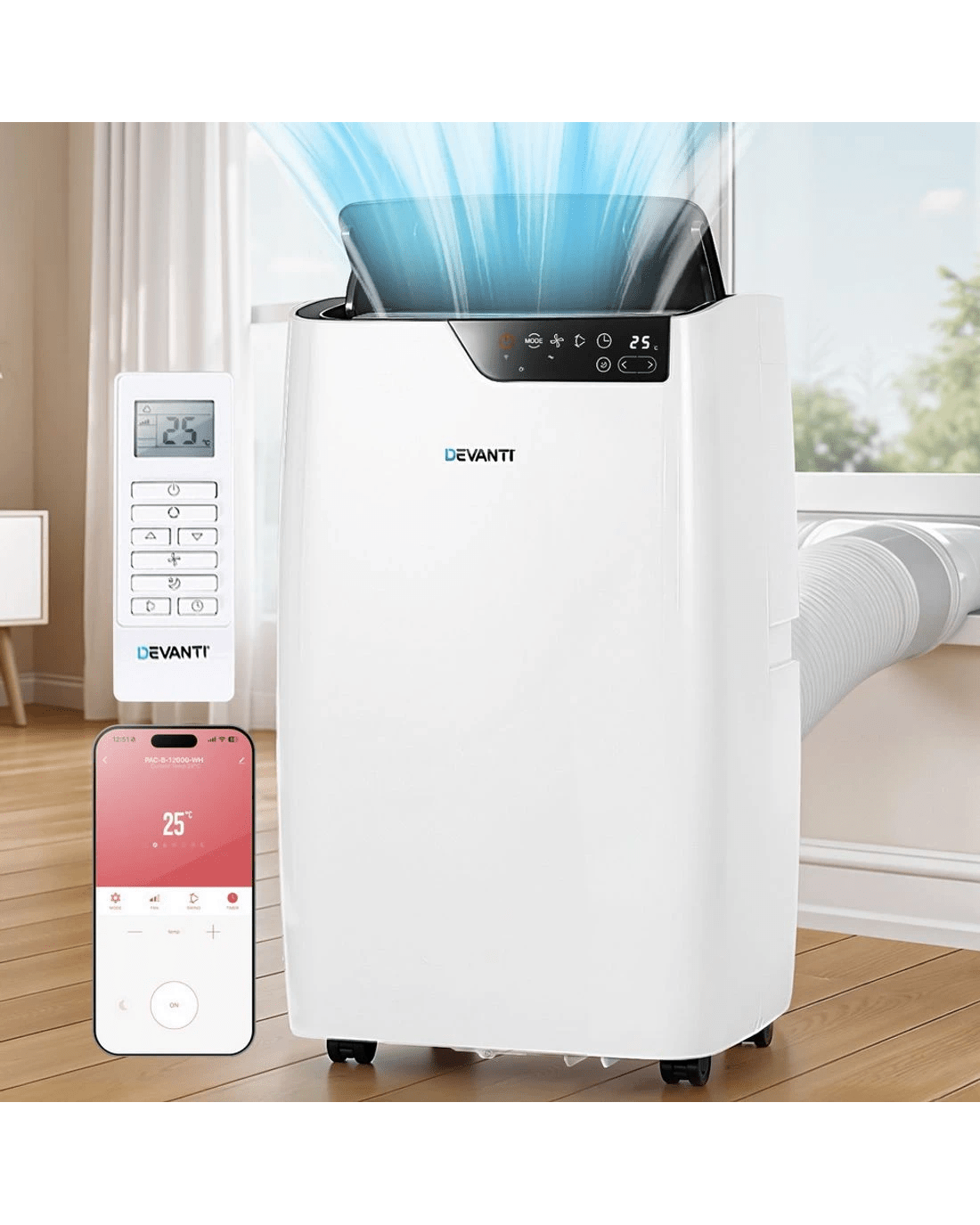 Experience versatile climate control with the Devanti 12000 BTU Portable Air Conditioner. This 3-in-1 unit cools, dehumidifies, and circulates air efficiently. Enjoy smart features like WiFi app control, remote operation, and sensor touch panel. The quiet smart sleep mode ensures restful nights, while the swing function evenly distributes airflow. Easily move it with built-in handles and castors. Includes window exhaust kit for simple setup and removable filter for maintenance. Great for hot summer days!