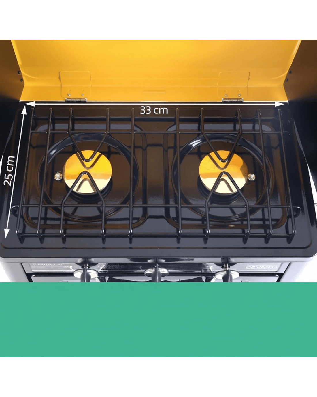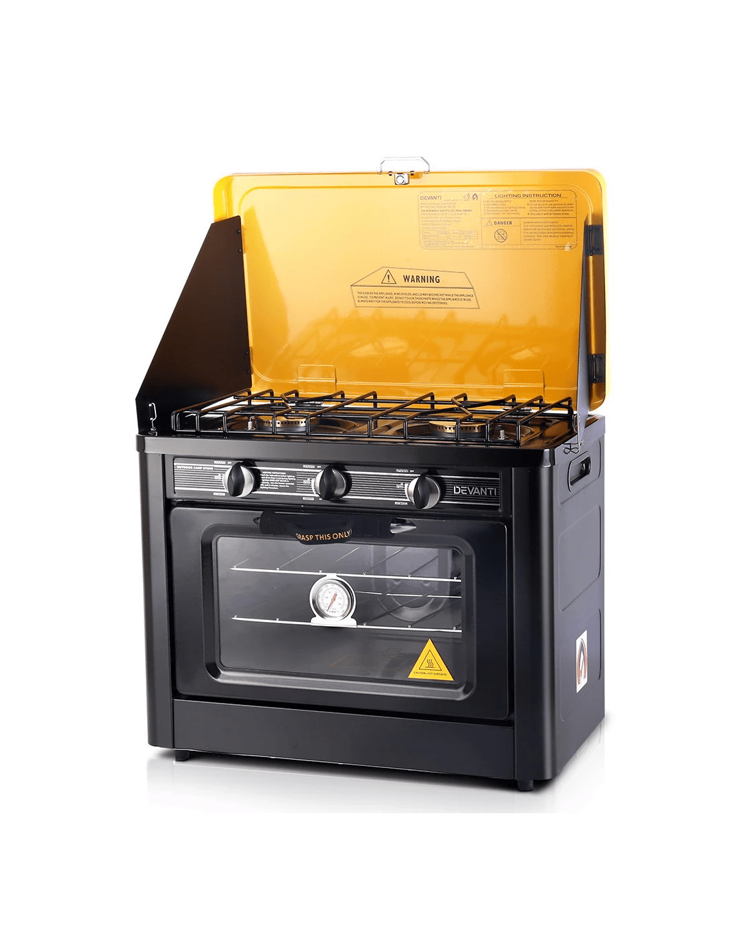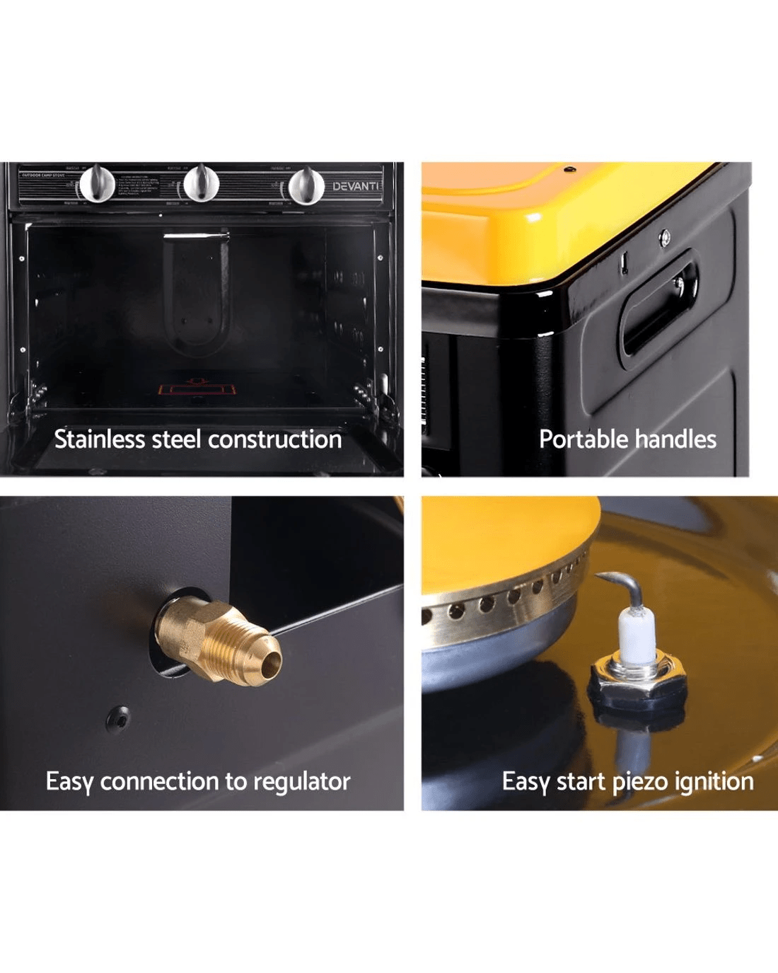 The unit has all the thoughtful and safety features that you'll come to expect from a quality product. Insulated cloth sleeve design, push-in piezo burner ignition, flame-out protection, built-in oven heat gauge, non-stick enamel cooking surface, a three-sided windscreen provided by the folding lid and side arms, fully-adjustable heat-control dials and many more great features. With its corrosion-proof and longlasting stainless steel construction, the Devanti Portable Gas Stove and Oven opens a host of cooking possibilities anywhere and anytime.