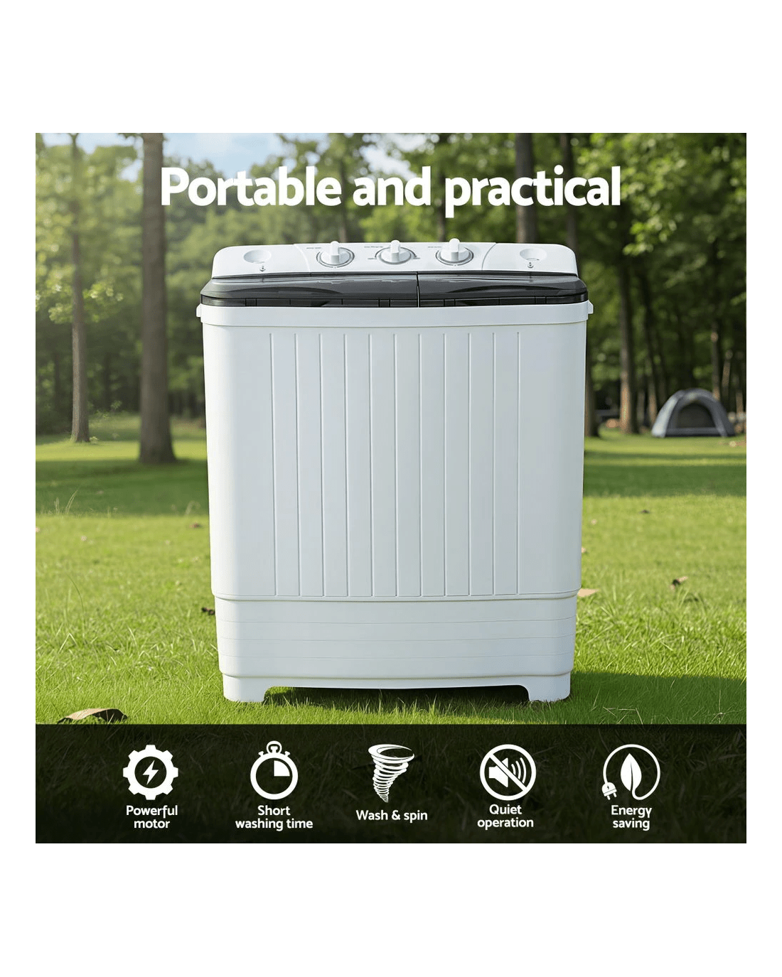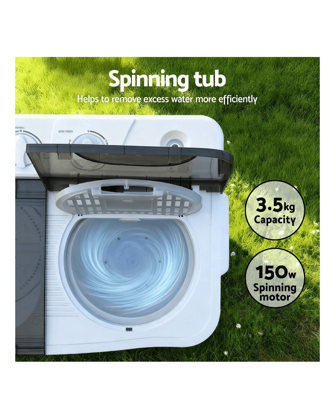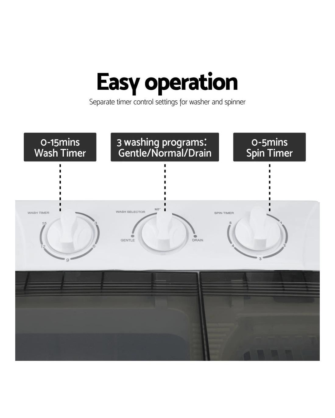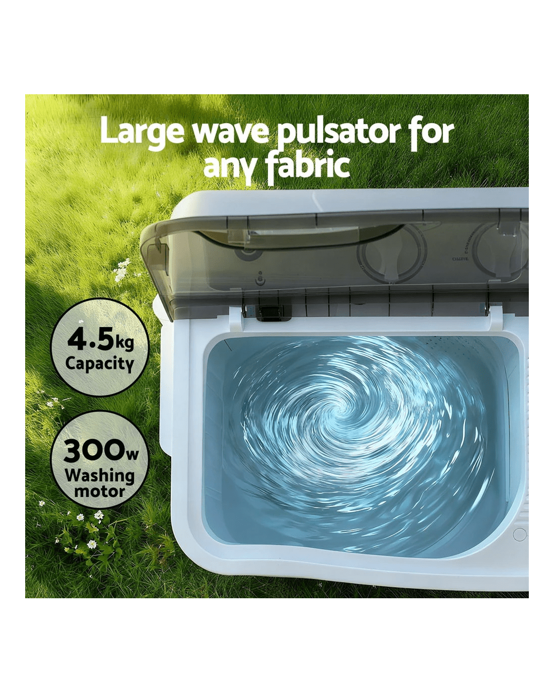 Unleash the power of convenience with our Devanti Portable Twin Tub Washing Machine. Designed for efficiency and ease of use, it features a generous 4.5kg washing capacity and 3kg spinning capacity—perfect for handling daily laundry in a single go. Its twin tub design allows you to wash and spin simultaneously, saving you valuable time and effort. With its powerful dual motor system, this machine boasts 300W washing power and 150W spinning power. The intuitive three-knob control panel with Gentle/Normal/Drain modes ensures simple operation for everyone, even the elderly. Separate timers for washing (up to 15 minutes) and spinning (up to 5 minutes) give you complete control over your laundry cycle. Its compact, lightweight, and no-installation design makes it ideal for small spaces, offering a convenient, space-saving solution to your laundry needs. No installation is required—just plug it in and get started.
