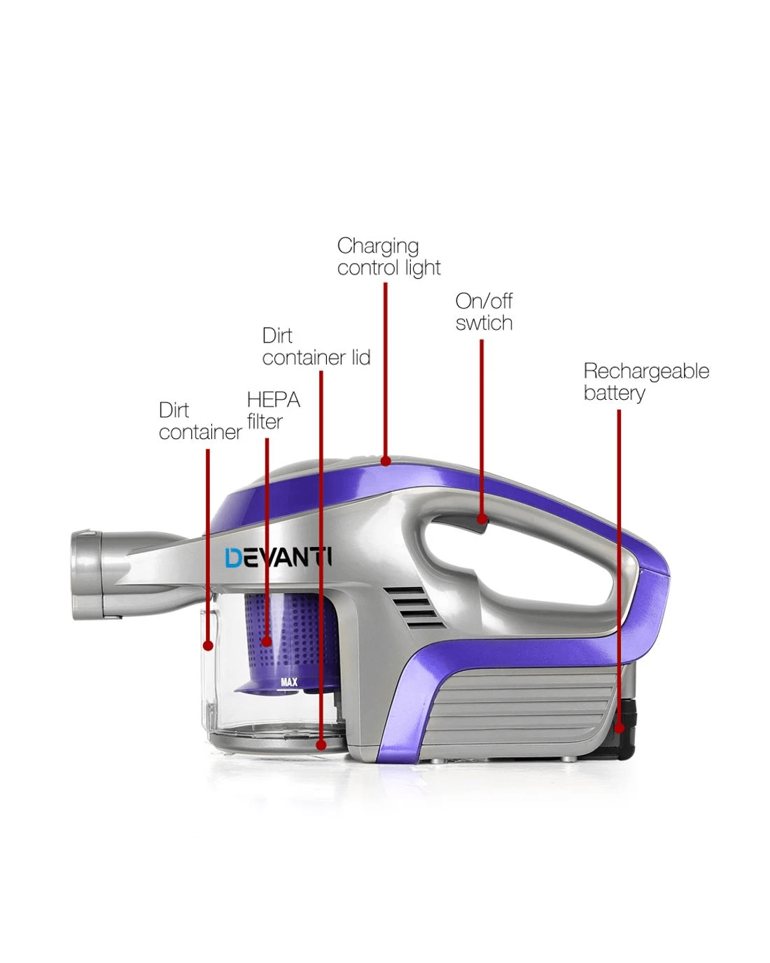 Sold by Aisle SixDevanti Stick Vacuum Cleaner Bagless Cordless 150W Purple - Purple