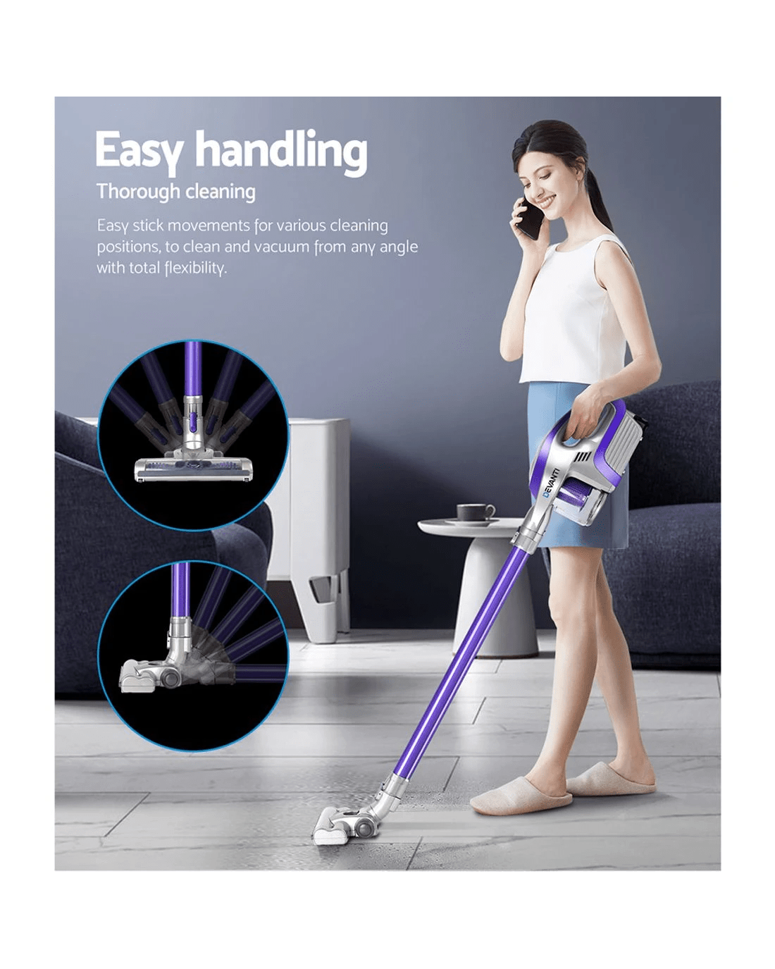 The Devanti Handstick Vacuum works as a normal stick vacuum and, with just a removal of the stick, instantly becomes a handstick vacuum. Its powerful 150W 30000rpm motorized head has a steady suction power of up to 8000Pa. And a 160° swivelling head that can be fitted with optional brushes and nozzles for different types of surface and zone cleaning also allows it to pick up dirt, debris and anything in its path easily. That makes the Devanti Cordless Stick Vacuum ideal for cleaning carpets, curtains, shelves, soft furnishings, vehicle interiors and delicate objects as well as vacuuming ceiling, corners, niches and gaps.