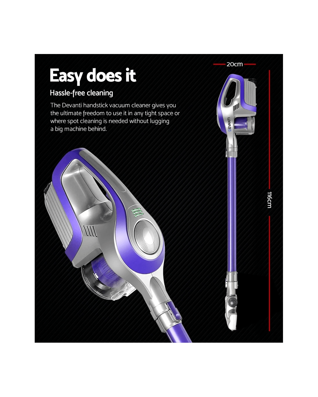 This is certainly the ultimate in easy cleaning and vacuuming. Our Devanti Handstick Vacuum gives you the freedom to use it in any tight space or where spot cleaning needs to be done without lugging a big machine behind.