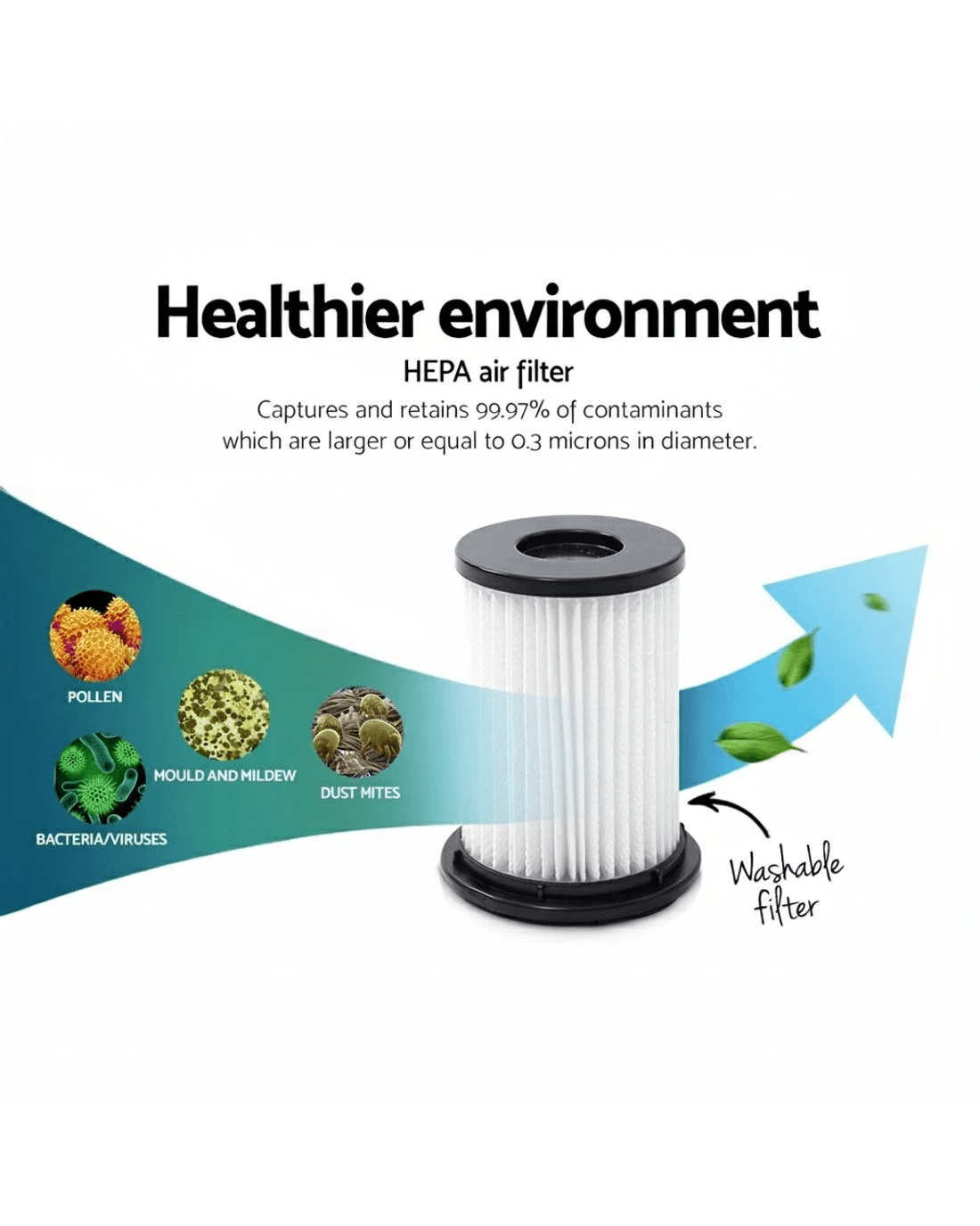 The Devanti Handstick Vacuum works as a normal stick vacuum and, with just a removal of the stick, instantly becomes a handstick vacuum. Its powerful 150W 30000rpm motorized head has a steady suction power of up to 8000Pa. And a 160° swivelling head that can be fitted with optional brushes and nozzles for different types of surface and zone cleaning also allows it to pick up dirt, debris and anything in its path easily. The one-handed design is lightweight and bagless. All collected dirt and debris pass through a washable and reusable HEPA filter that eliminates up to 99.97% of dust and allergens. Not least, the rechargeable 2000mAH lithium-ion battery can run continuously up to 35 minutes on a full charge.