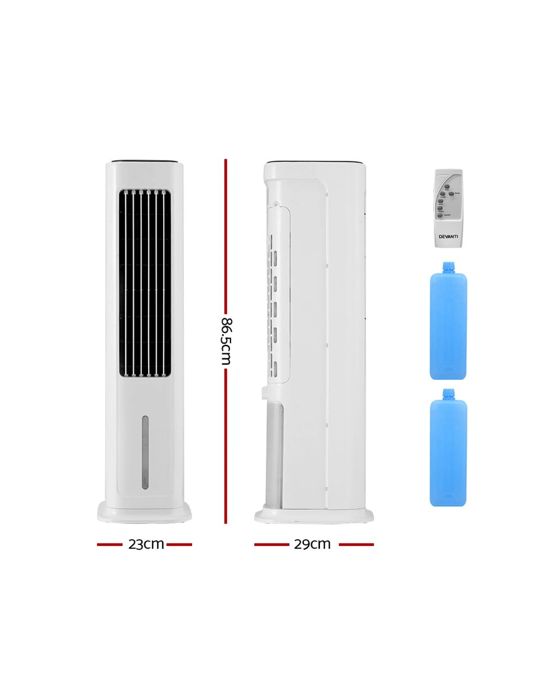 Keeping cool this summer will be a breeze with the new Devanti Evaporative Air Cooler. The device acts as an air cooler, fan, air purifier and humidifier all in one for complete comfort in the home. The space-saving ultra-slim design suits any room in the home. To use it as an air cooler, simply prepare the included ice crystals according to instructions, leave it in the 6L water tank and turn on the evaporative cooler to get super cool breezes throughout the room. 3 speed settings and 3 cooling modes enable you to adjust the temperature to your liking, while the 12-hour timer will automatically cool your home with ease. A swing mode helps to circulate and deliver cool breezes around the home. Control your air cooler from afar with the included smart remote control. The removable dust filter works to effectively eliminate all pollutants such as dust, pollen, cigarette smoke, bacteria, and odours to deliver purified air. Use to humidify the air and reduce dry air symptoms such as an itchy throat, eyes and skin. A visible water level lets you know when the water tank needs to be replenished. Finally, the convenient handle lets your transport the device around the home with ease. Don't let the summer sun melt your fun, get a Devanti Evaporative Air Cooler today.
