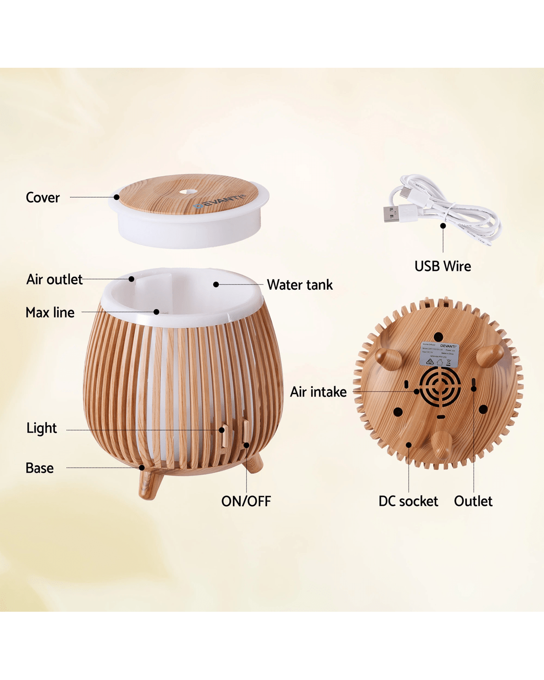 Devanti Ultrasonic Aroma Diffuser Aromatherapy 140ml LED Lights Iron Humidifier Forest - Natural