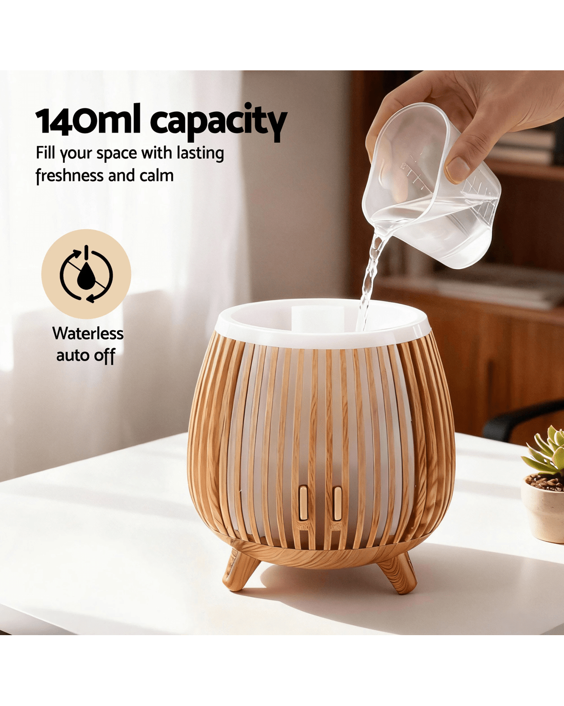 Bring a touch of creativity to your space with this textured aroma diffuser. The 140ml tank offers steady mist with two adjustable modes and a 15s on/off cycle for optimal comfort. Enjoy 7 LED colours with 2 brightness levels to create the perfect ambience day or night. Whisper-quiet operation, waterless auto-off, and low energy consumption make it safe and convenient for daily use. Ideal for bedrooms, living rooms, offices, or as a thoughtful gift.